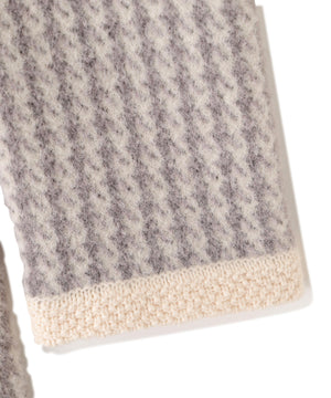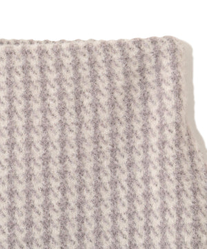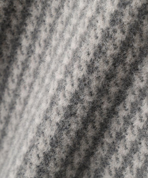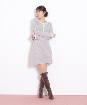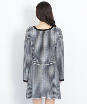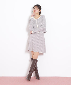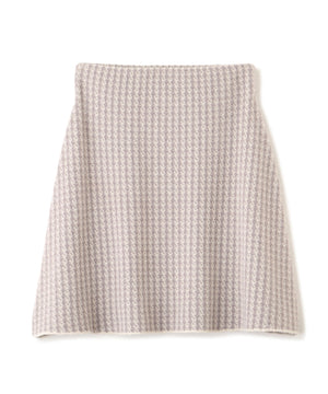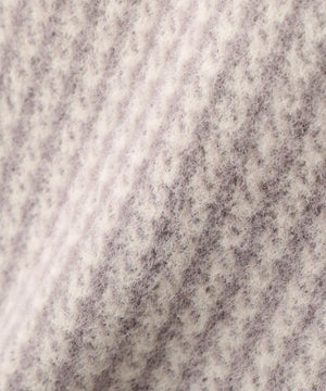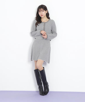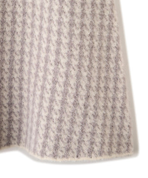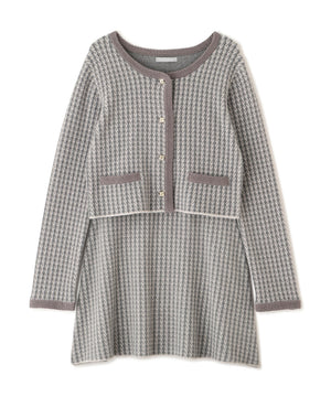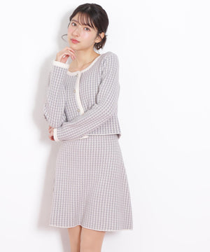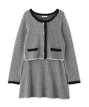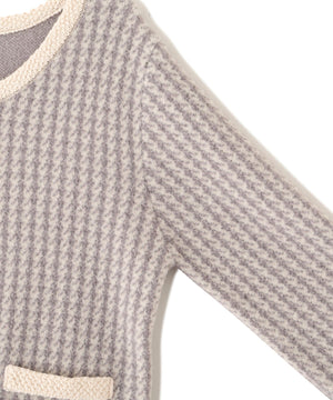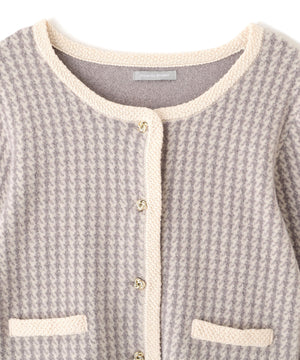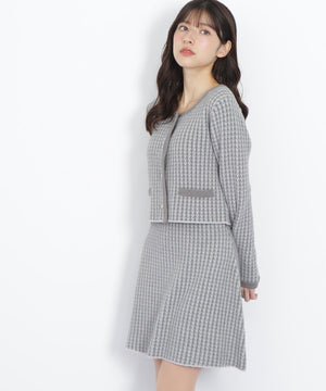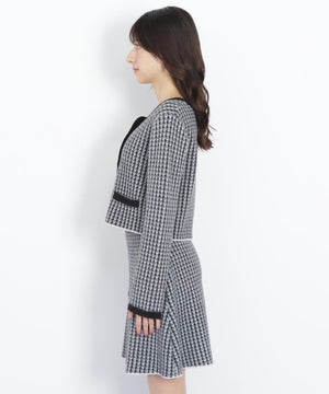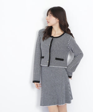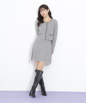 ニットジャケットとフレアミニスカートのお得なセットアップ。毛足の短いミニシャギー糸とストレート糸を引き揃え、3色が混ざった千鳥柄ジャガードの編地を使用しています。すっきりとした糸でブレード風に編み、衿ぐりと前立てをトリミングしたデザインです。トップスはねじったような金色ボタンがポイント。このSETでコーディネートが完成します。※撮影時照明の関係により、色味が違って見える場合がございます。