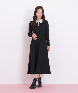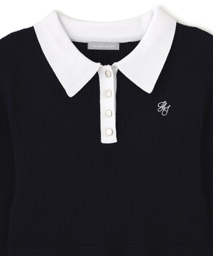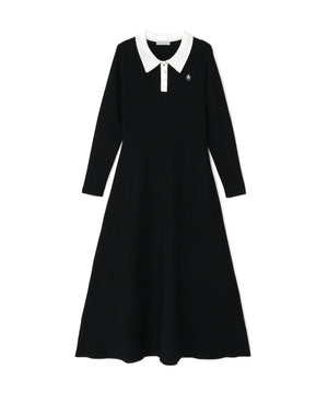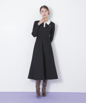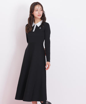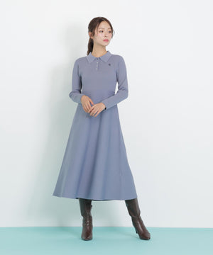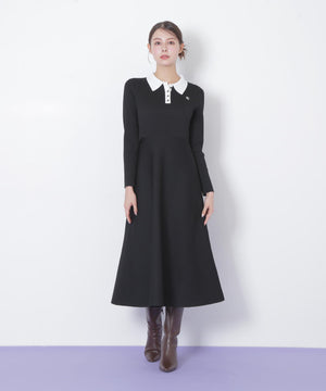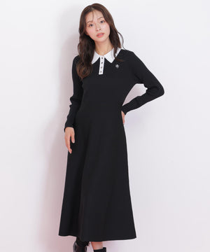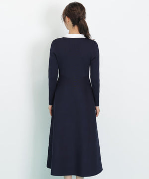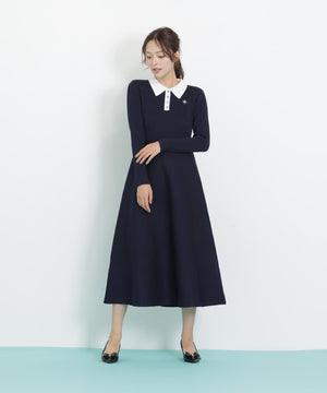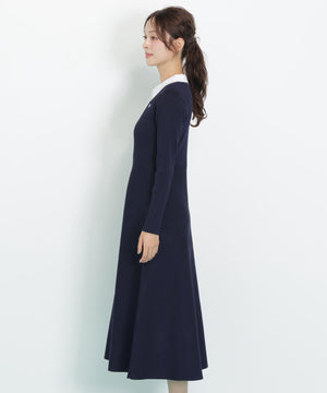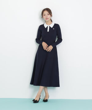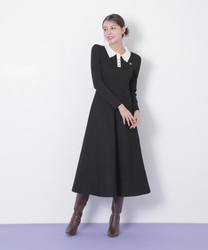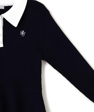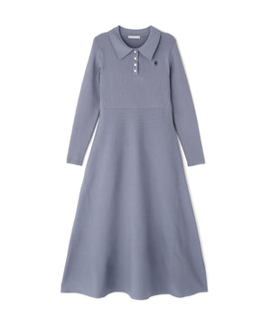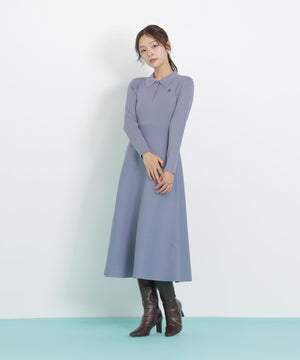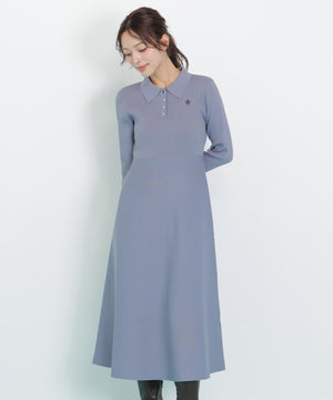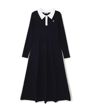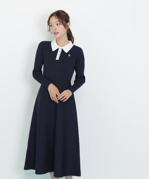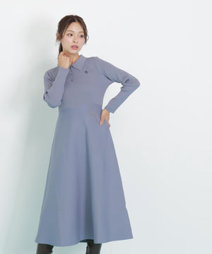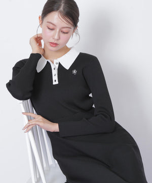 キレイなシルエットを演出してくれる開襟ニットワンピース。エレガントな雰囲気の襟付きデザインと着丈はそのまま、秋冬らしく長袖になって登場!フロントボタンはスクエア型で、第二ボタンまで開けて着ていただくのもオススメ。左胸の配色刺しゅうもポイントです。※撮影時照明の関係により、色味が違って見える場合がございます。