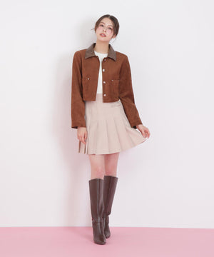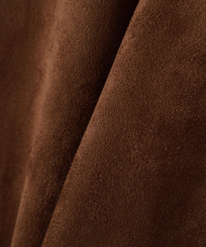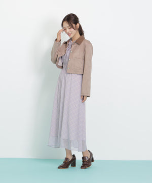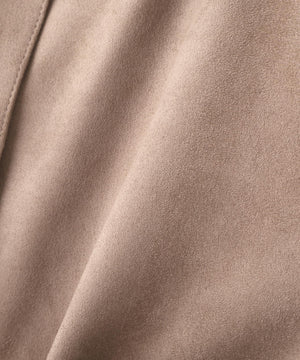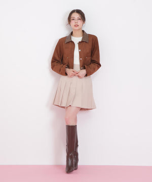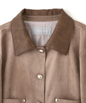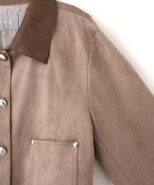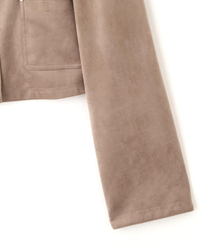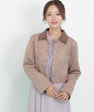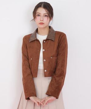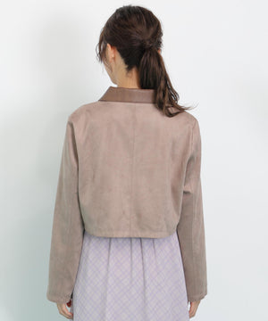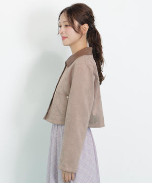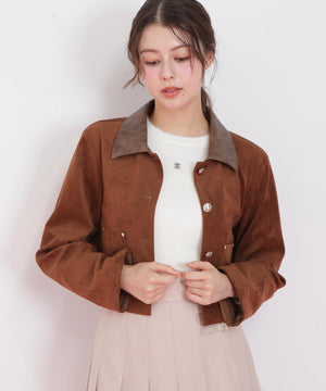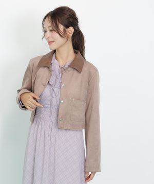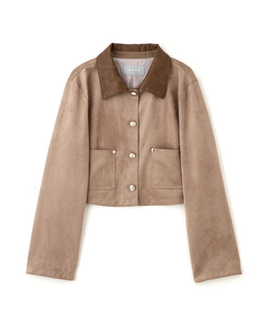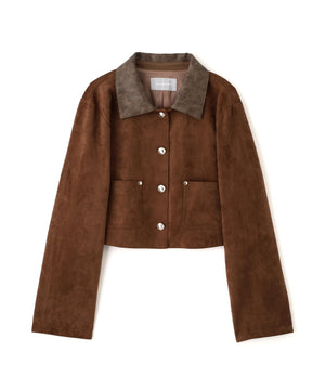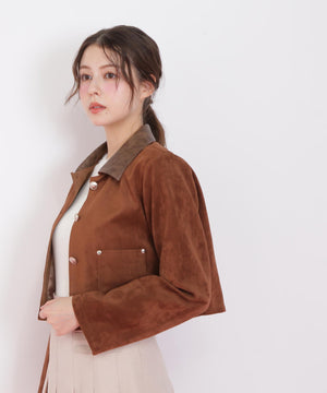 トレンドのフェイクスエード生地を使用した柔らかい着心地のブルゾン。襟はヴィンテージ加工風のフェイクレザーを使用。丈とサイズ感をコンパクトにした、カジュアルすぎないデザインです。ミニスカートやチュールスカート合わせがおすすめ。※撮影時照明の関係により、色味が違って見える場合がございます。