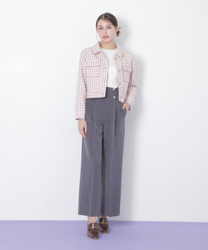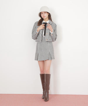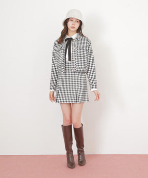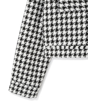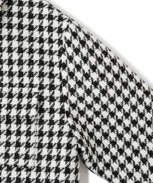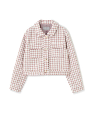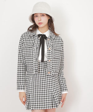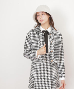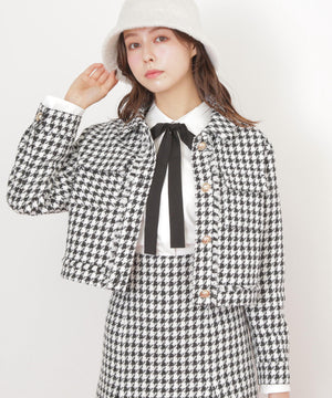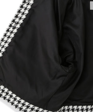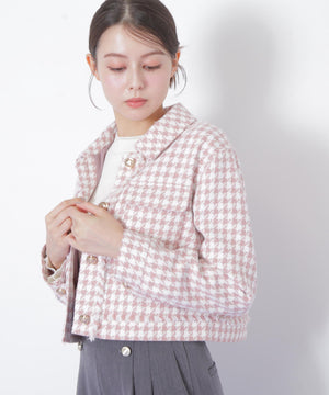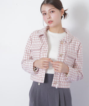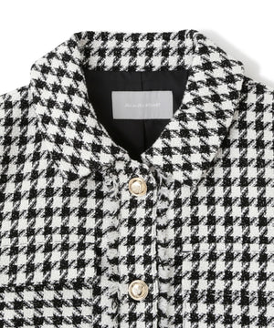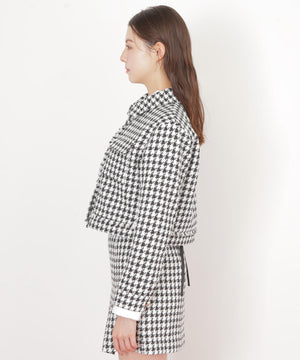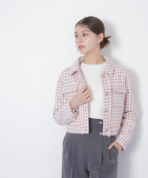 クラシカルな千鳥柄ツイードで仕立てたジャケット。コンパクトなシルエットでスタイルアップ効果を期待できます。ワンピース合わせでお呼ばれスタイルに、デニム合わせでカジュアルMIXスタイルにもおすすめ。オンオフ問わずに着回せる万能アウターです。同素材のミニスカート(店舗商品番号1255220057)もございます。※撮影時照明の関係により、色味が違って見える場合がございます。