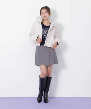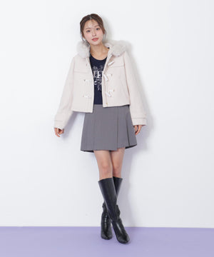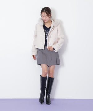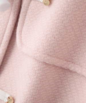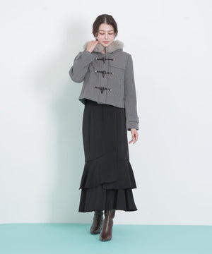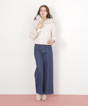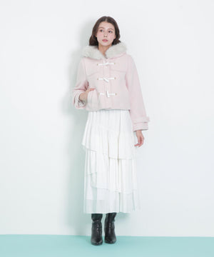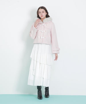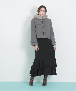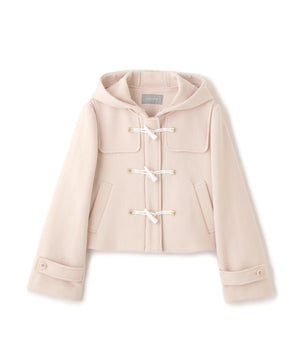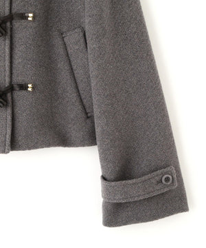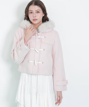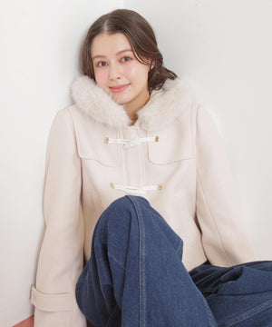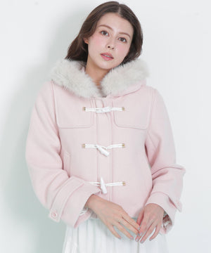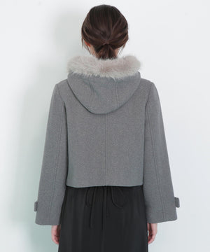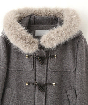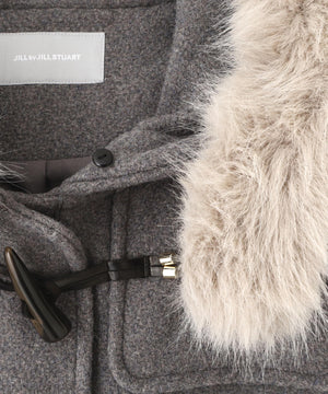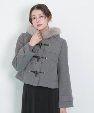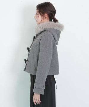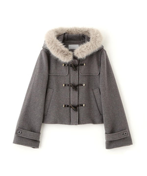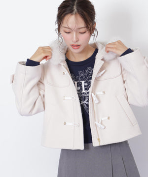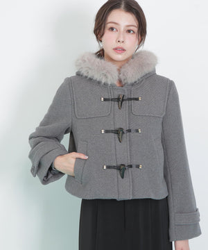 ウール混のひし形の目の織り柄が立ったショートダッフルコート。フードまわりにあしらったボリュームのあるフェイクファーで、小顔効果を期待できます。トグルバックルの合皮先にはライトゴールドカラーの留め具をつけて品の良さを演出。コンパクトな短丈なのでカジュアルすぎないデザインです。フードまわりのフェイクファーは取り外し出来ます。※撮影時照明の関係により、色味が違って見える場合がございます。
