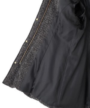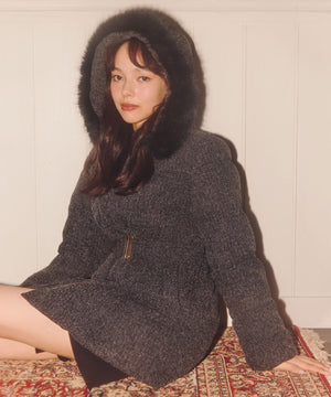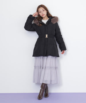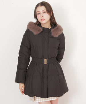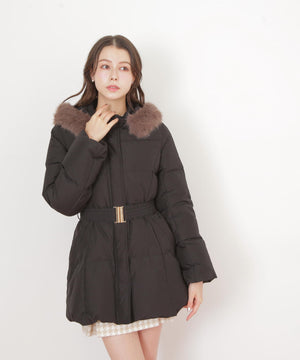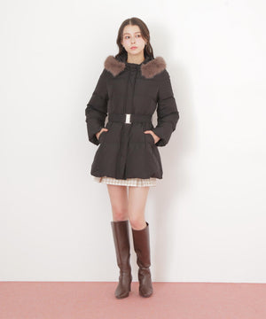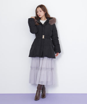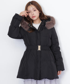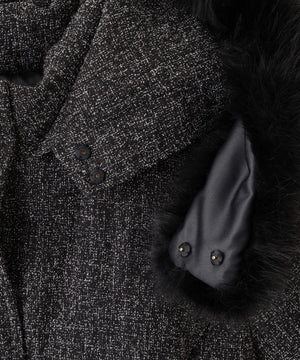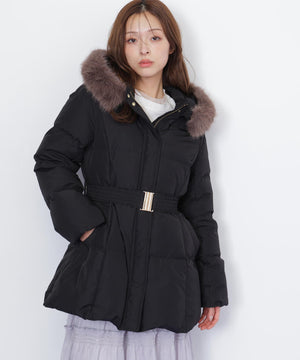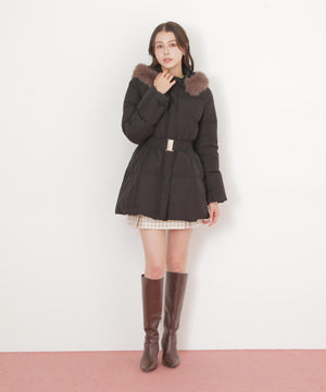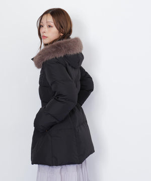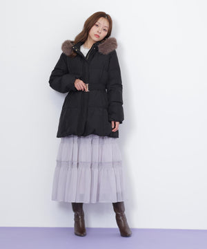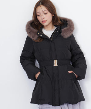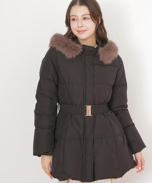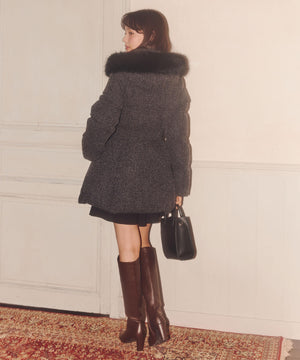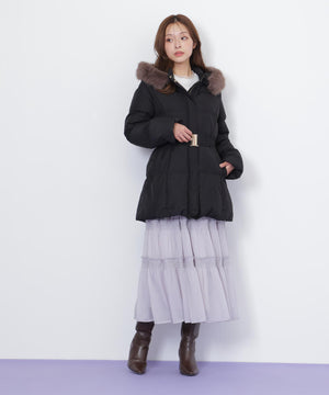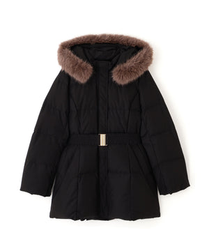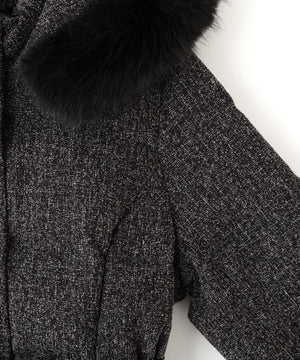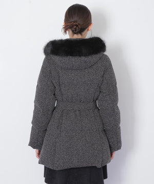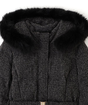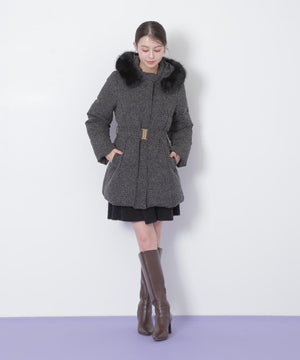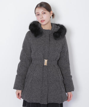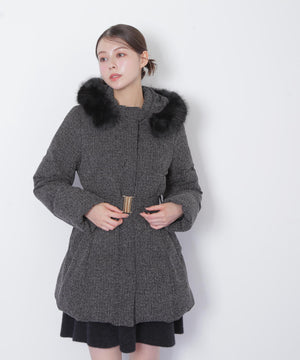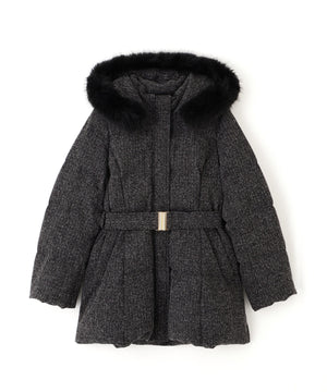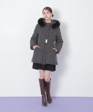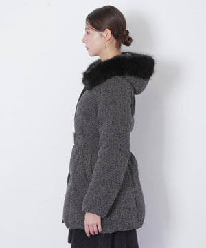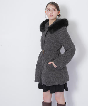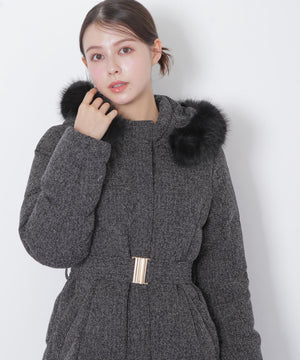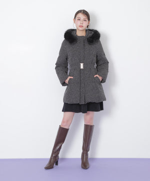 ウエストマークでスタイルアップして見える上品なダウンコート。ダウンフェザーでしっかりと防寒をしながら着ぶくれせずに着用できるシルエットです。フードにはボリュームのあるフェイクファーを使用して、顔まわりを華やかに演出。体に程よく沿うシルエットに付属のベルトを締めると、ウエストまわりをすっきり見せてくれます。スタイリングしやすい無地ブラックとツイード素材の2色展開です。※撮影時照明の関係により、色味が違って見える場合がございます。