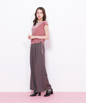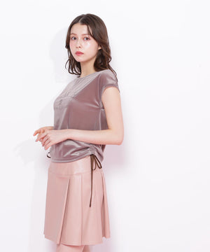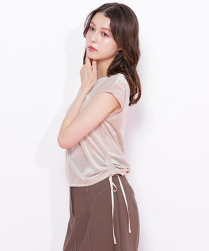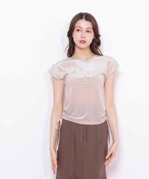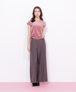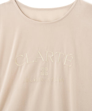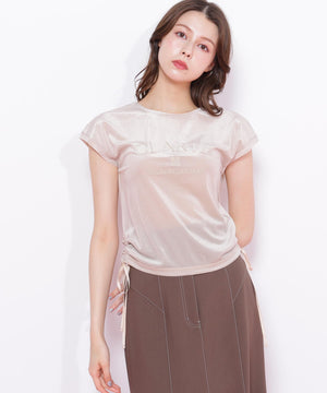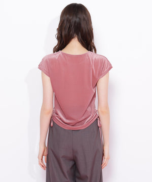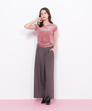 光沢感のあるベロア素材を使い、上品さとトレンド感を叶えるコンパクトTシャツ。フロントには繊細な刺しゅうロゴを入れてワンポイントに。ウエスト両脇に通したリボンで着丈の調整が可能。くしゅっと寄せてショート丈風にも、ナチュラルなストレートラインにもアレンジできます。カジュアルながらフェミニンムード漂うデザインは、デイリーからちょっとしたお出かけにもオススメです。※撮影時照明の関係により、色味が違って見える場合がございます。