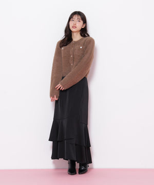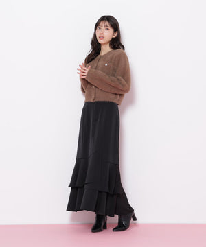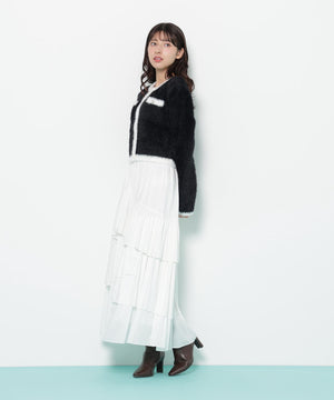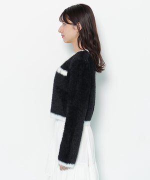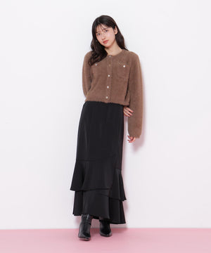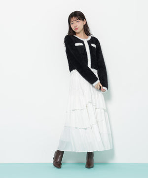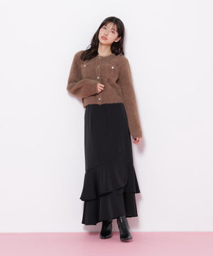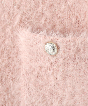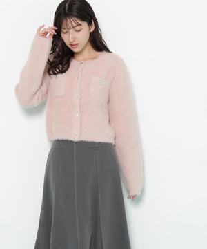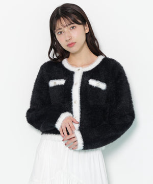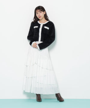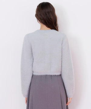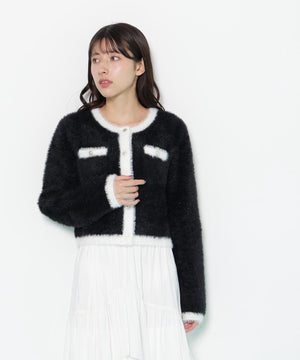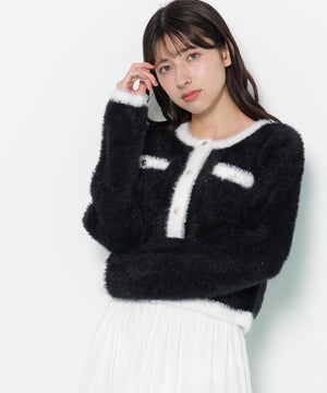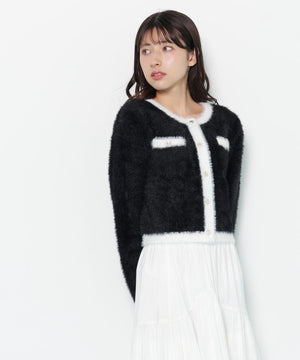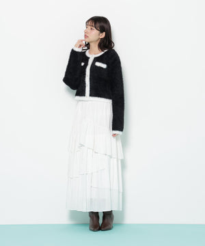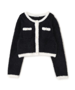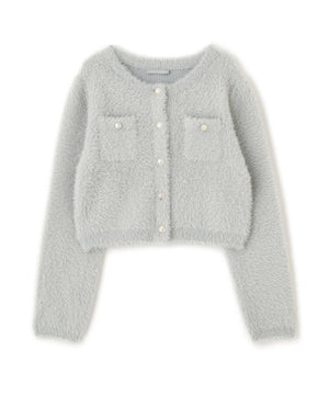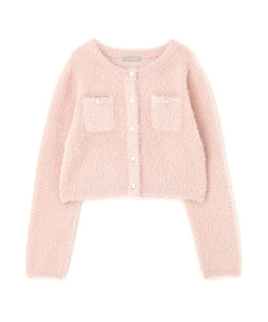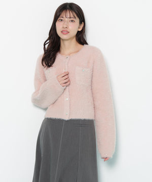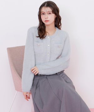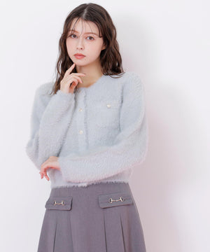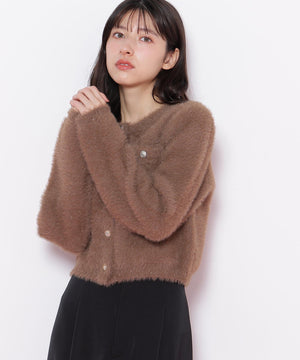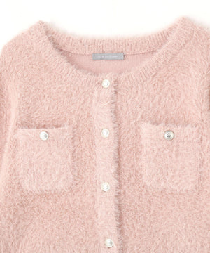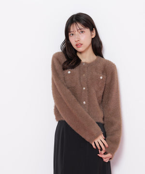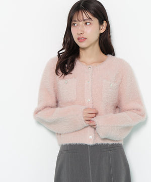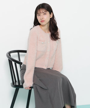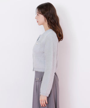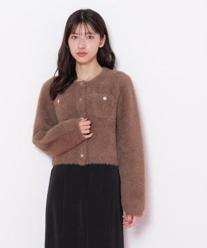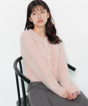 短毛のふわふわシャギー糸と小さなスパンコールとラメ糸で編まれた、華やかなニットジャケット。同系色の上品な光沢なので派手になりすぎず、オフィスからデイリーのお出かけシーンまでおすすめ。ニットジャケットは羽織りやすく、軽くてシワになりにくいので持ち運びにも便利です。※撮影時照明の関係により、色味が違って見える場合がございます。