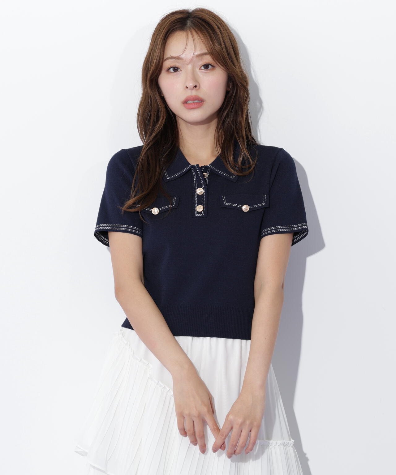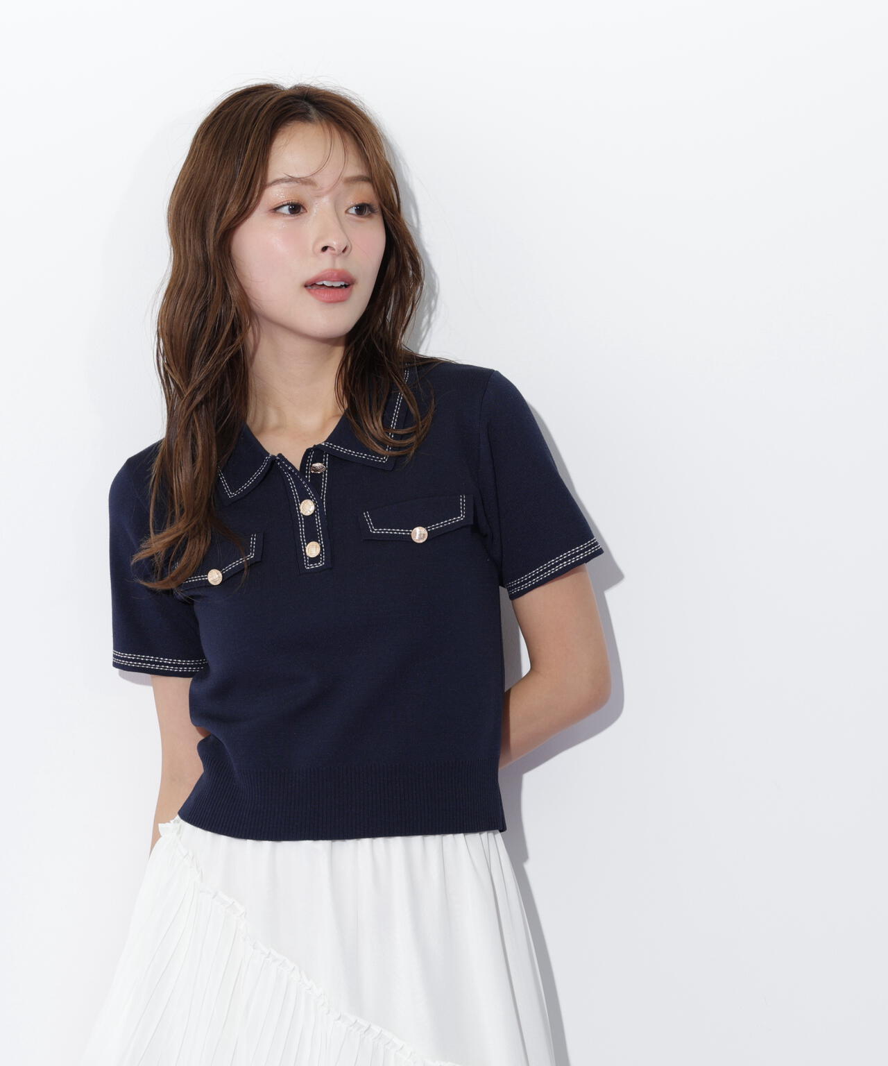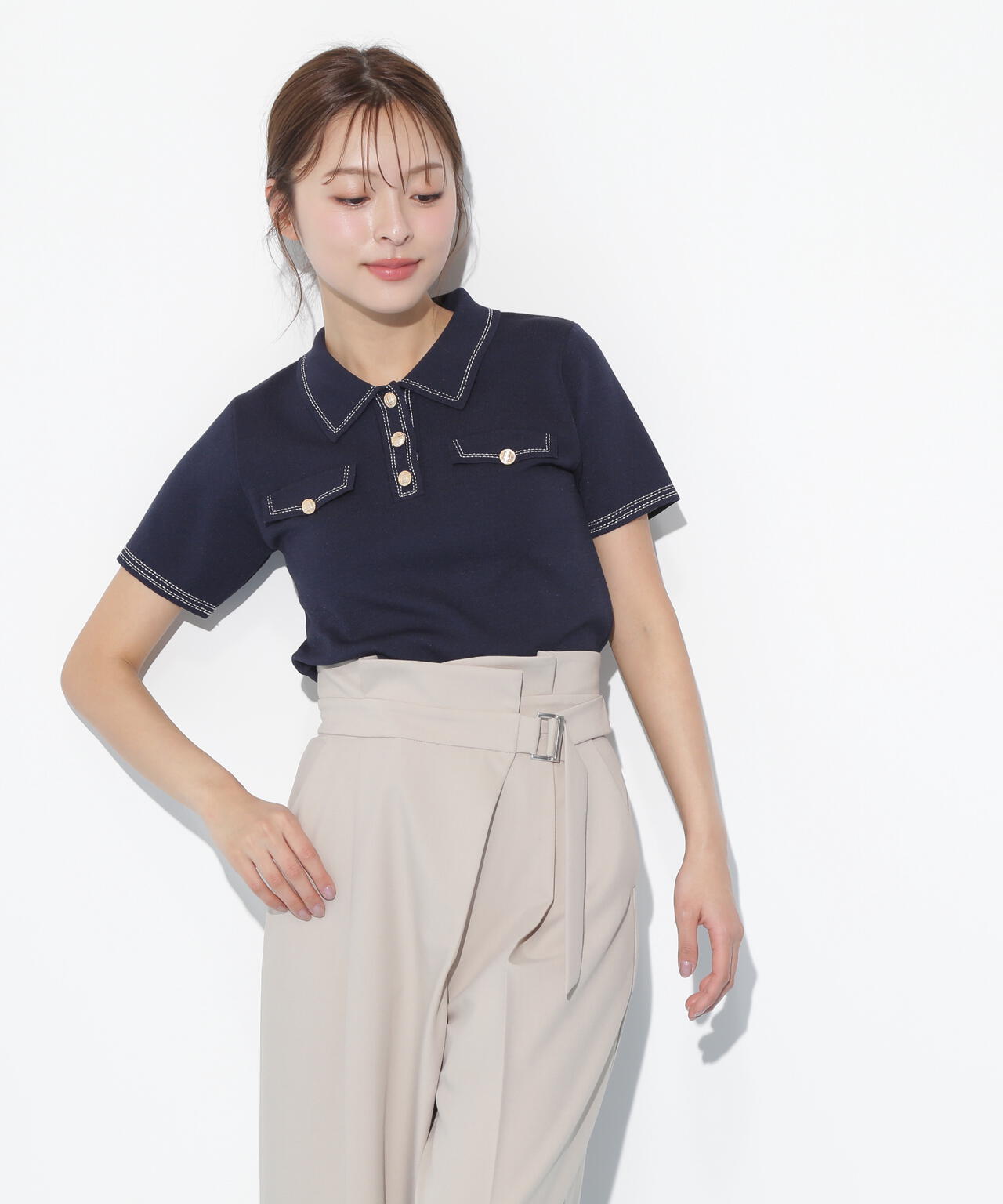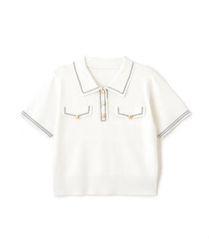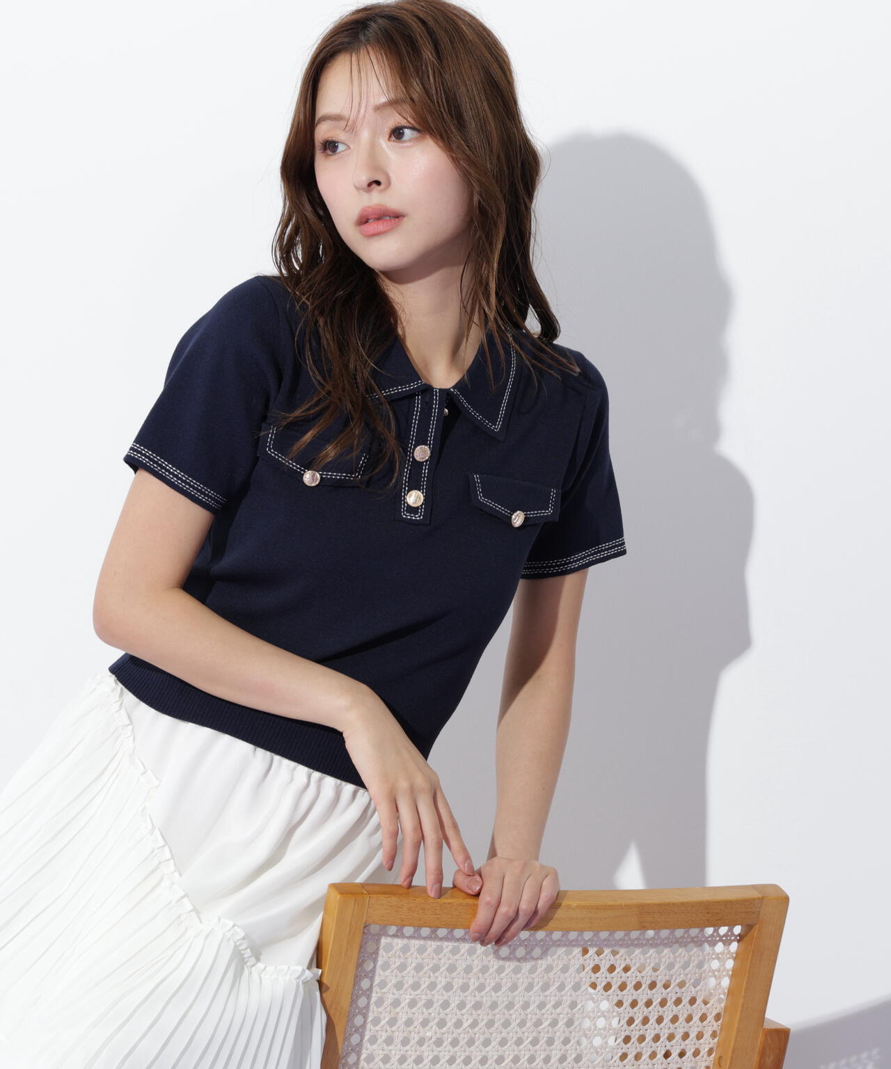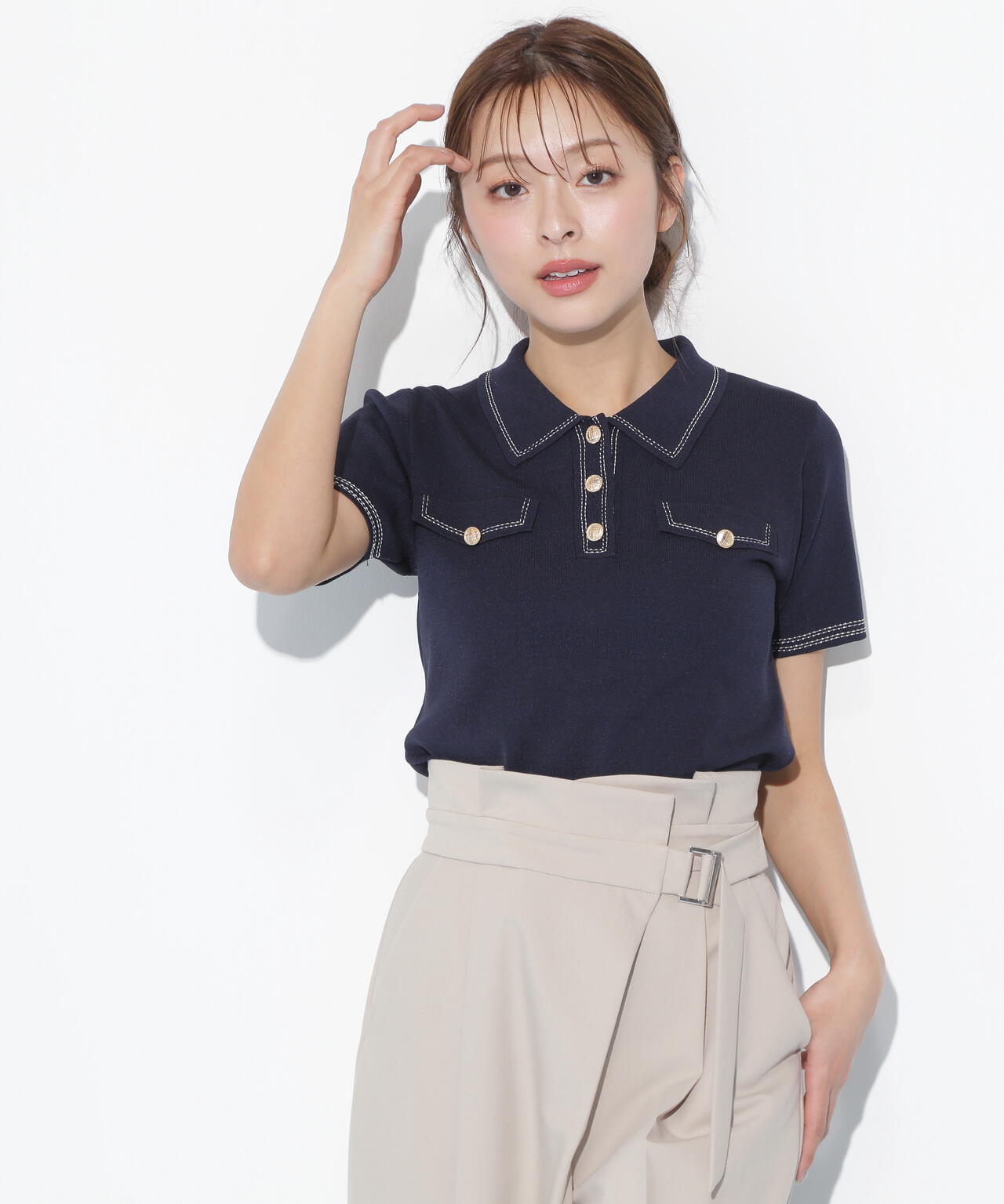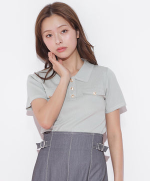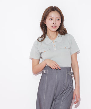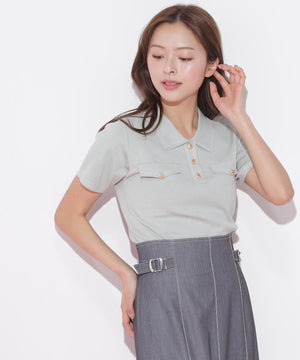 人気商品が再入荷!ドライタッチなポロ襟ニットトップス。さらっとした強撚のドライタッチな糸を使っているので、暑い時期まで長く着ていただけます。ゴールドカラーのヴィンテージ調の釦と、襟やポケットに取り入れたステッチラインがアクセント。トレンドのポロシャツディテールながら、スポーティになりすぎずフェミニンな雰囲気で着られます。※撮影時照明の関係により、色味が違って見える場合がございます。