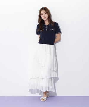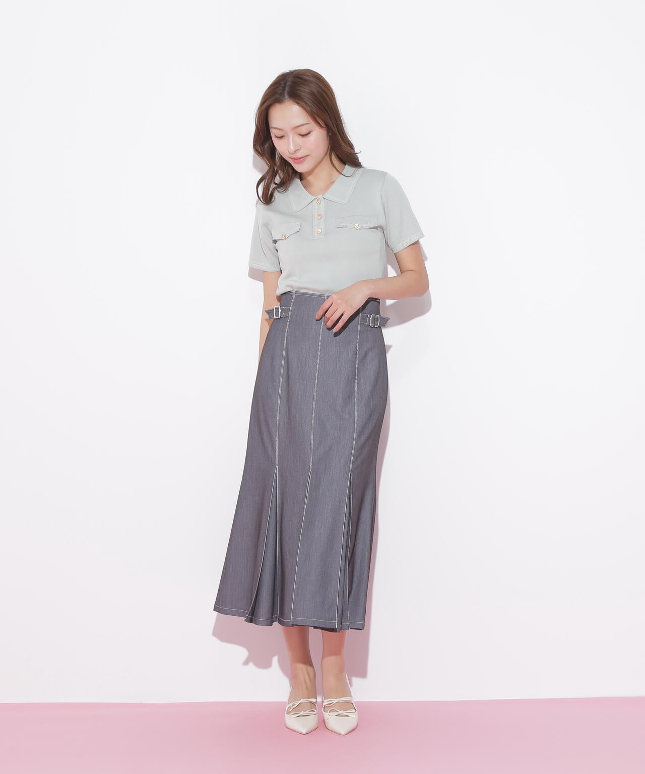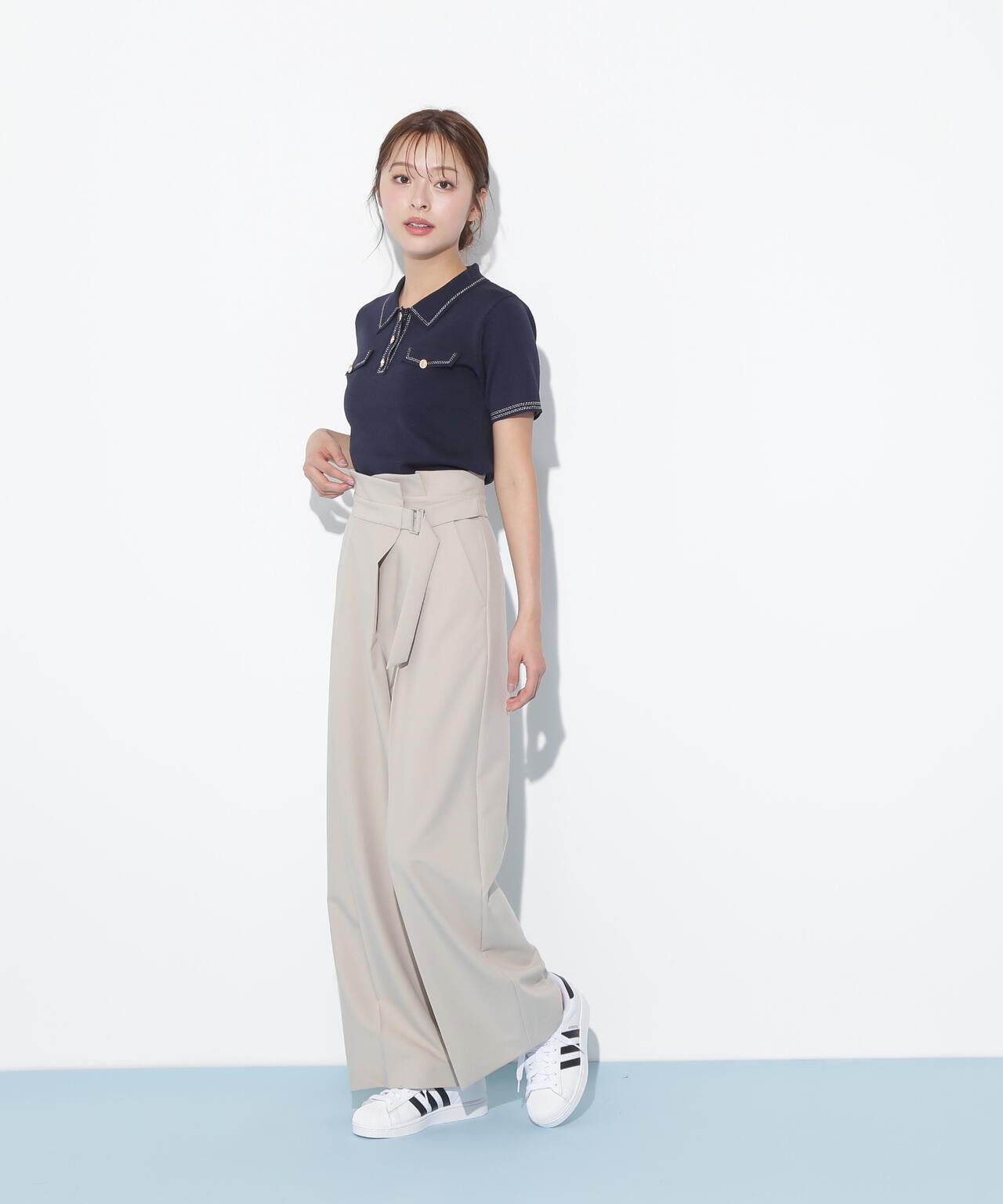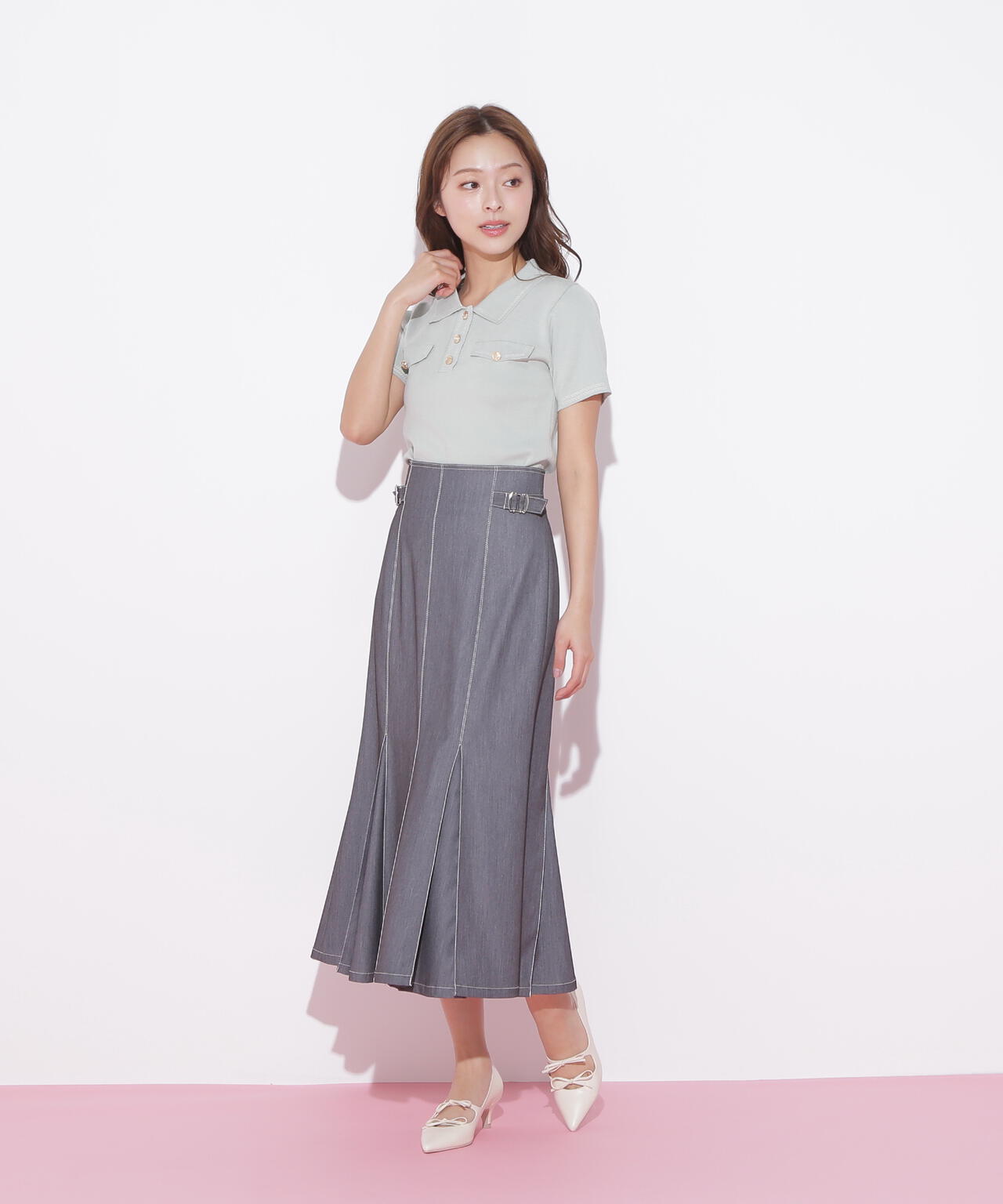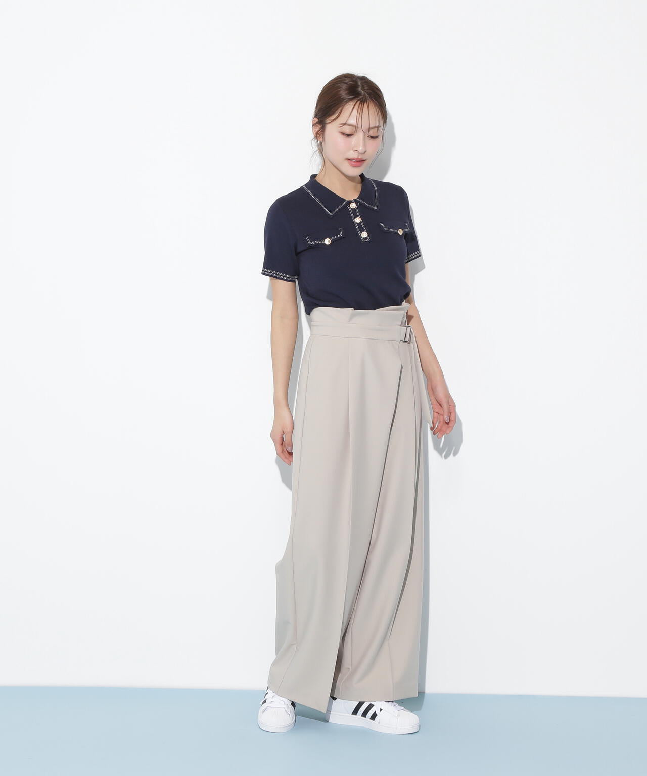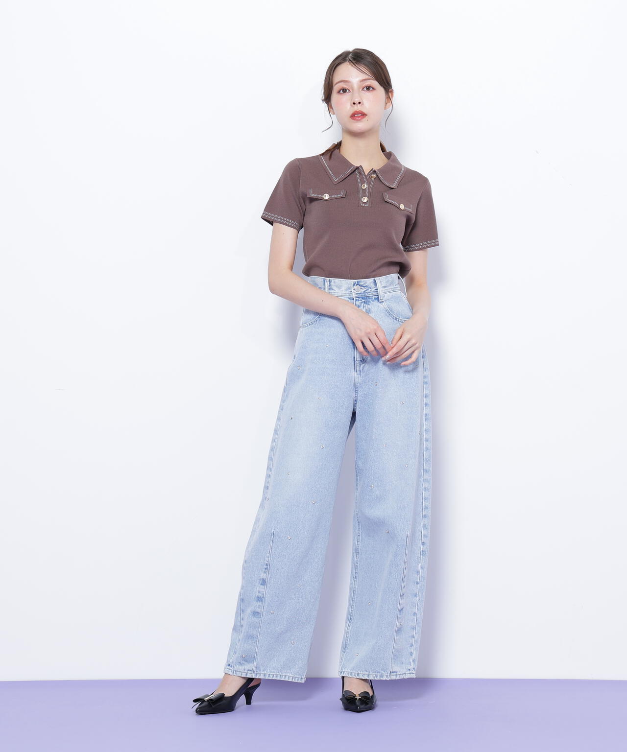 人気商品が再入荷!ドライタッチなポロ襟ニットトップス。さらっとした強撚のドライタッチな糸を使っているので、暑い時期まで長く着ていただけます。ゴールドカラーのヴィンテージ調の釦と、襟やポケットに取り入れたステッチラインがアクセント。トレンドのポロシャツディテールながら、スポーティになりすぎずフェミニンな雰囲気で着られます。※撮影時照明の関係により、色味が違って見える場合がございます。