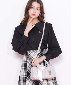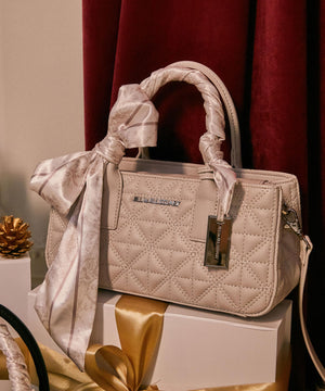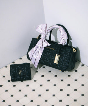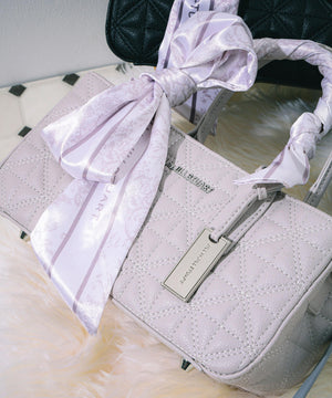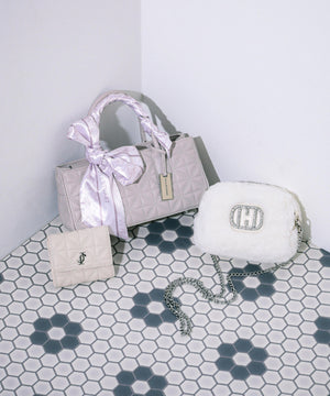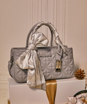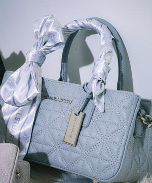 「キルティングデザインとスカーフ使いが上品なトートバッグ」上品なオリジナルのキルティングにメタルのアクセントが効いた、大人っぽい佇まいのバッグです。サテンスカーフをポイントに、洗練された横長シルエットが女性らしくフェミニンなスタイルにぴったり。マグネット付きのフラップ開閉で中身を隠しつつ、中は中央で仕切られているので荷物を整理できるエレガントなデザインです。ショルダーは取り外し可能。※撮影時照明の関係により、色味が違って見える場合がございます。