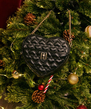 「こころときめくハートフォルムのショルダーバッグ」チラチラと光る品の良いラメが目を引く合皮素材にハート型のキルティング加工を入れた、特別感のあるバッグです。マチにしっかりとした芯を入れることで型崩れしにくく、遊び心と高級感を両立したデザインです。合皮とチェーンを組み合わせたショルダーデザインが大人のフェミニンスタイルにぴったり。中はピンクの裏地とハート型のネームを付けたスペシャル仕様です。※撮影時照明の関係により、色味が違って見える場合がございます。