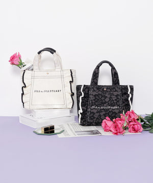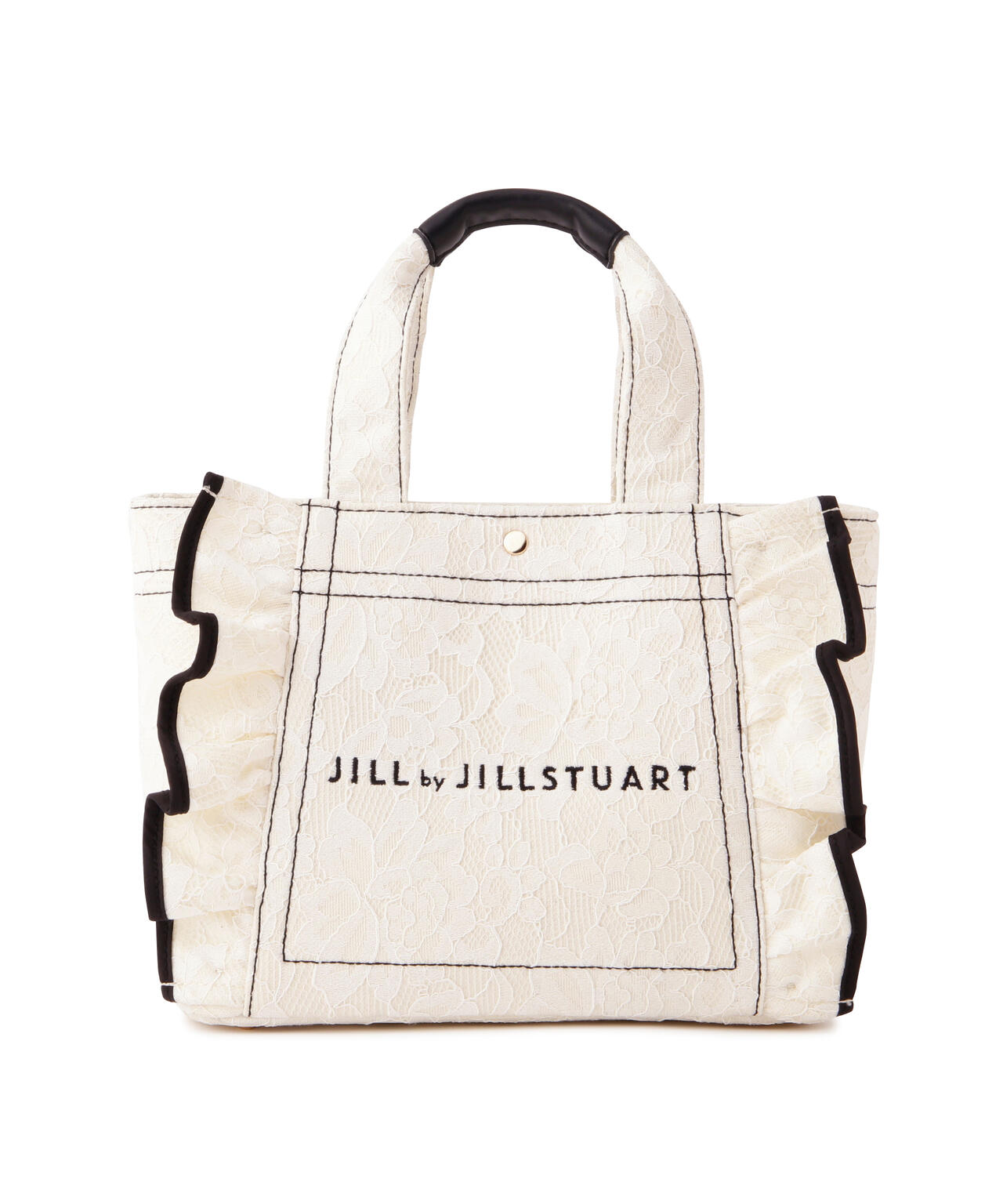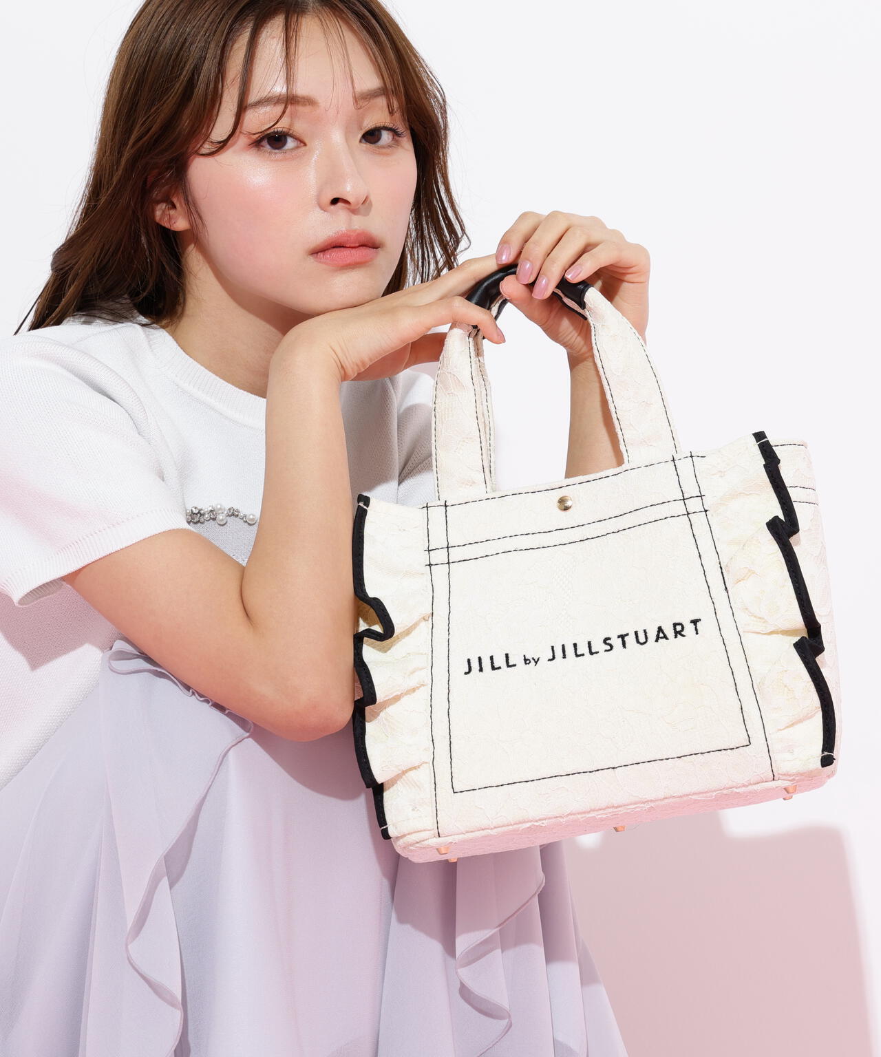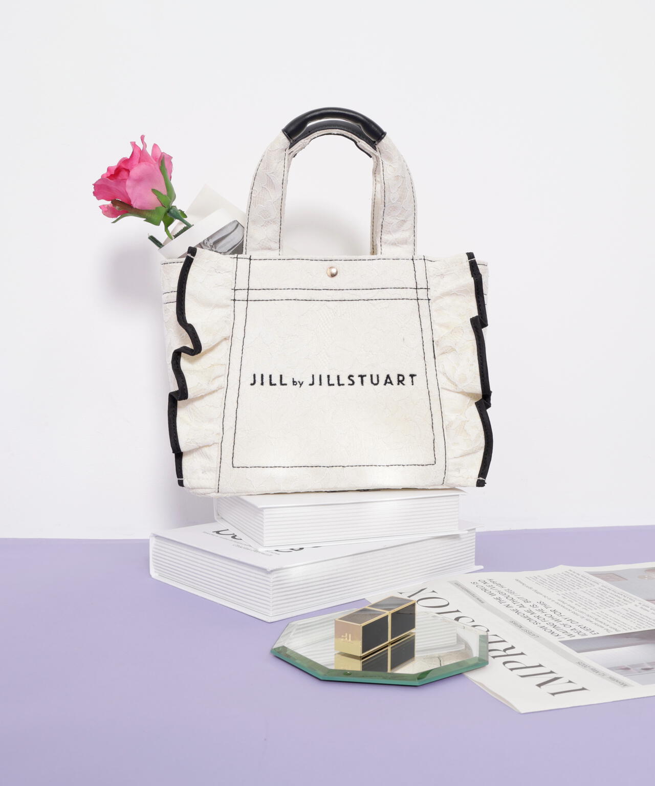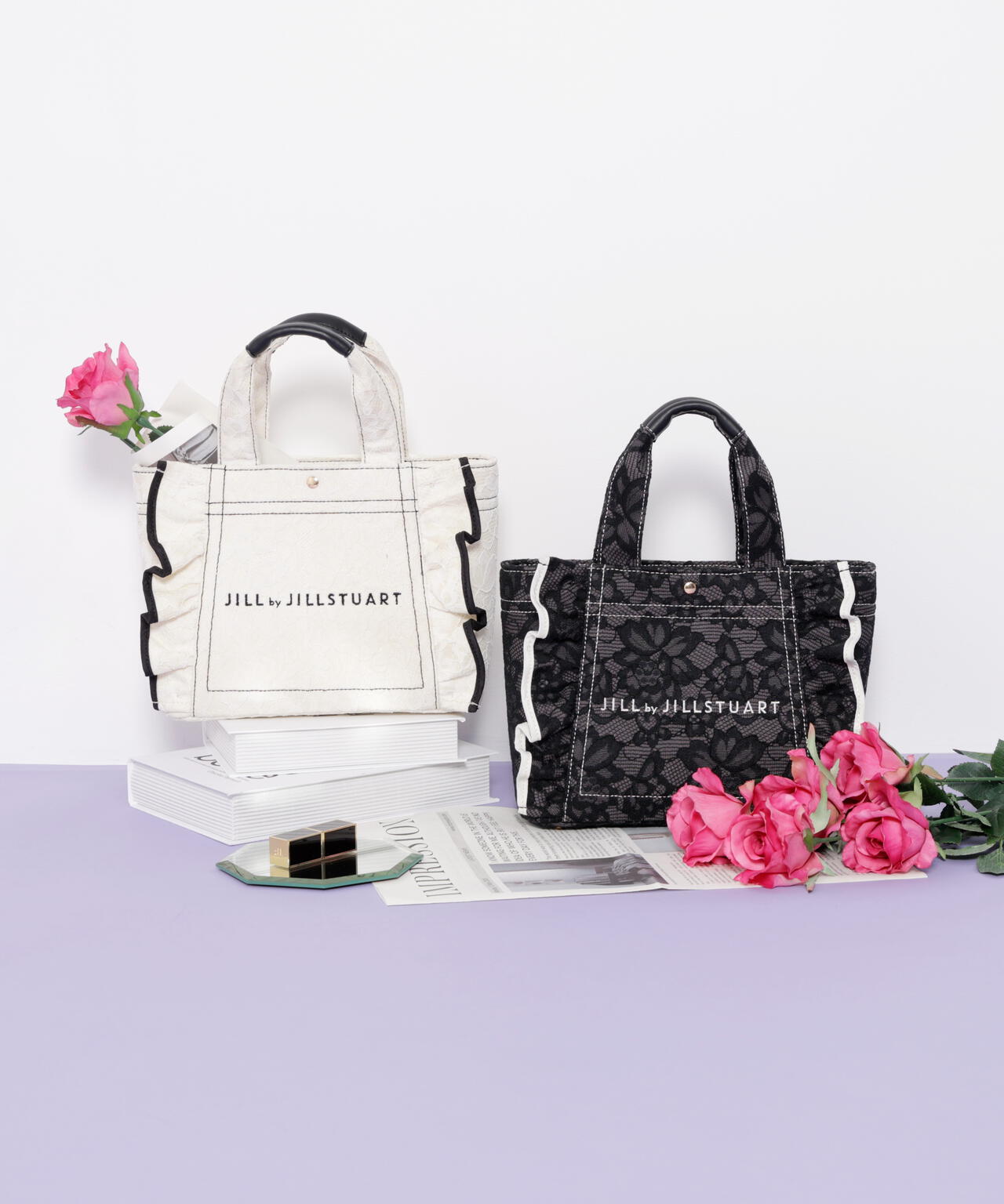 JILL by JILL STUART 定番のフリルトートからレース素材が登場!定番のキャンバスライクな素材にレース生地を貼り合わせて大人かわいい印象に。同系色でまとめたデザインが上品さを叶えます。内側は荷物を整理しやすい小物ポケット付き。背面とハンドル部分には合皮素材を合わせて、品の良さと実用性も兼ね備えました。季節を問わず幅広いシーンにお使いいただけます。※撮影時照明の関係により、色味が違って見える場合がございます。