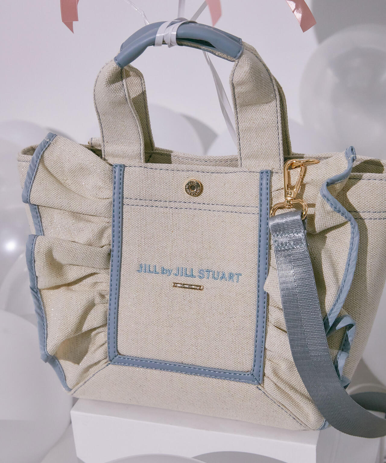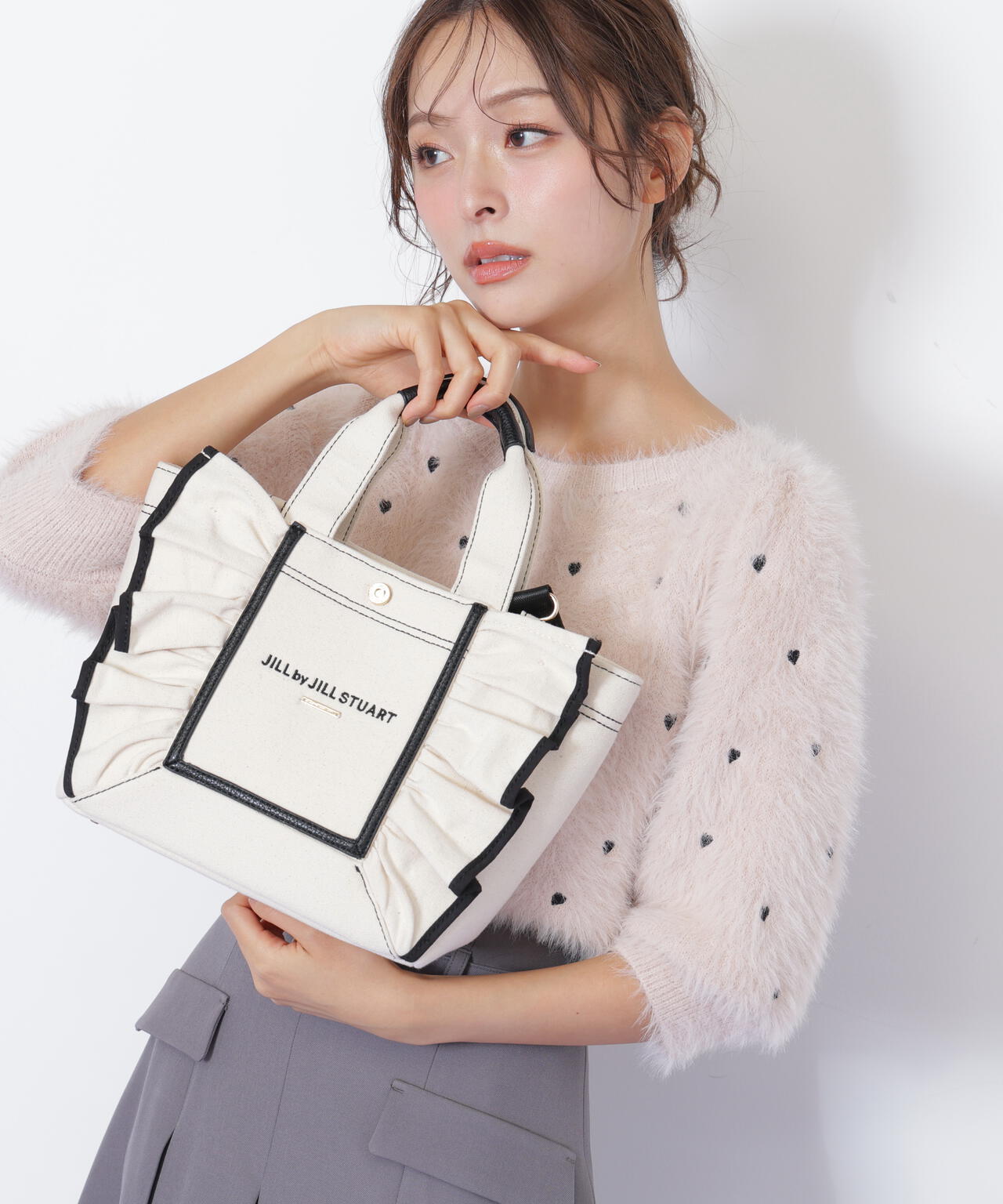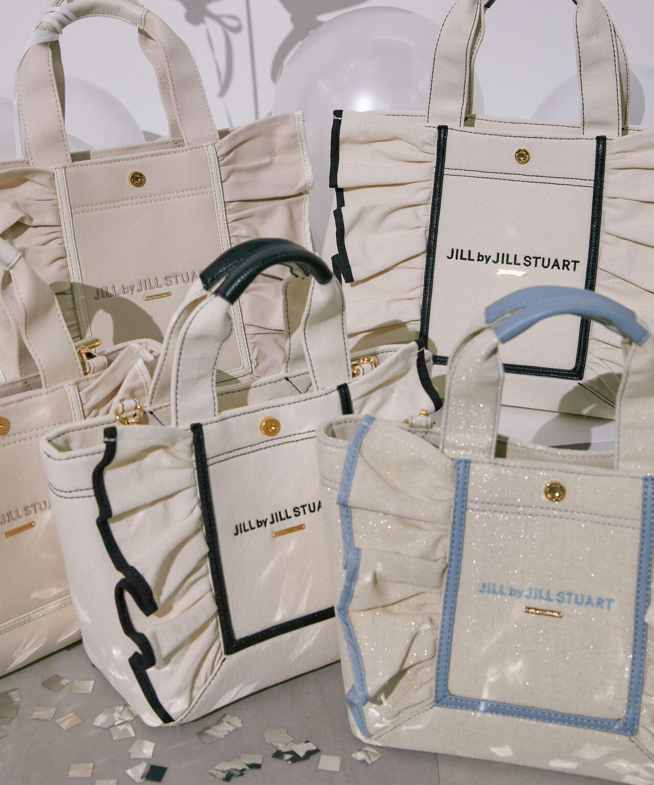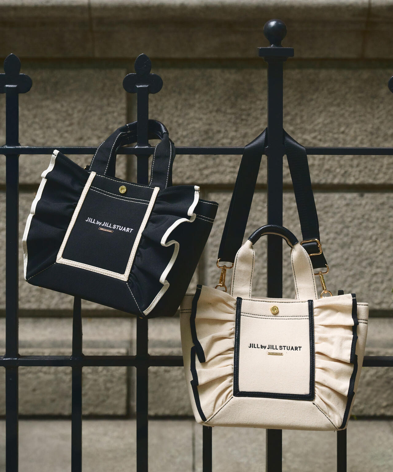 JILL by JILL STUARTのアイコンバッグ「フリルトート」5周年を記念して登場!ボリュームあるワイドフリルと額縁のような配色テープディテールがポイント。従来のフリルバッグとは異なるロゴの書体とサイズ、フリルも大人っぽく仕上げています。ハンドル部分には合皮素材を合わせて、品の良さと実用性も兼ね備えました。取り外しできるショルダー付きの2Way仕様。中は便利なポケット付き。※撮影時照明の関係により、色味が違って見える場合がございます。