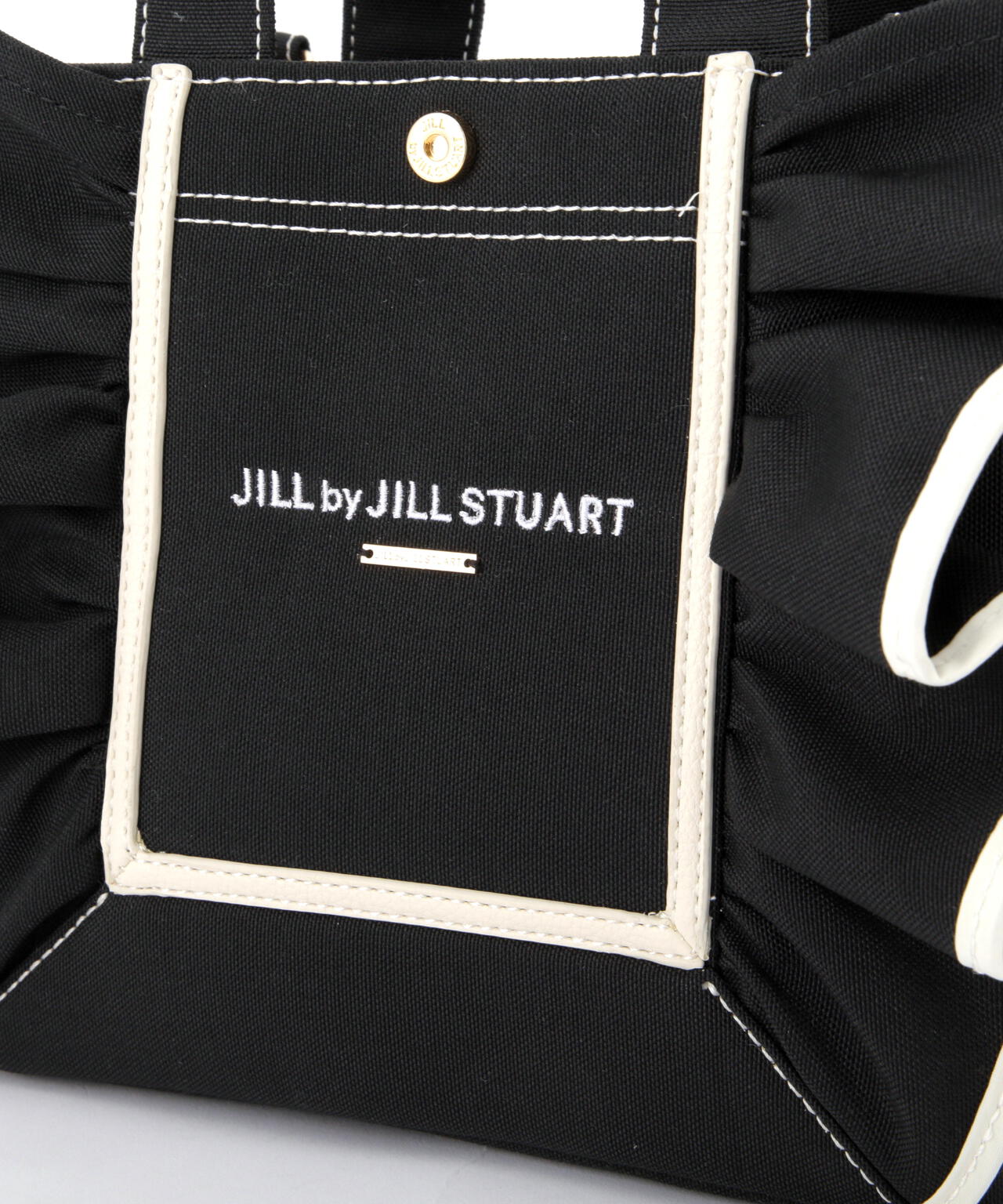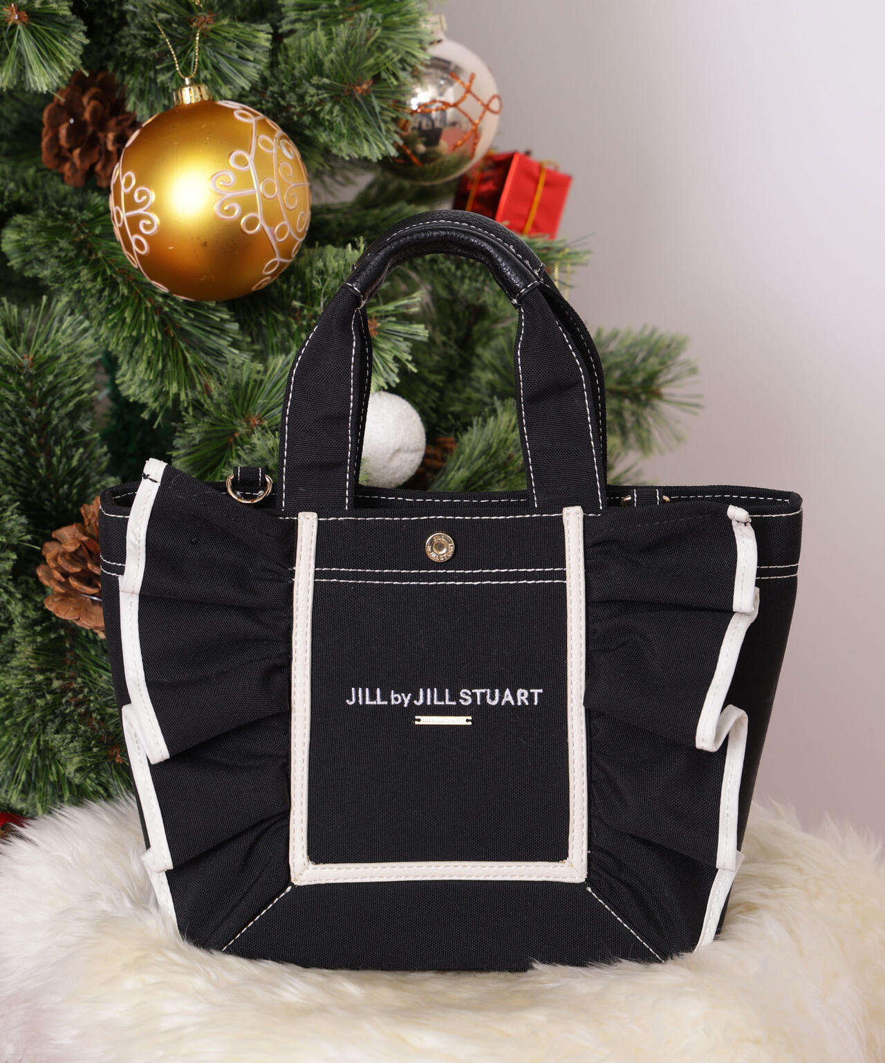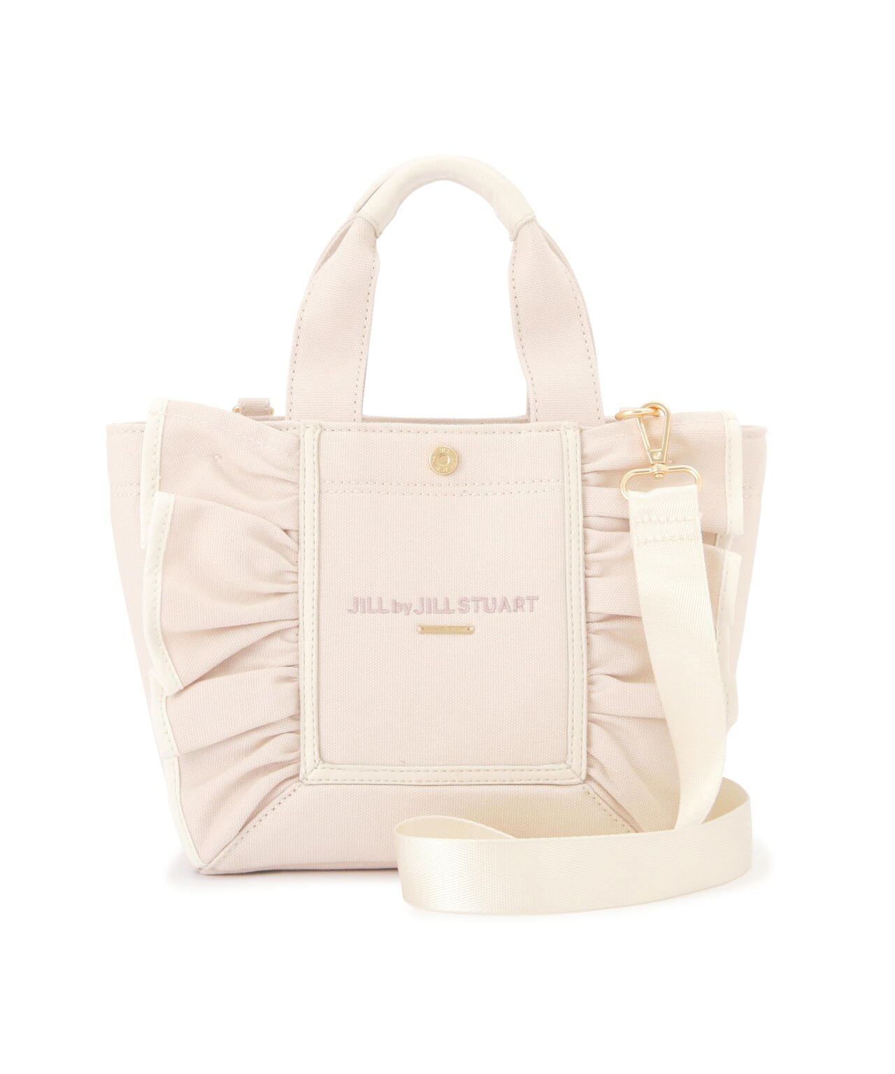 JILL by JILL STUARTのアイコンバッグ「フリルトート」5周年を記念して登場!ボリュームあるワイドフリルと額縁のような配色テープディテールがポイント。従来のフリルバッグとは異なるロゴの書体とサイズ、フリルも大人っぽく仕上げています。ハンドル部分には合皮素材を合わせて、品の良さと実用性も兼ね備えました。取り外しできるショルダー付きの2Way仕様。中は便利なポケット付き。※撮影時照明の関係により、色味が違って見える場合がございます。