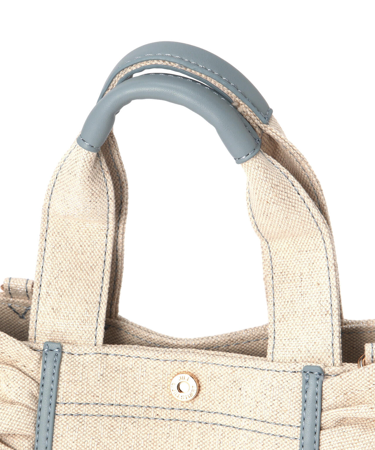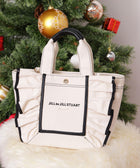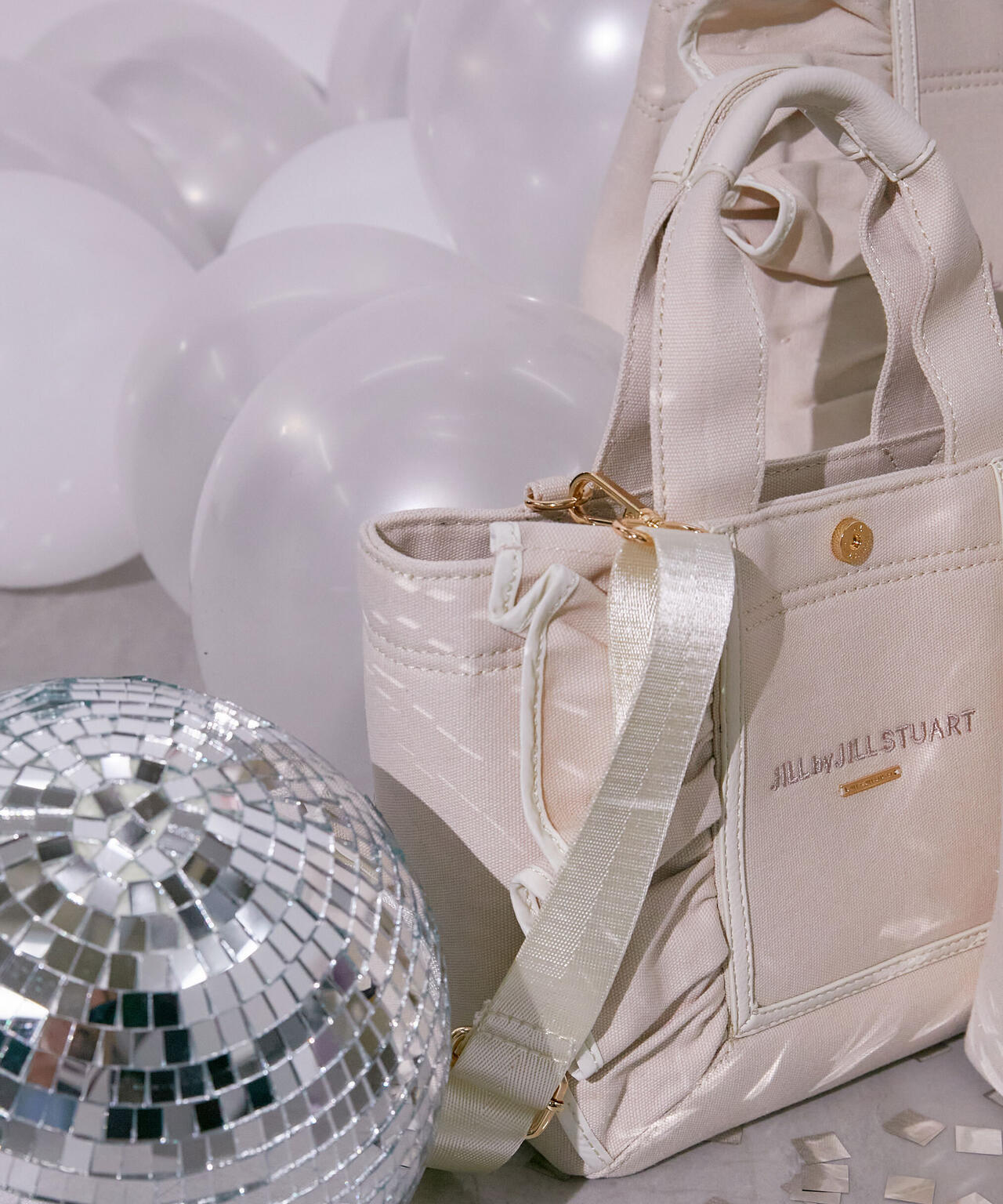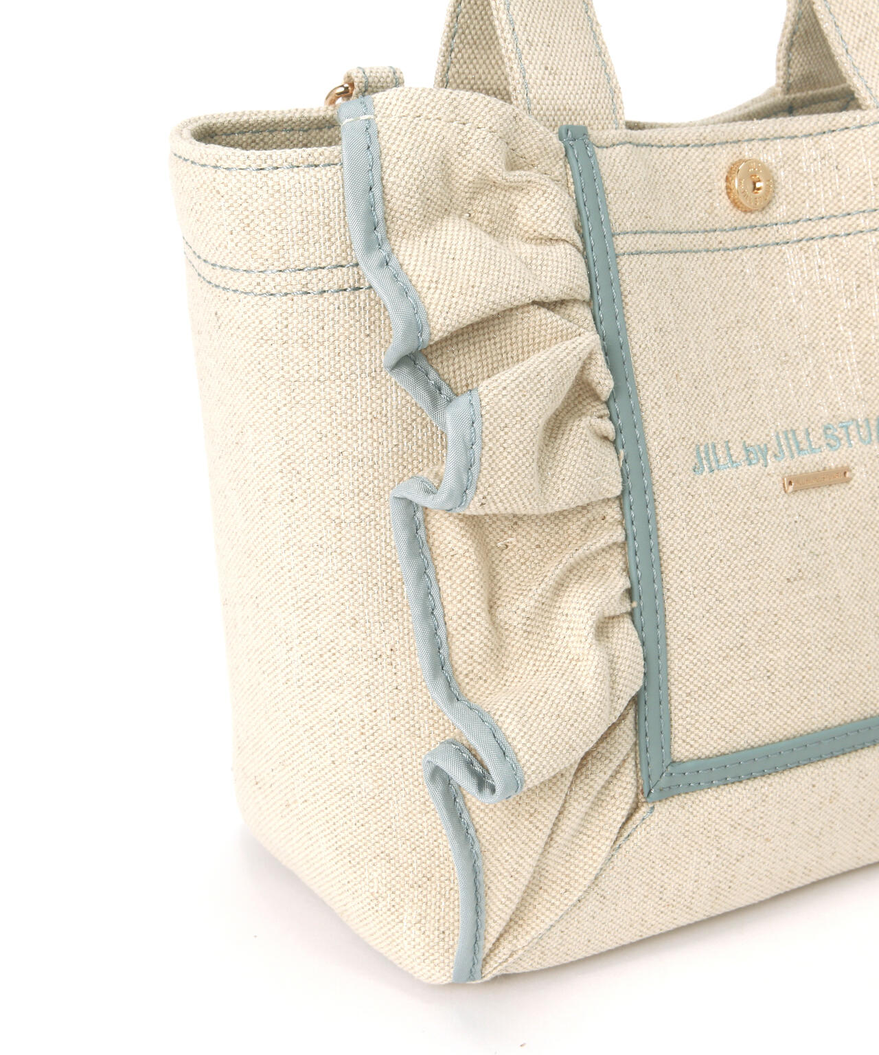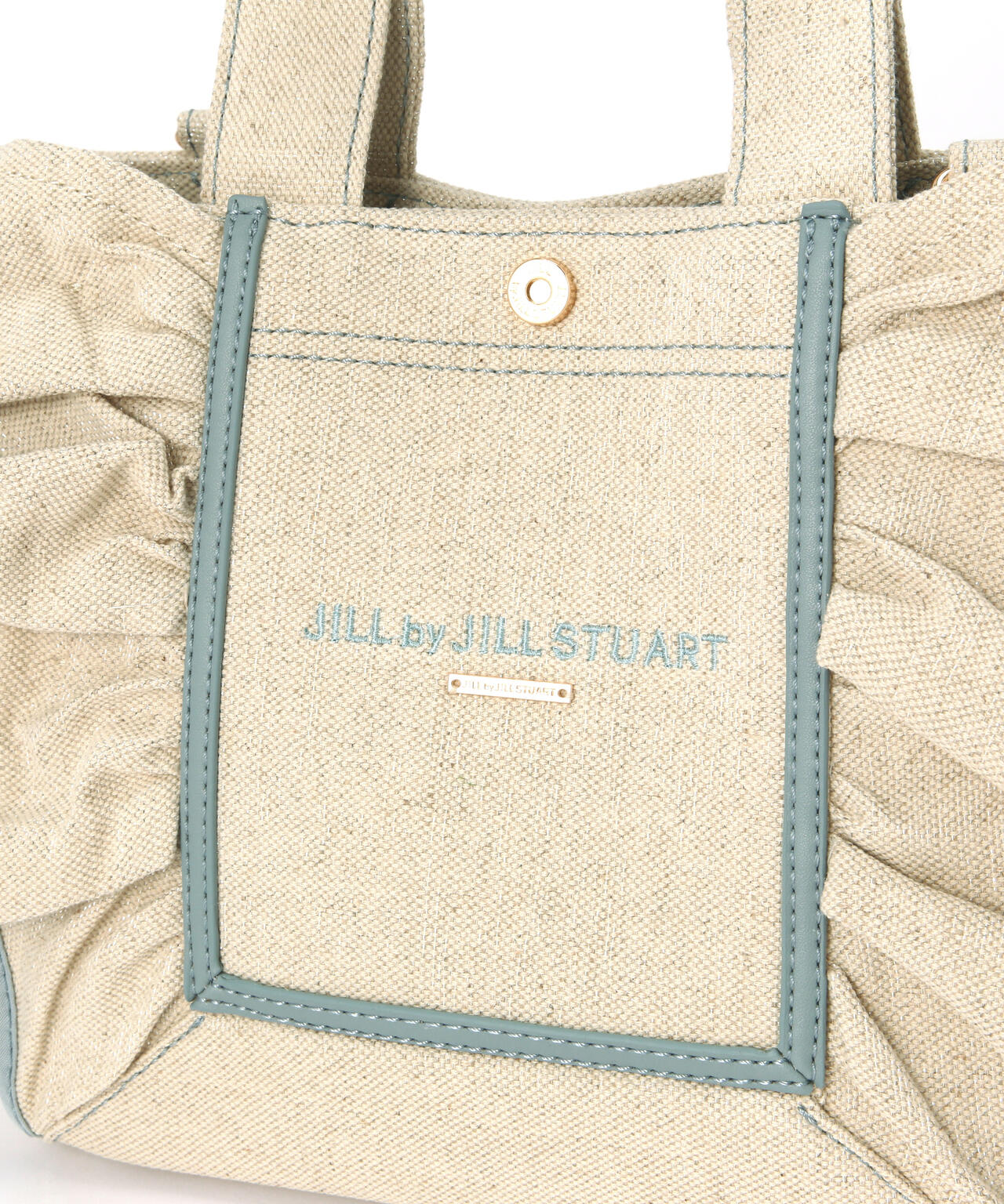 JILL by JILL STUARTのアイコンバッグ「フリルトート」5周年を記念して登場!ボリュームあるワイドフリルと額縁のような配色テープディテールがポイント。従来のフリルバッグとは異なるロゴの書体とサイズ、フリルも大人っぽく仕上げています。ハンドル部分には合皮素材を合わせて、品の良さと実用性も兼ね備えました。取り外しできるショルダー付きの2Way仕様。中は便利なポケット付き。※撮影時照明の関係により、色味が違って見える場合がございます。
