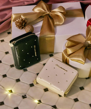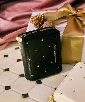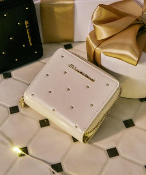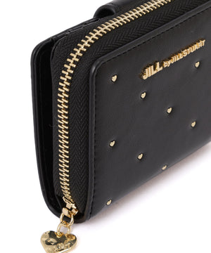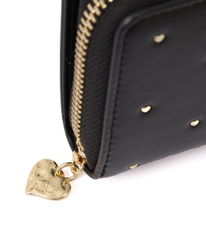 小さなハートスタッズに心ときめくシンプルなウォレット。品よく並べたハートスタッズが、大人のかわいさと無駄のないディテールで長く使えるデザインです。スナップボタン開閉でカード類・お札入れ、コの字ファスナー部分はコイン入れです。ファスナーの引き手にはロゴ入りのオリジナルのハートチャーム付き。ご自身用はもちろんギフトにもお勧めです。※撮影時照明の関係により、色味が違って見える場合がございます。