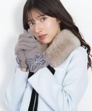 大きめのリボンがキュートなジャージグローブ。手に程よくフィットする、暖かみのあるジャージ素材を使用しています。大きめのベルベットリボンがフェミニンな印象で、手元を華やかに見せてくれます。スマートフォンなどのタッチパネル操作が可能な刺しゅう入り。ご自身用はもちろんギフトにもお勧めです。※撮影時照明の関係により、色味が違って見える場合がございます。