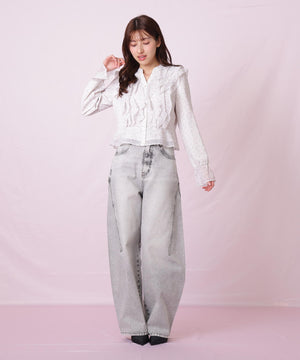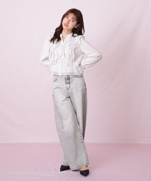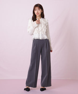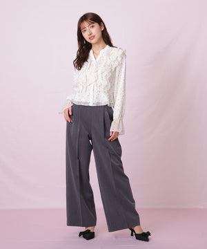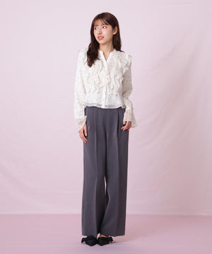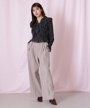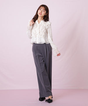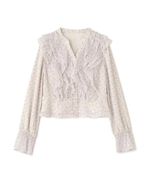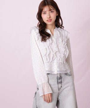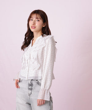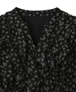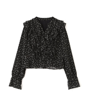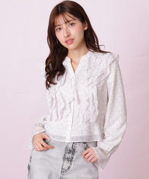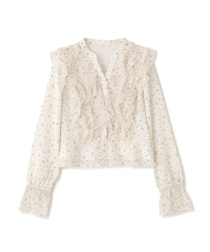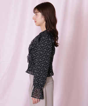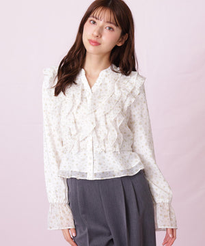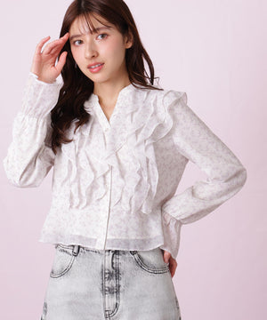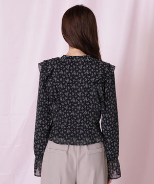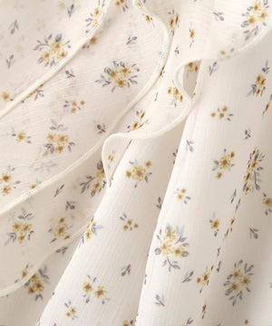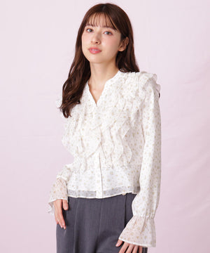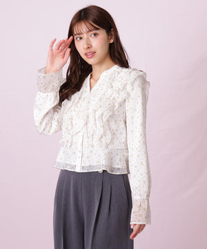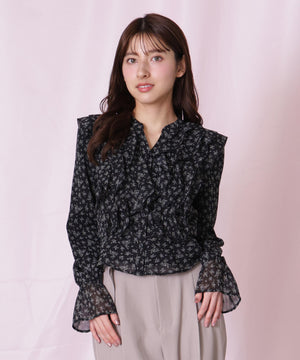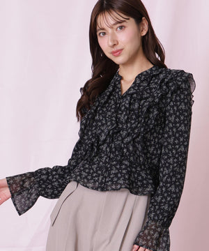 華やかな春色が映える小花柄プリントのシアーブラウス。表地はシアー感があり、軽くて柔らかい素材ながらも、裏地が付いているので初夏まで活躍してくれます。胸元のラッフルとさりげないぺプラムデザインがポイント。ブラウスの裾は、ウエストアウトで着こなすのがオススメです。※撮影時照明の関係により、色味が違って見える場合がございます。