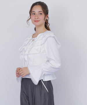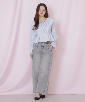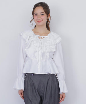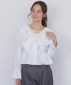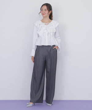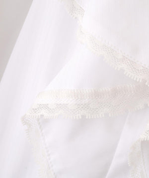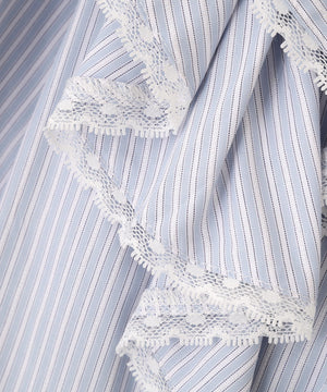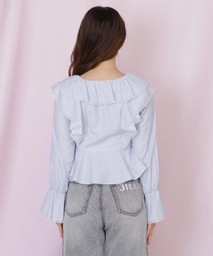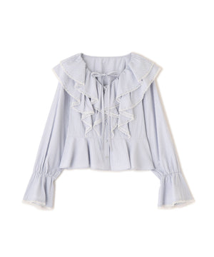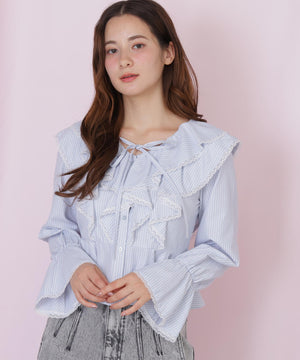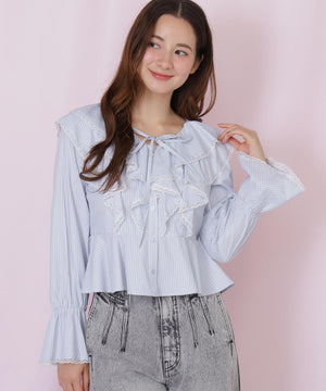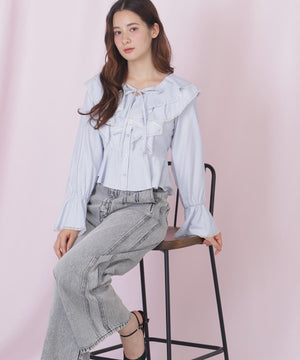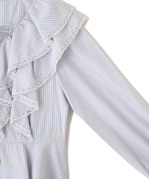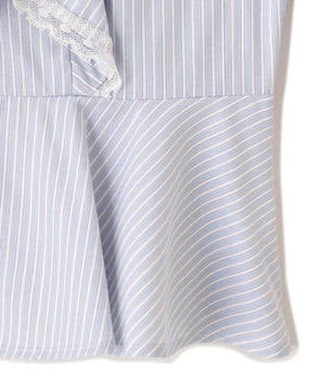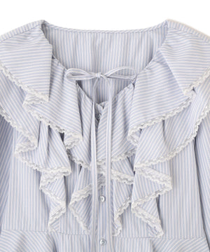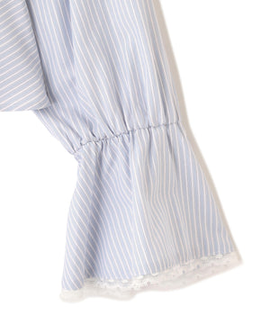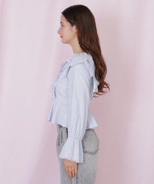 ストライプの薄手のシャツ地を使用した清涼感のあるブラウス。この時期から初夏まで長い期間着れる素材感。ラッフルと袖口の端についた繊細なレースが今年らしいポイント。デニムやキレイ目パンツとも相性抜群。袖口にゴムが入っているのでパフらせて着用がおすすめ。ジャケットの中に着て袖口をチラ見せさせるのもトレンド感があって◎