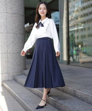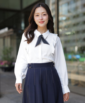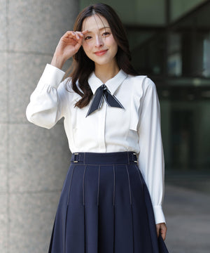 配色スカーフ付きの程よい厚みのある上品で実用性も兼ね備えたブラウス。顔まわりを華やかに見せながら、きれいめな印象に仕上げてくれます。一枚で着映えし、ジャケットインにもおすすめ。オンオフ問わず活躍できる万能アイテムです。