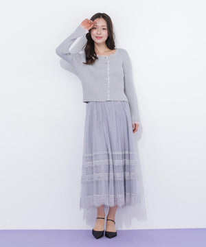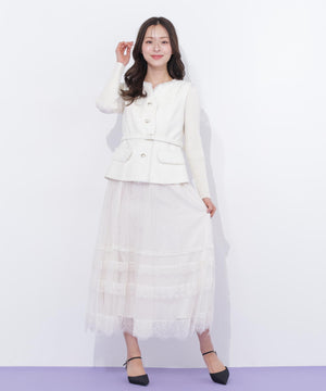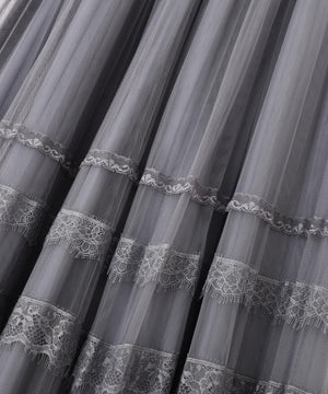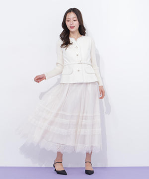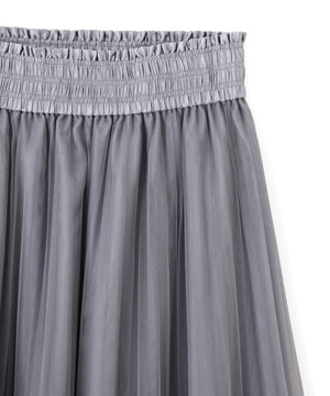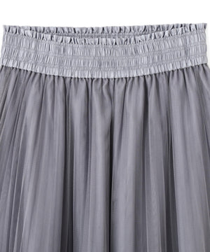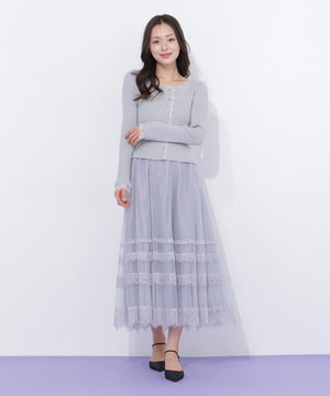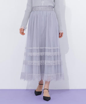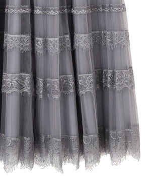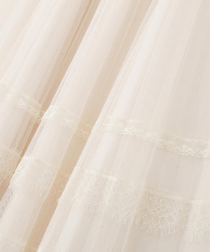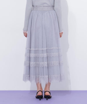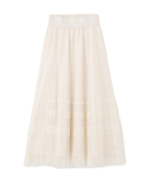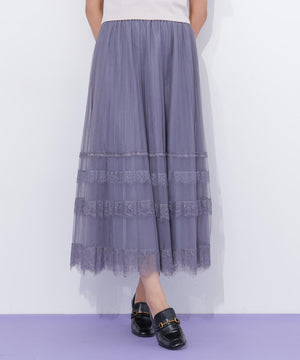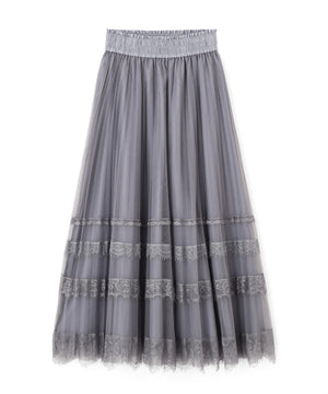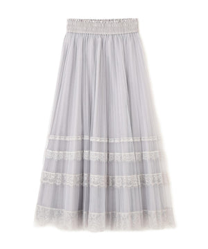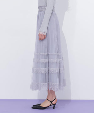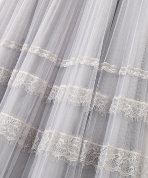 軽くて繊細なチュール素材に4種類の幅と柄違いの繊細なレースがたたかれたプリーツスカート。蹴回したっぷりのデザイン。ウエストはマットサテン生地で切り替え、ぐるりゴム仕様。ショート丈アウター合わせが特におすすめ。スタンドカラーショートトレンチコート(品番1256151004)とも相性抜群です。
