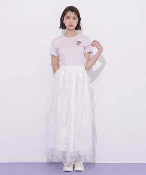 チュールとレース素材を縦に施したラッフルデザインが印象的なシアースカート。縦ラインのラッフルデザインですっきりとしたシルエットを演出します。軽やかな透け感で女性らしい抜け感をプラスし、歩くたびに揺れる華やかさが魅力。デイリーからお出かけまで幅広く活躍してくれます。※撮影時照明の関係により、色味が違って見える場合がございます。