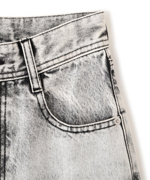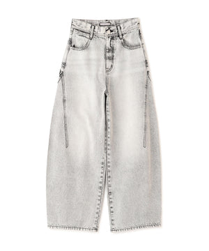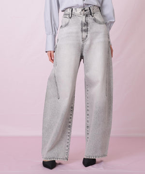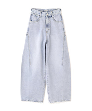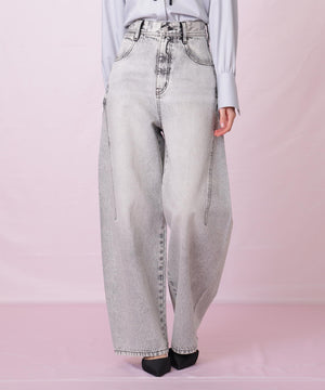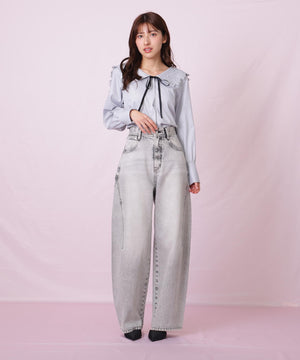 カーブラインの切り替えがスタイルアップを叶えるデニムパンツ。後ろポケットのリボン加工がポイントでほんのり甘さをプラスし、カジュアルすぎないフェミニンなデニムコーデに。ブラウスやニットなど、トップスを選ばずに着回せます。※撮影時照明の関係により、色味が違って見える場合がございます。