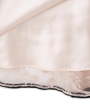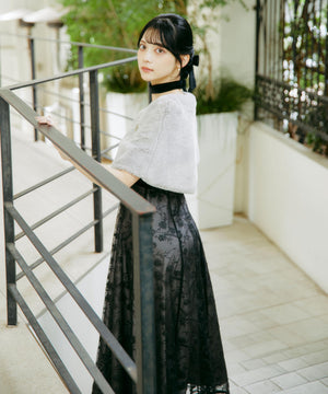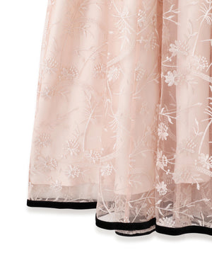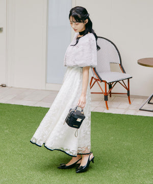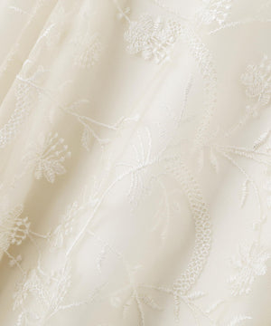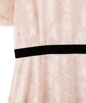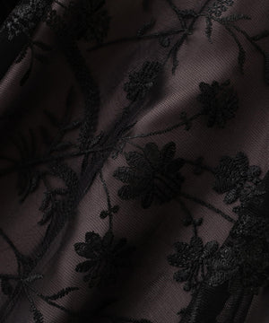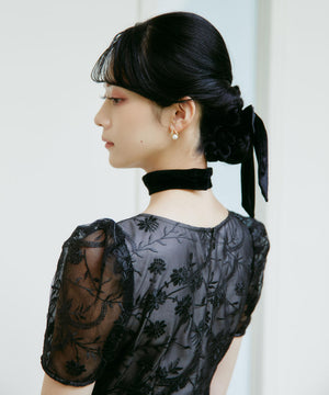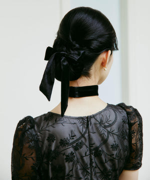 総柄の刺繍を施した繊細なレース生地に艶やかなベルベットテープをあしらい華やかさとクラシカルなムードを纏わせました。