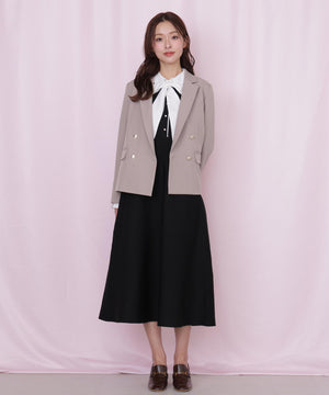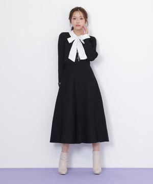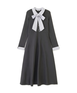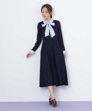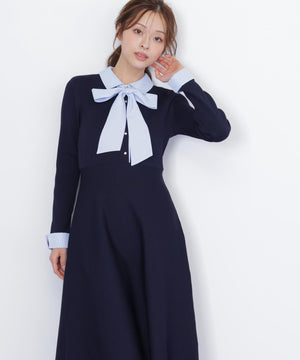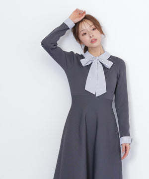 取り外しできるリボンタイ付きシャツ襟ニットワンピース。布帛のシャツ襟・カフス・大きいリボンタイと、ポリエステルの軽くてシルエットがキレイなニットをドッキングした1枚。リボンタイは取り外しできるため、オンオフで使い分けられるのが嬉しいポイント。襟できちんと感がありつつ、ニットで動きやすくなっているので新生活にもおすすめ。グレーとネイビーカラーのストライプ生地が春らしくて特におすすめです。※撮影時照明の関係により、色味が違って見える場合がございます。