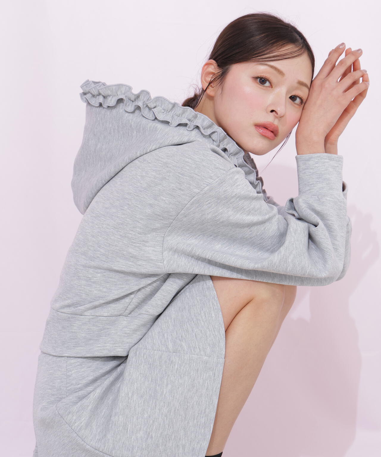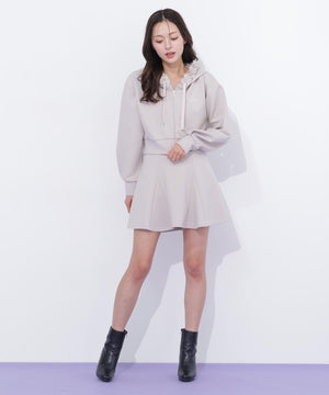 ダイバーセットミニスカパン(125-6120038)とセットアップで着用がオススメのパーカーが登場。ふくらみのある肌触りの良いダイバー素材を使用し、同じ素材でほど良いボリュームのあるフード回りのフリルがポイント。フードをかぶっても、おろしても、360°可愛らしい着映えするアイテムです。