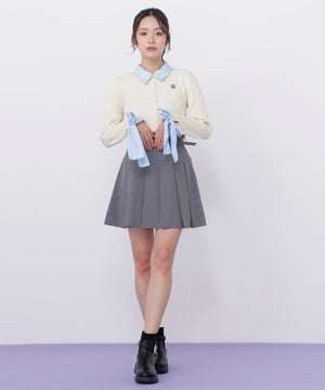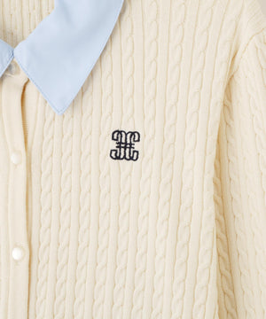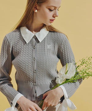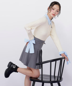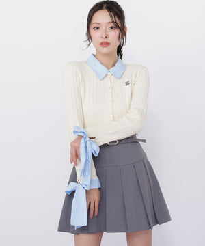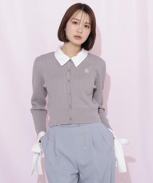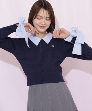 襟と袖のカフスリボンに布帛のシャツ地を使用したキャッチーな印象のニットが登場。ミニケーブル編みが春らしいデザインで、袖口の重ね着したような大きなリボンカフスが目を引く今年らしい一枚。