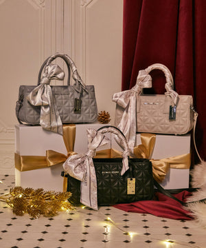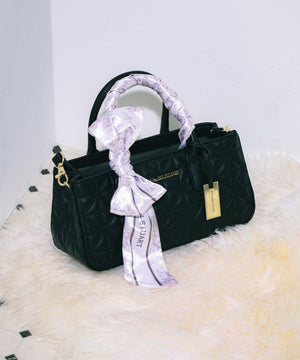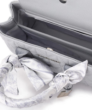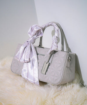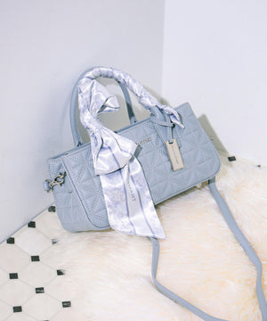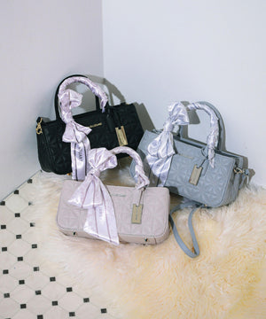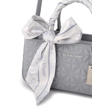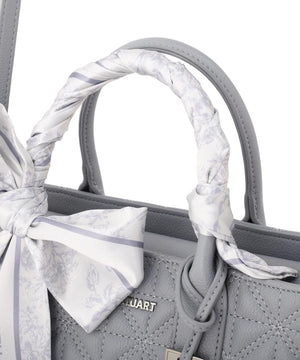 「キルティングデザインとスカーフ使いが上品なトートバッグ」上品なオリジナルのキルティングにメタルのアクセントが効いた、大人っぽい佇まいのバッグです。サテンスカーフをポイントに、洗練された横長シルエットが女性らしくフェミニンなスタイルにぴったり。マグネット付きのフラップ開閉で中身を隠しつつ、中は中央で仕切られているので荷物を整理できるエレガントなデザインです。ショルダーは取り外し可能。※撮影時照明の関係により、色味が違って見える場合がございます。