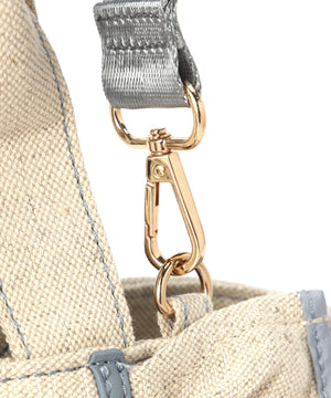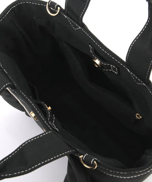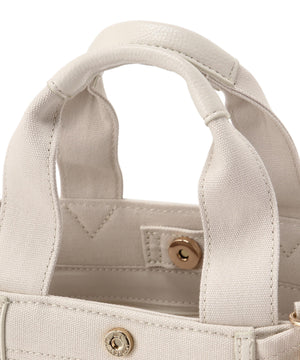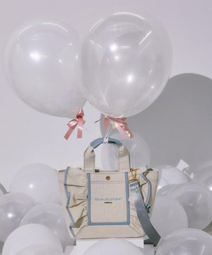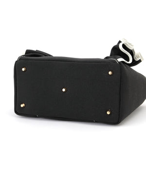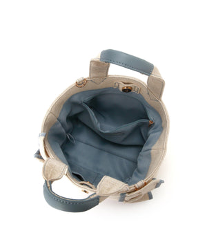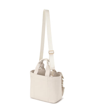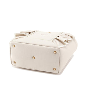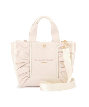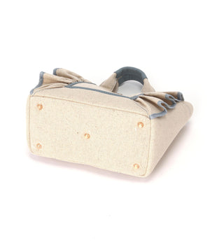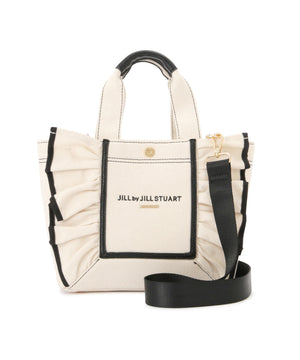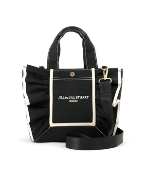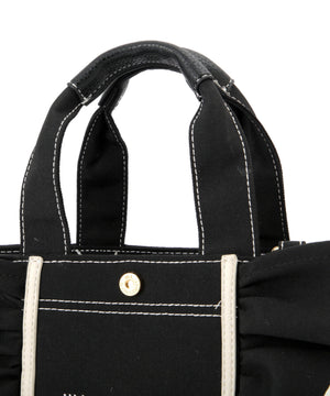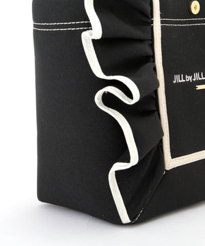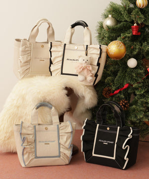 ボリュームあるワイドフリルと額縁のような配色テープディテールがポイント。従来のフリルバッグとは異なるロゴの書体とサイズ、フリルも大人っぽく仕上げています。ハンドル部分には合皮素材を合わせて、品の良さと実用性も兼ね備えました。取り外しできるショルダー付きの2Way仕様。中は便利なポケット付き。