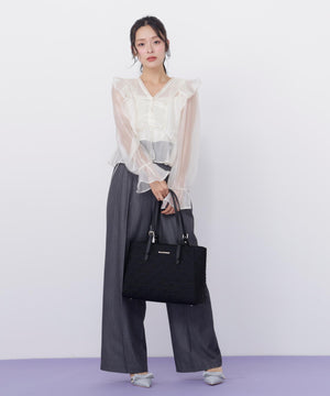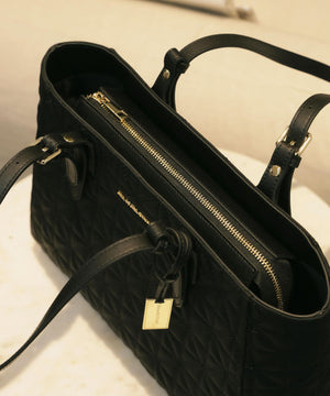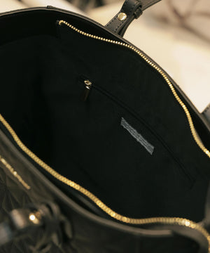 デイリー使いしやすいA4サイズ対応のトートバッグ。本体は軽くカジュアルな素材にキルティングを施し、合皮ハンドルを組み合わせた、エレガントな印象のデザインです。内側はファスナーポケット付き。A4ファイルや書類が入るサイズ感です。開口部はファスナー付きで中身が見えない安心仕様に。つるっとした素材で汚れがつきにくく、デイリーから通勤バッグとしても活躍してくれます。※撮影時照明の関係により、色味が違って見える場合がございます。