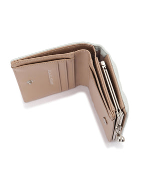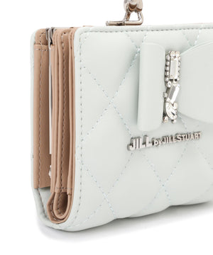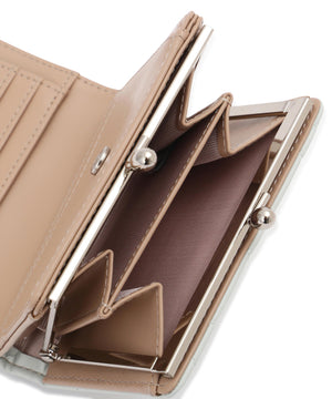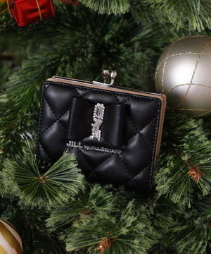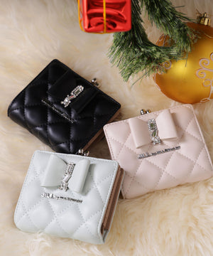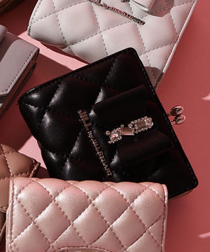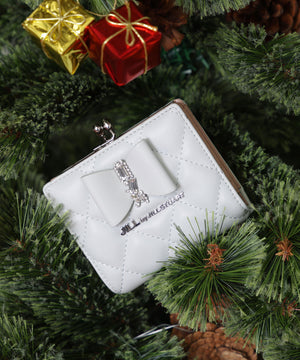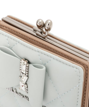 きらめく装飾でリボンをデコレーションしたレディライクなお財布。リボンとキルトを組み合わせた上品で華やかなデザインです。お札とカード収納はスナップ釦で開閉。小銭入れはワンタッチで開くがま口仕様で、中は仕切りがあり便利です。※撮影時照明の関係により、色味が違って見える場合がございます。