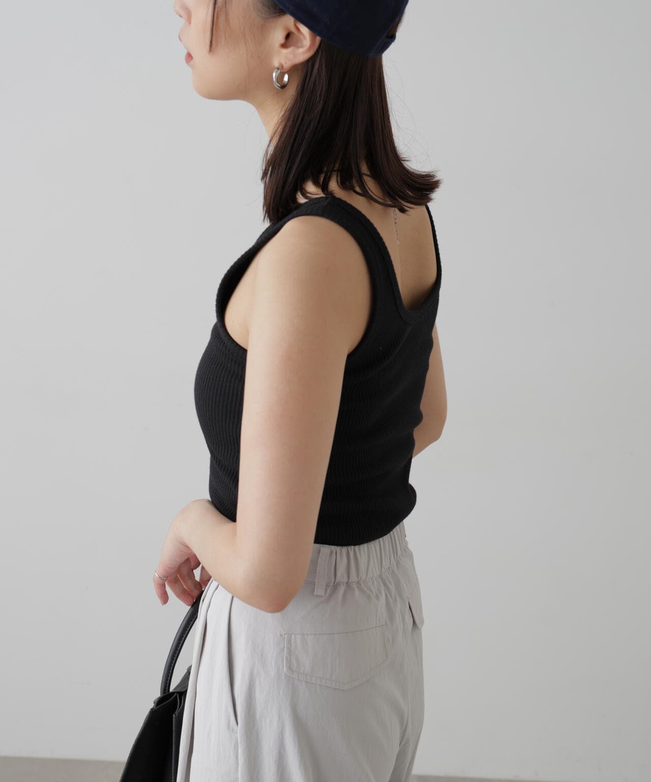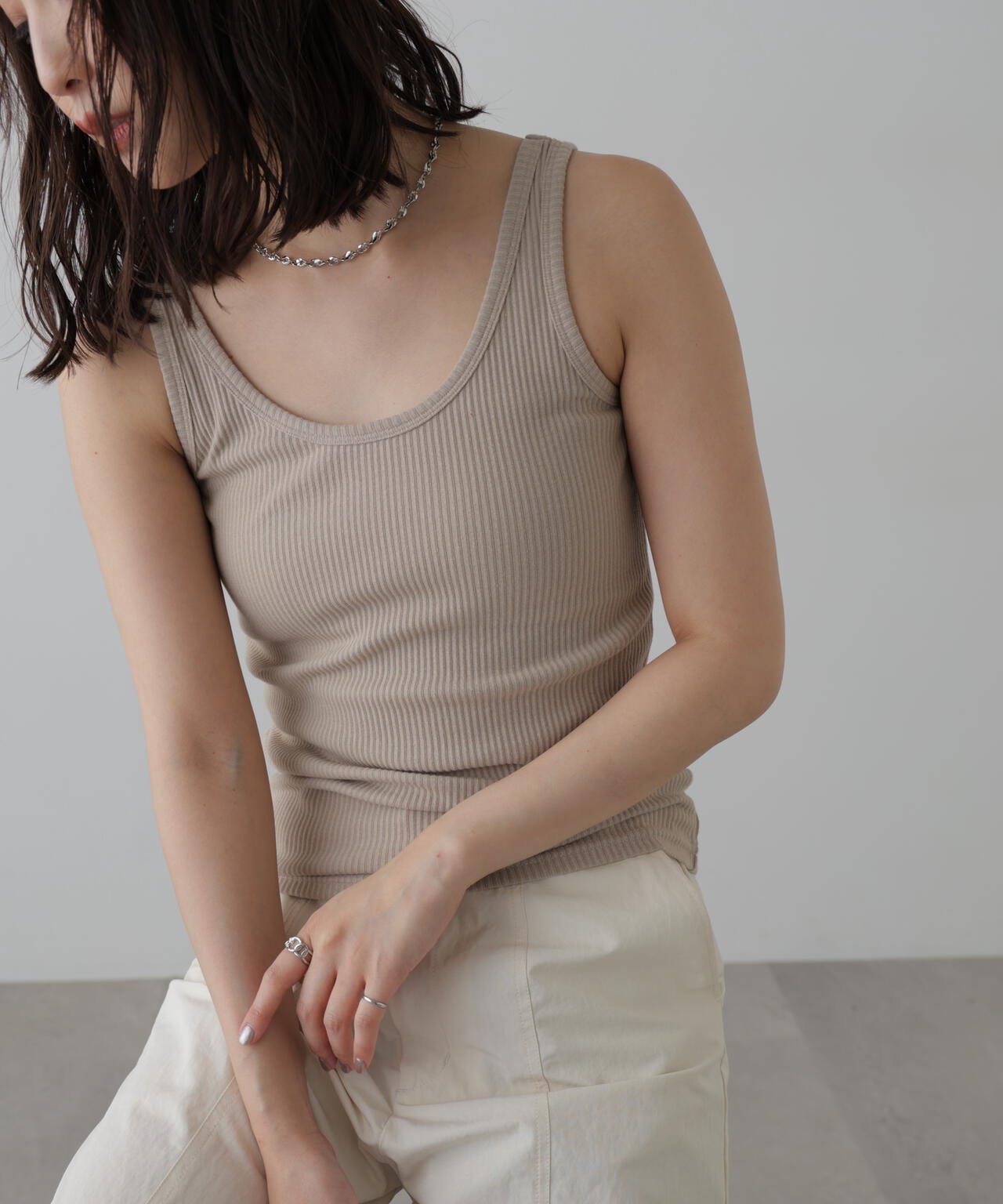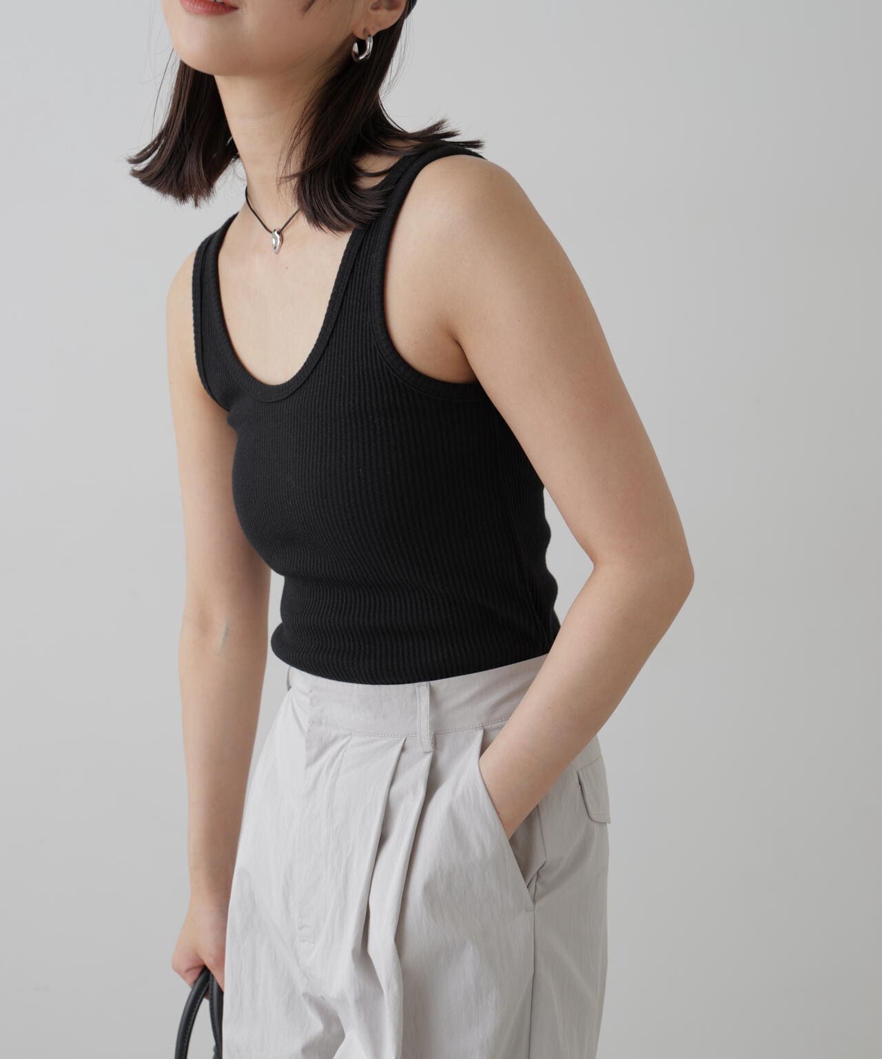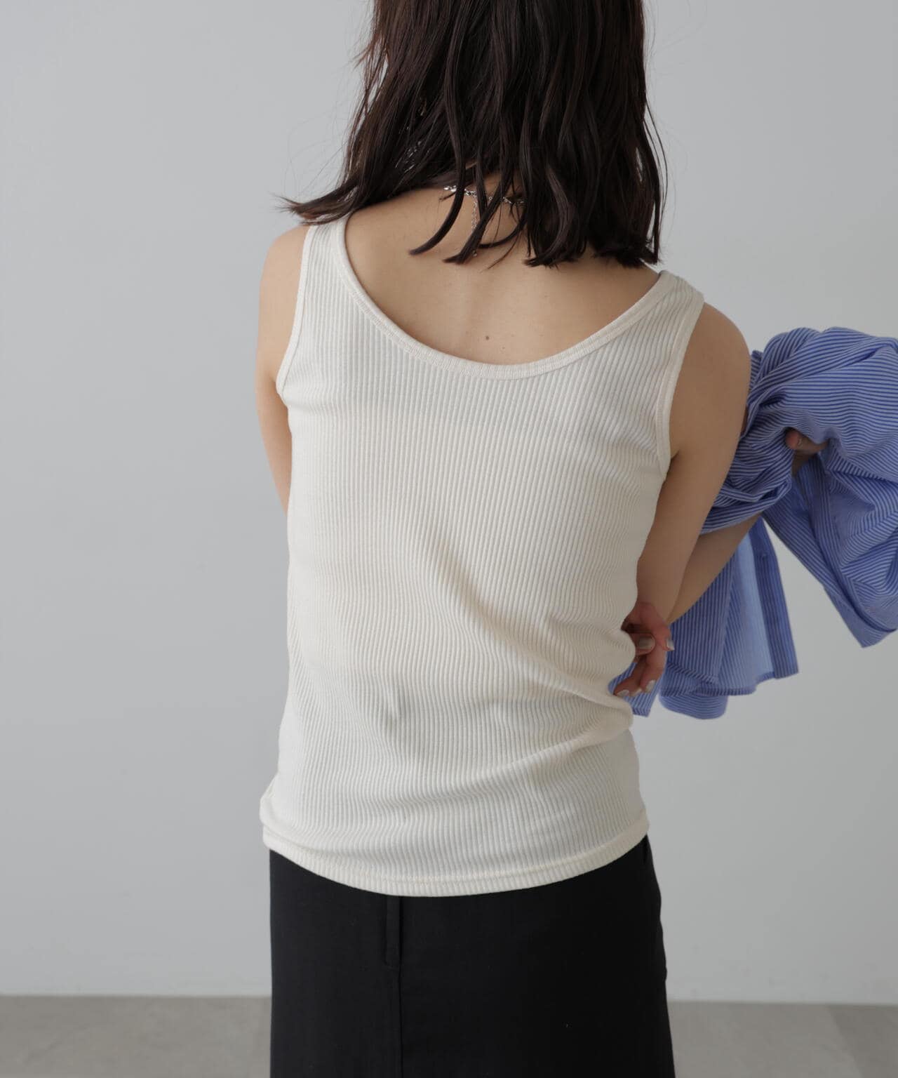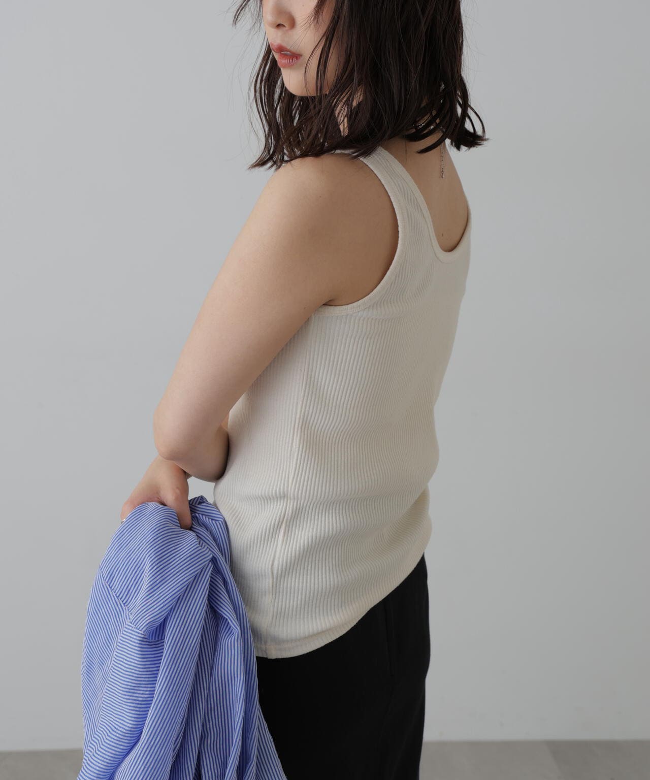 日常で着まわせるシンプルなタンクトップ。ベーシックなアイテムだからこそ、胸元の開き具合やシルエットに拘ったデザインです。キャミソールとタンクの中間的な肩まわりに仕上げることで、コーディネートに取り入れやすく絶妙な抜け感も。しっかりとした生地のインナーは合わせやすくてオススメです。