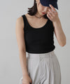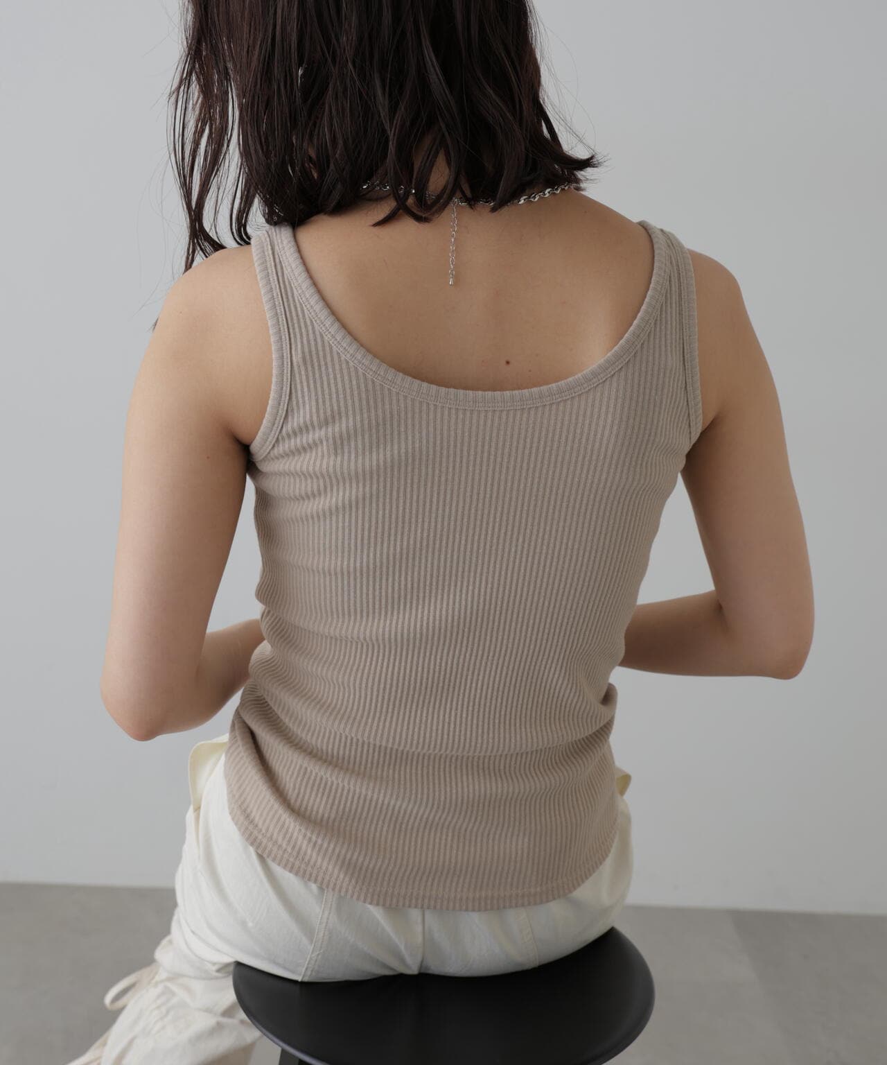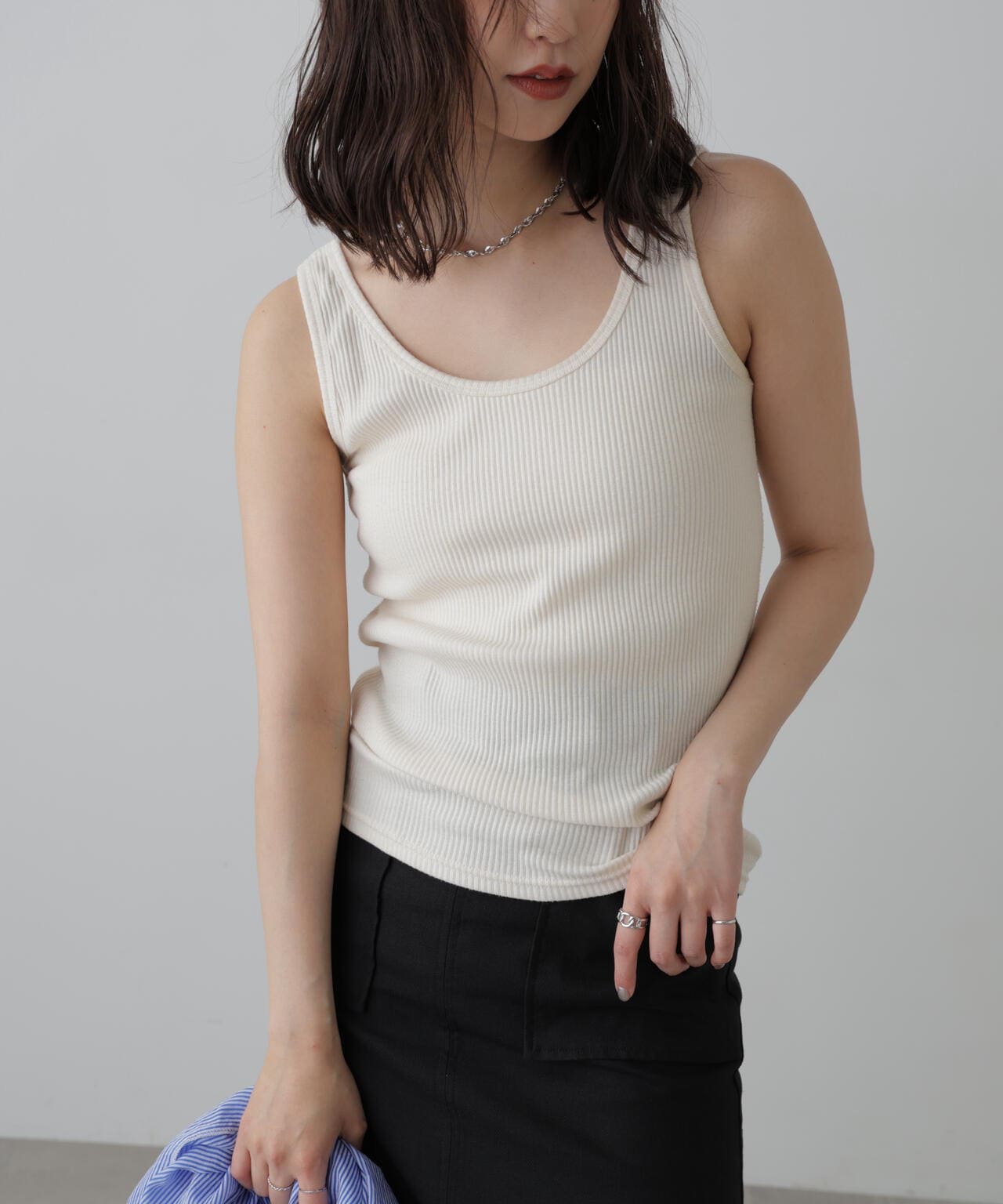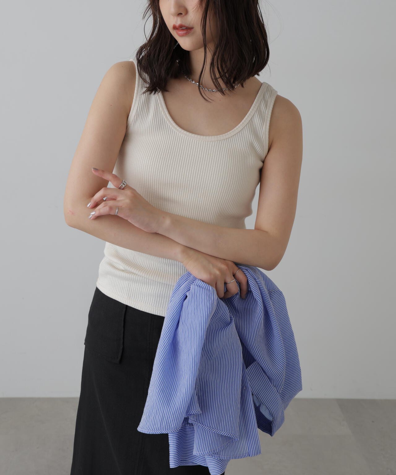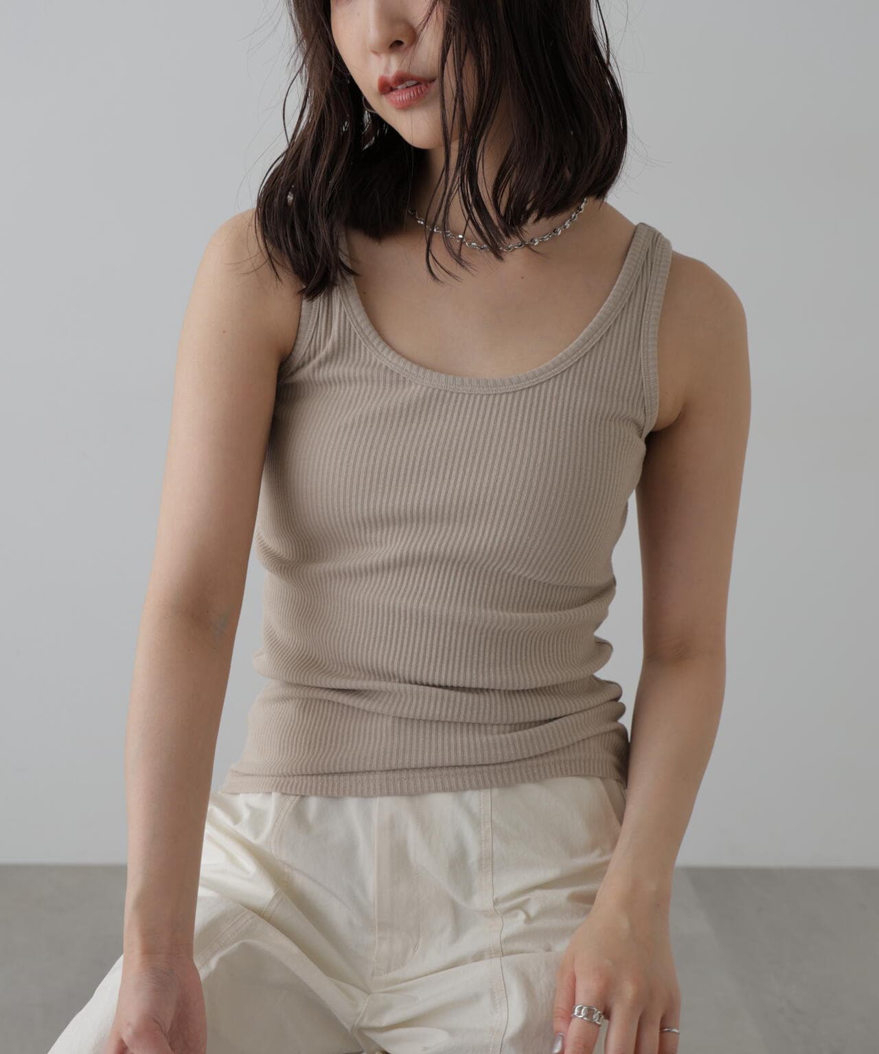 日常で着まわせるシンプルなタンクトップ。ベーシックなアイテムだからこそ、胸元の開き具合やシルエットに拘ったデザインです。キャミソールとタンクの中間的な肩まわりに仕上げることで、コーディネートに取り入れやすく絶妙な抜け感も。しっかりとした生地のインナーは合わせやすくてオススメです。