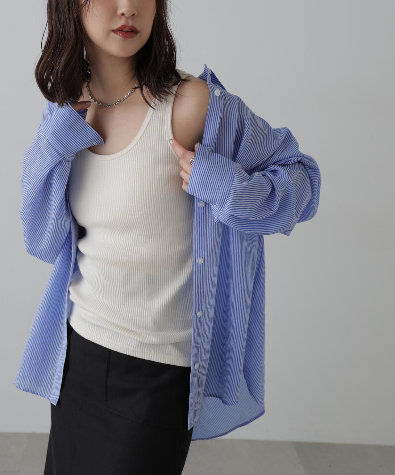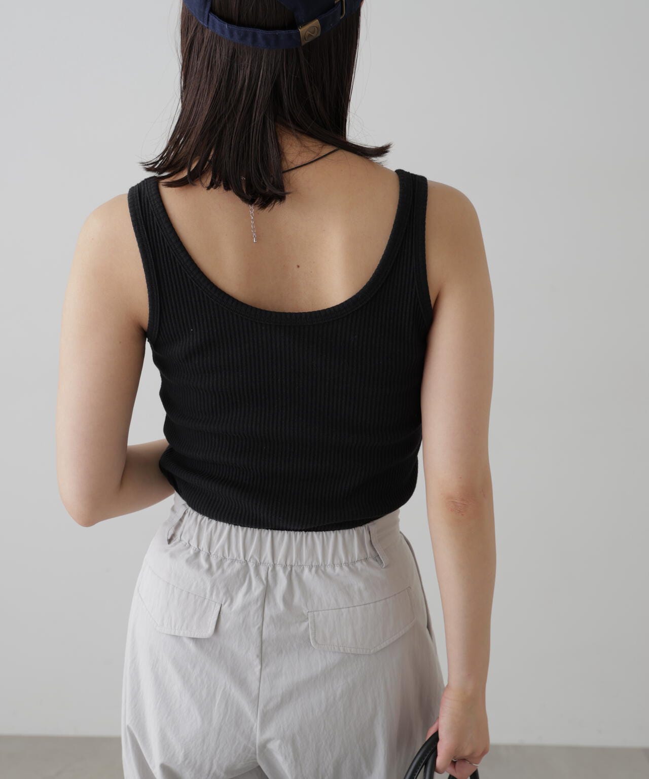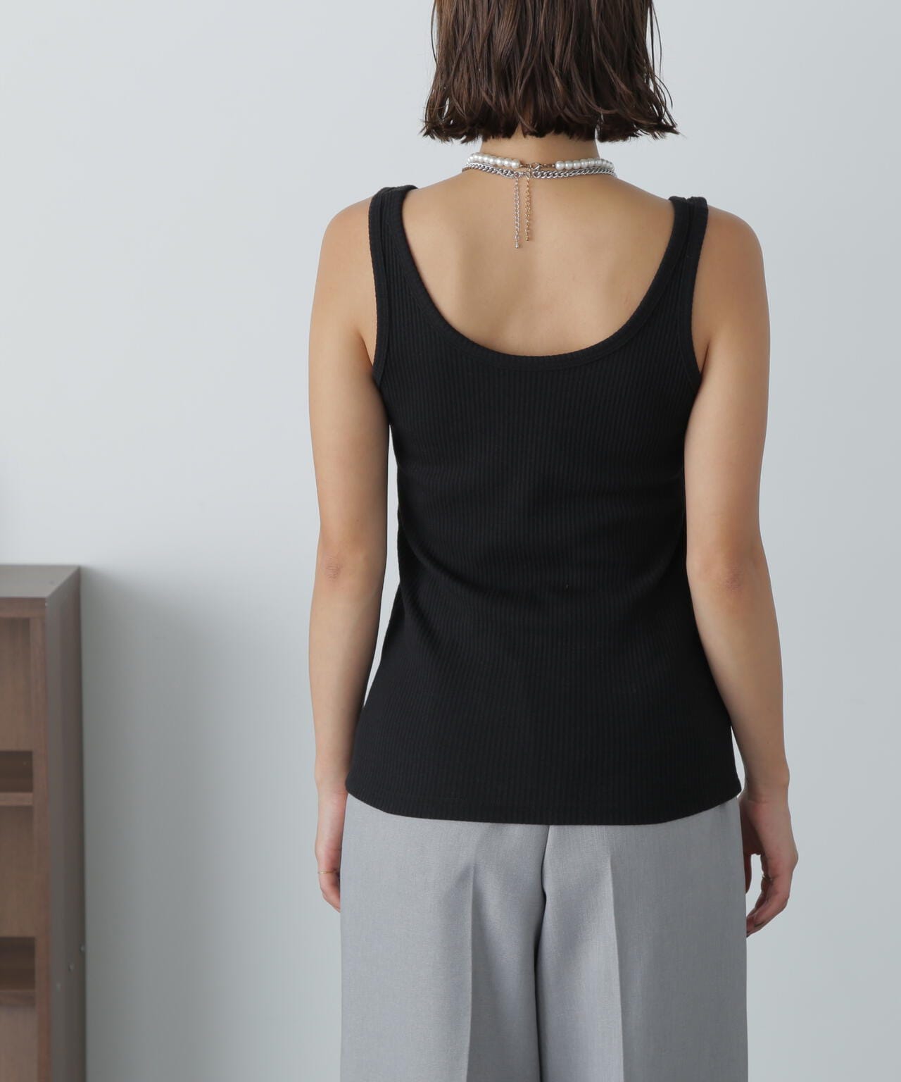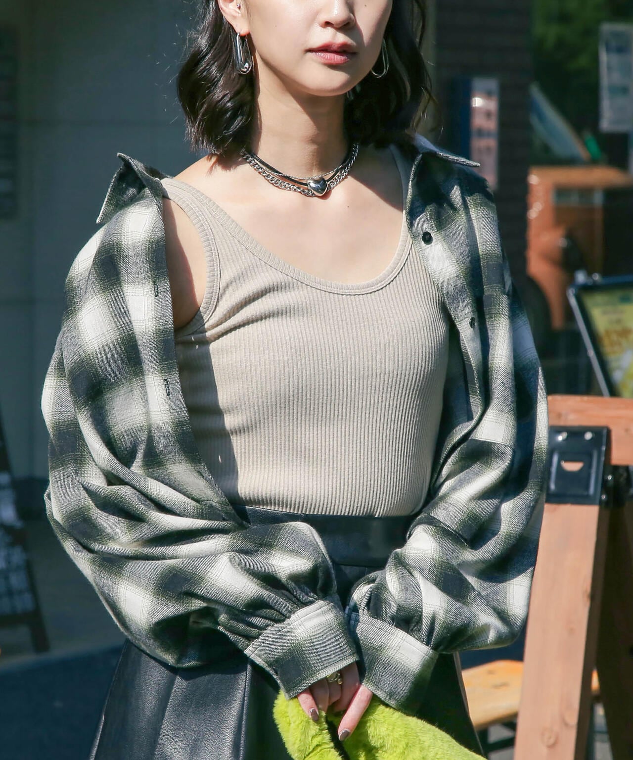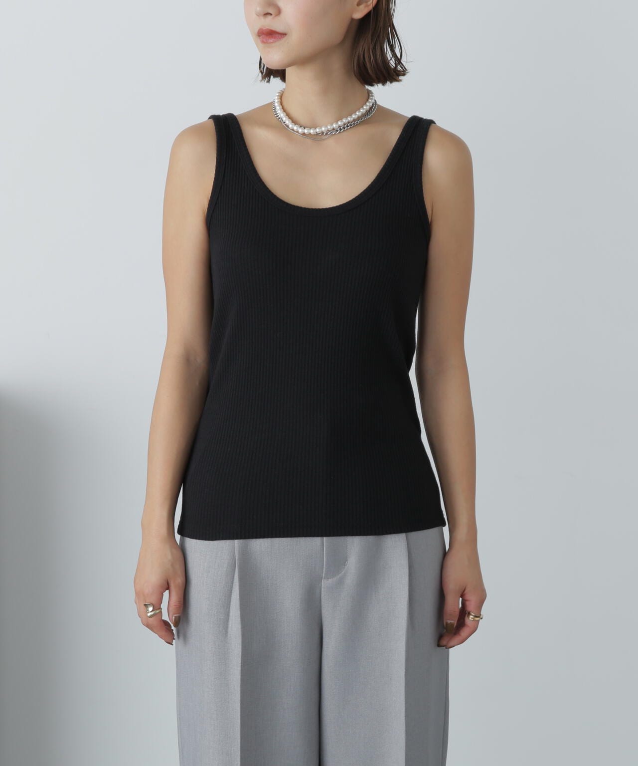 日常で着まわせるシンプルなタンクトップ。ベーシックなアイテムだからこそ、胸元の開き具合やシルエットに拘ったデザインです。キャミソールとタンクの中間的な肩まわりに仕上げることで、コーディネートに取り入れやすく絶妙な抜け感も。しっかりとした生地のインナーは合わせやすくてオススメです。
