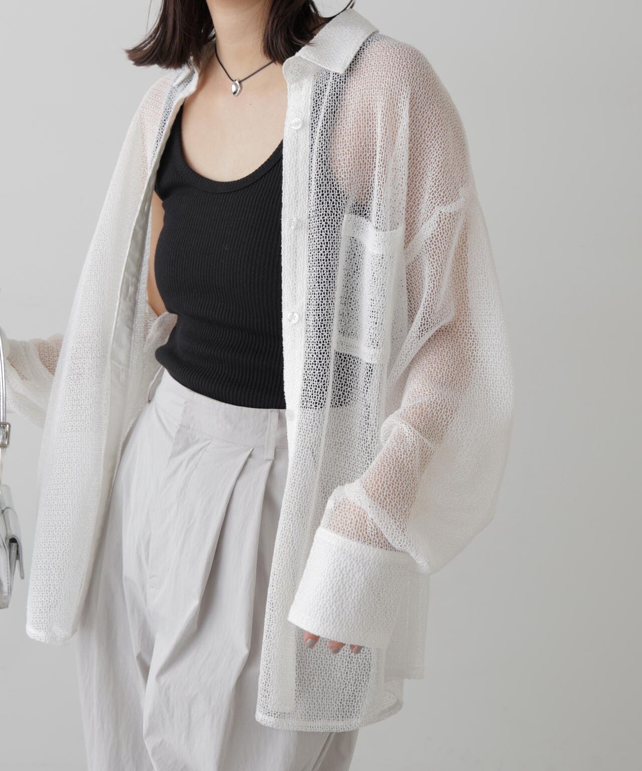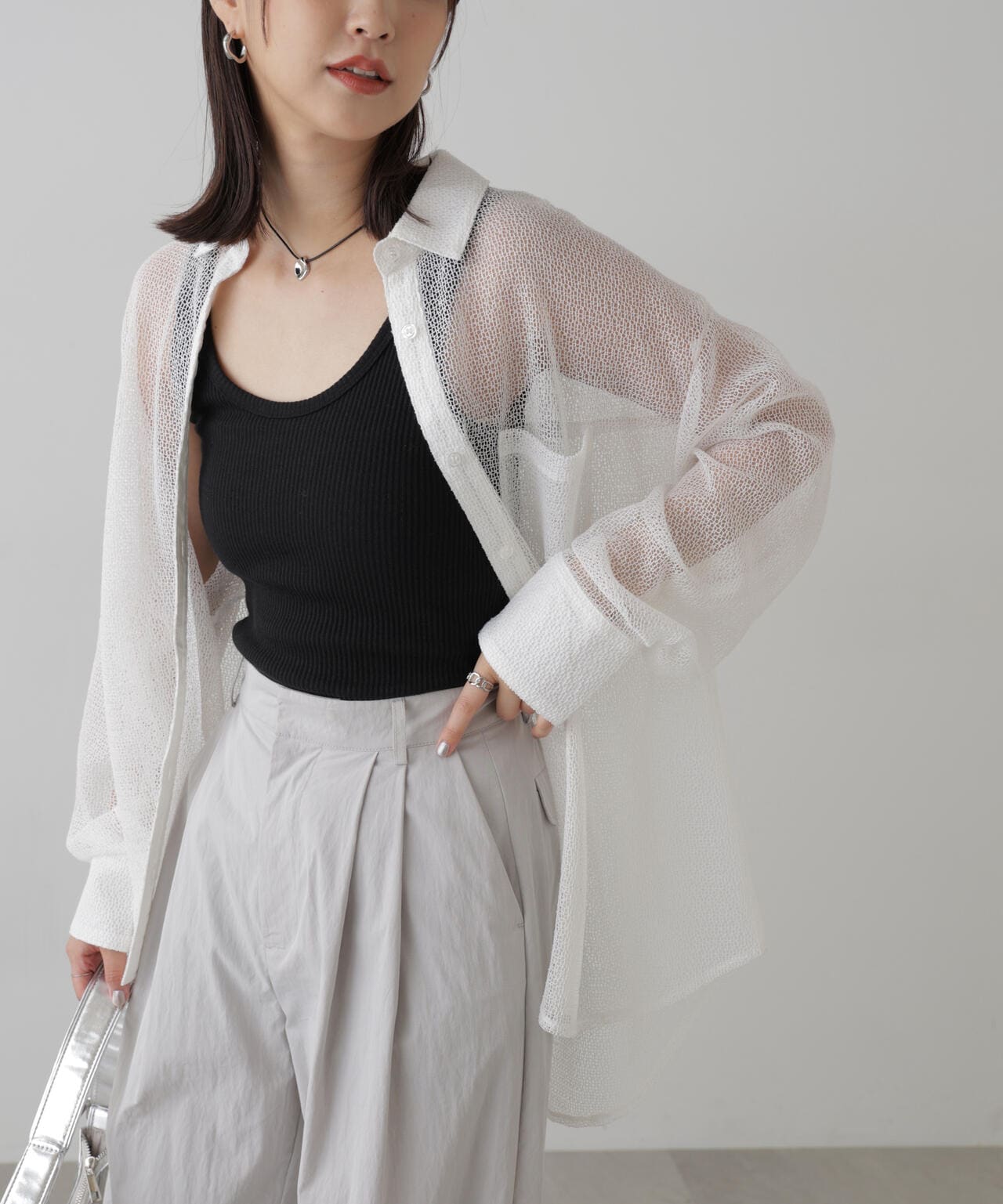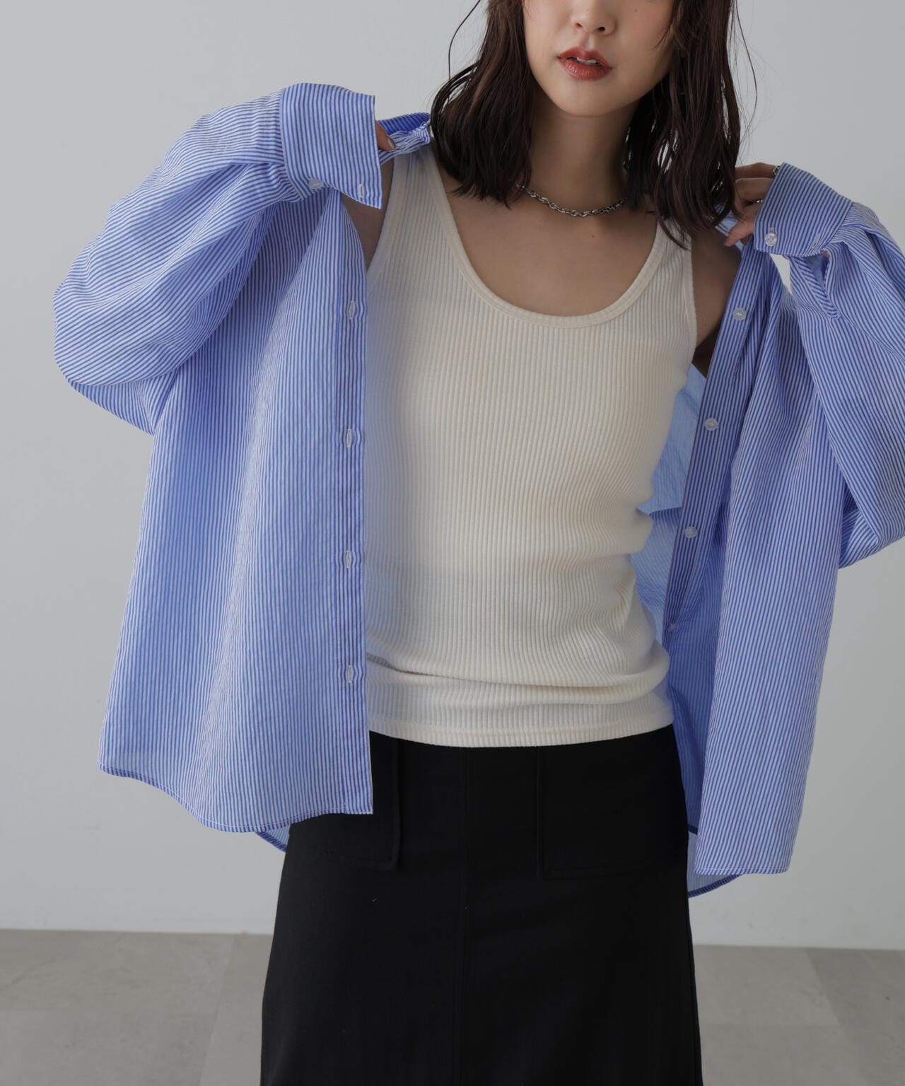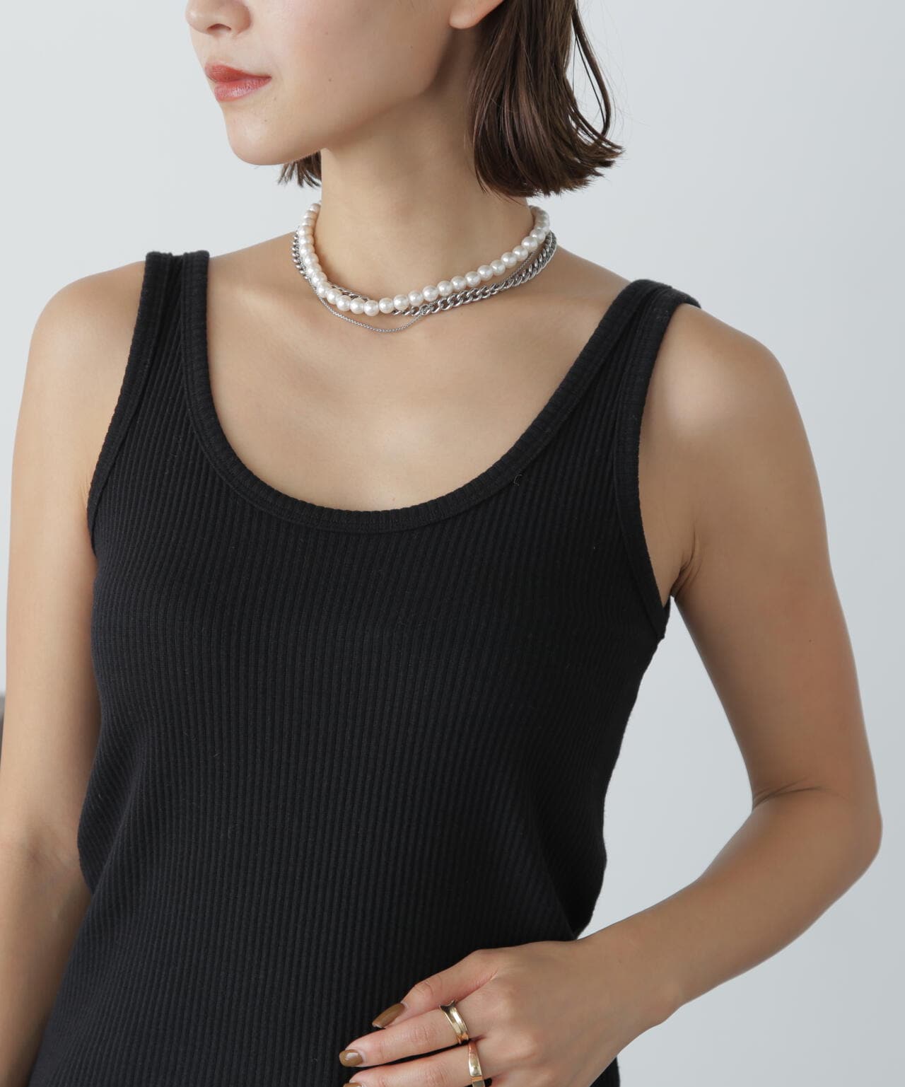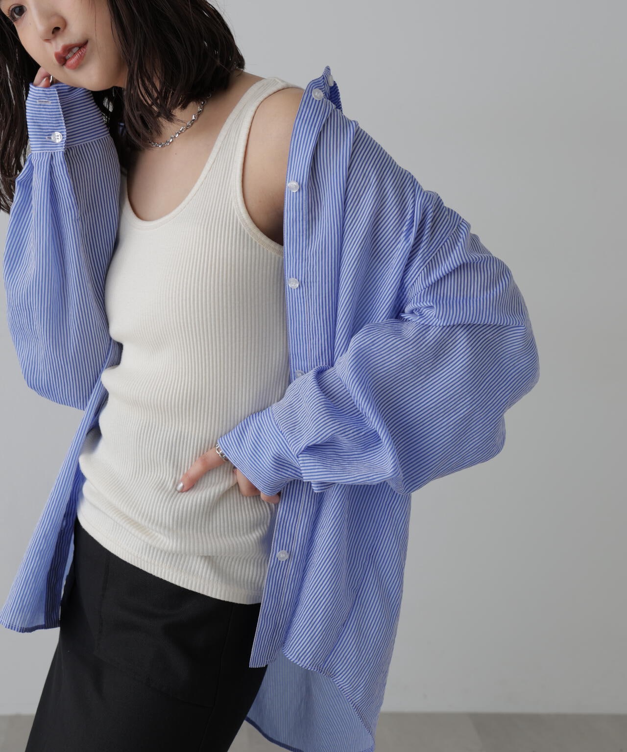 日常で着まわせるシンプルなタンクトップ。ベーシックなアイテムだからこそ、胸元の開き具合やシルエットに拘ったデザインです。キャミソールとタンクの中間的な肩まわりに仕上げることで、コーディネートに取り入れやすく絶妙な抜け感も。しっかりとした生地のインナーは合わせやすくてオススメです。