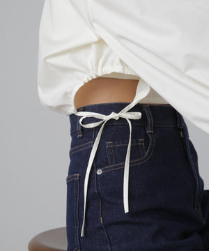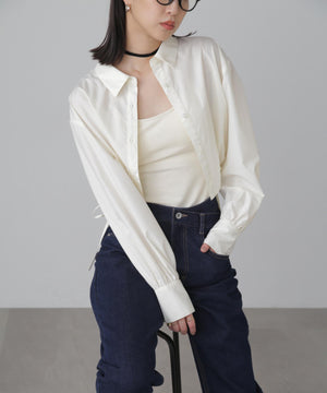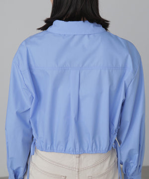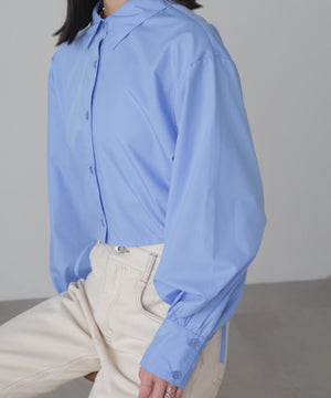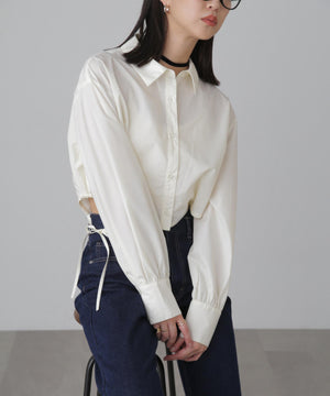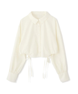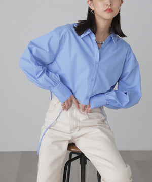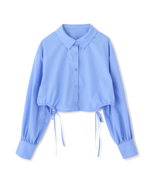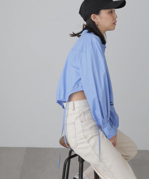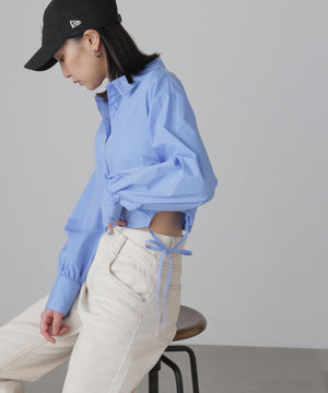 脇がカッティングされているショート丈のシャツです。裾は紐を通しているので、お好みで絞れるドロスト仕様。紐を垂らしても脇で結んでも可愛らしいポイントに。ショート丈なので、ハイウエストボトムスと合わせるとスタイルUPできます。1枚でトップス使いもでき、ノースリーブトップスやワンピースの上に羽織るなど、使い勝手が良いアイテムです。