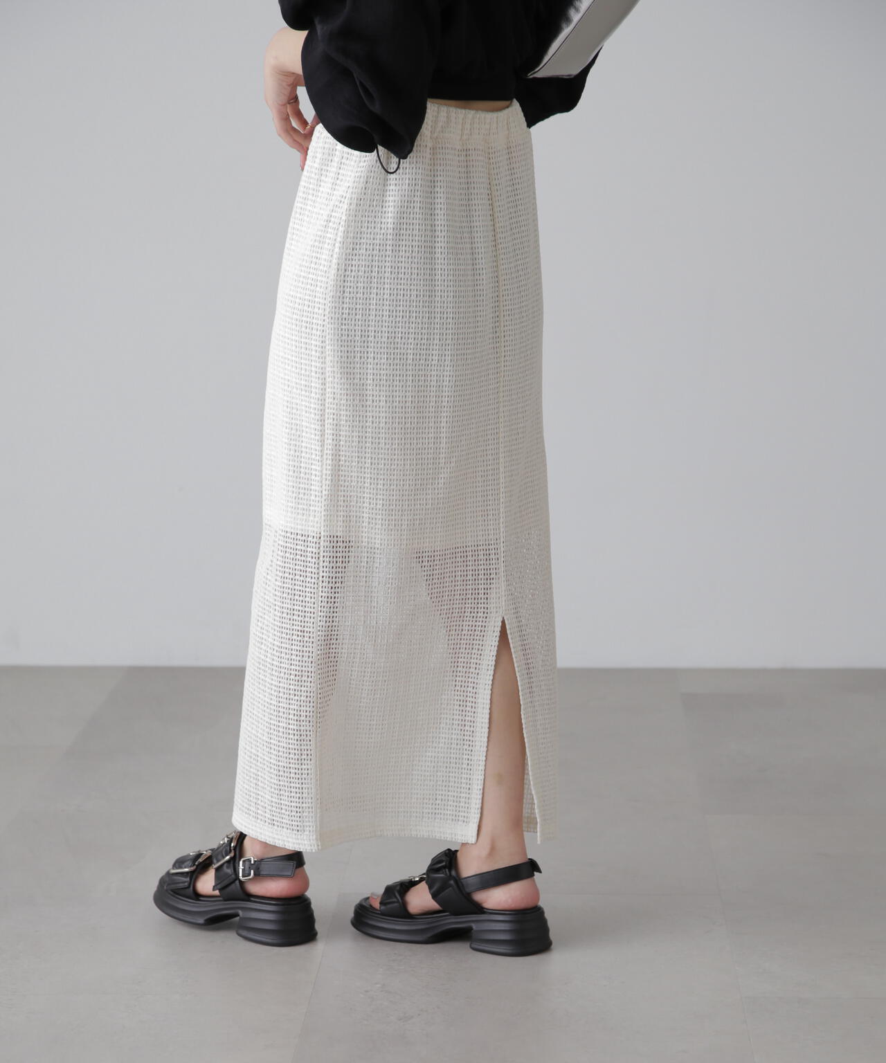 透け感が可愛らしいメッシュナロースカート。少し表面感のある綿タッチのメッシュ生地を使用しています。裏地は膝上あたりまで付けており、透け感のあるメッシュ素材で足元は軽やかな肌見せを演出。ナローシルエットにはスリットが入っていて、スリットはお好きな位置に合わせて着ていただけます。トップスはビッグTシャツをウエストOUTで着ると春夏らしくておススメですが、ブラウスやシャツ合わせも似合う便利な一枚です。