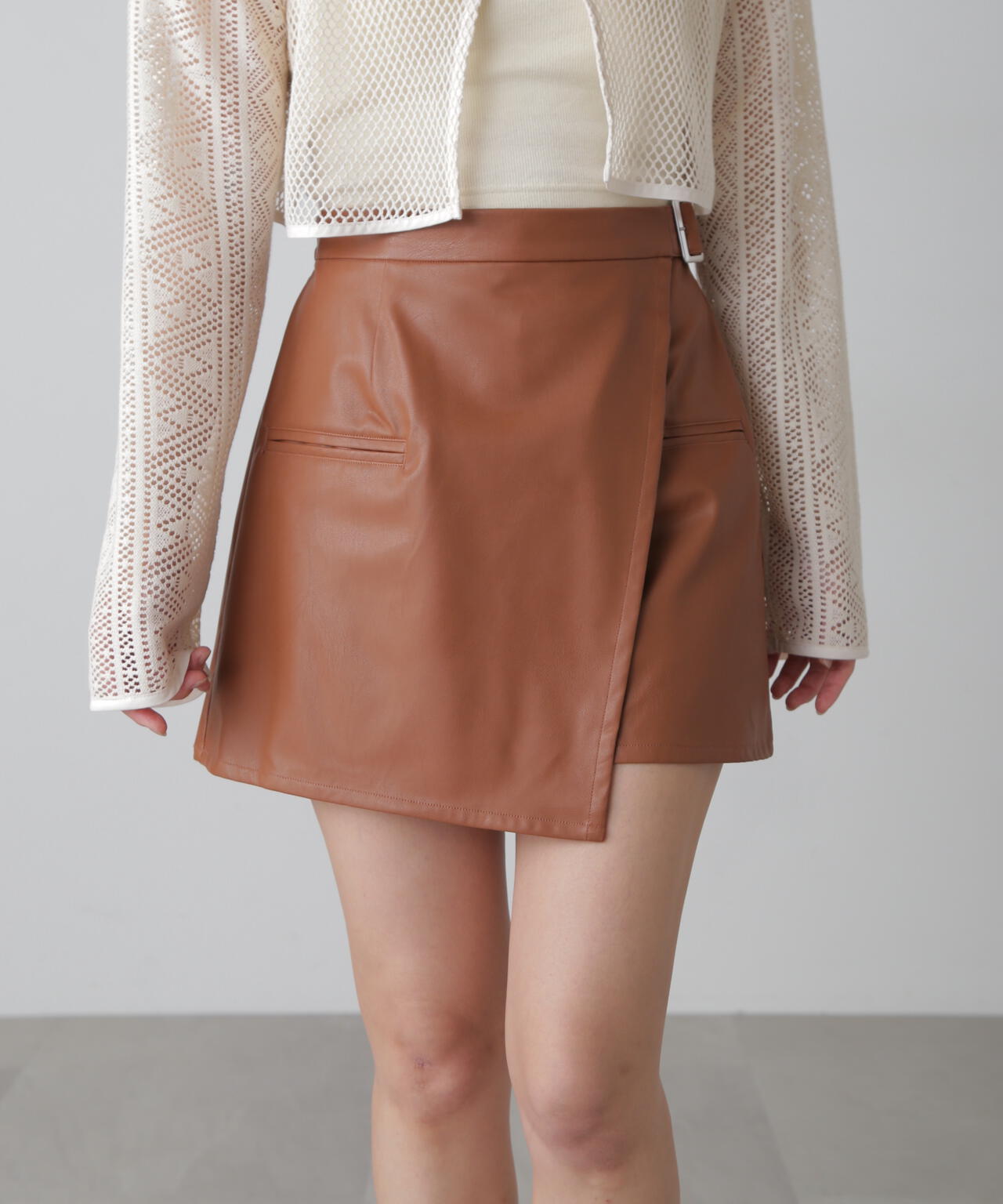 薄手のフェイクレザーを使用したミニスカパン。中はパンツ仕様なので安心感のあるはき心地です。前から見るとラップスカートのようなデザインで、ウエスト部分にシルバーバックルのベルトが付いているのがポイント。スカートの前身頃には玉縁ポケットをつけてシンプルになりすぎないデザインに。センターバックがファスナーで開閉可能なので楽に着脱できます。秋冬にぴったりのレザー素材なのでニットやスウェットをウエストOUTで合わせて裾からチラ見せするのが可愛いです。足元はブーツスタイルがおすすめです。