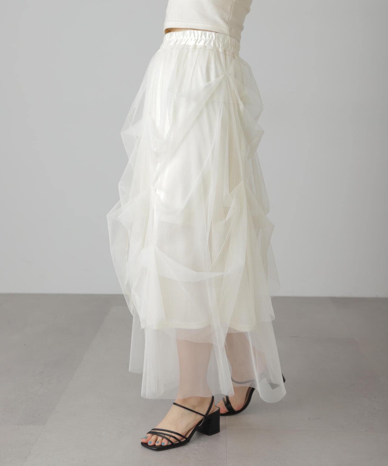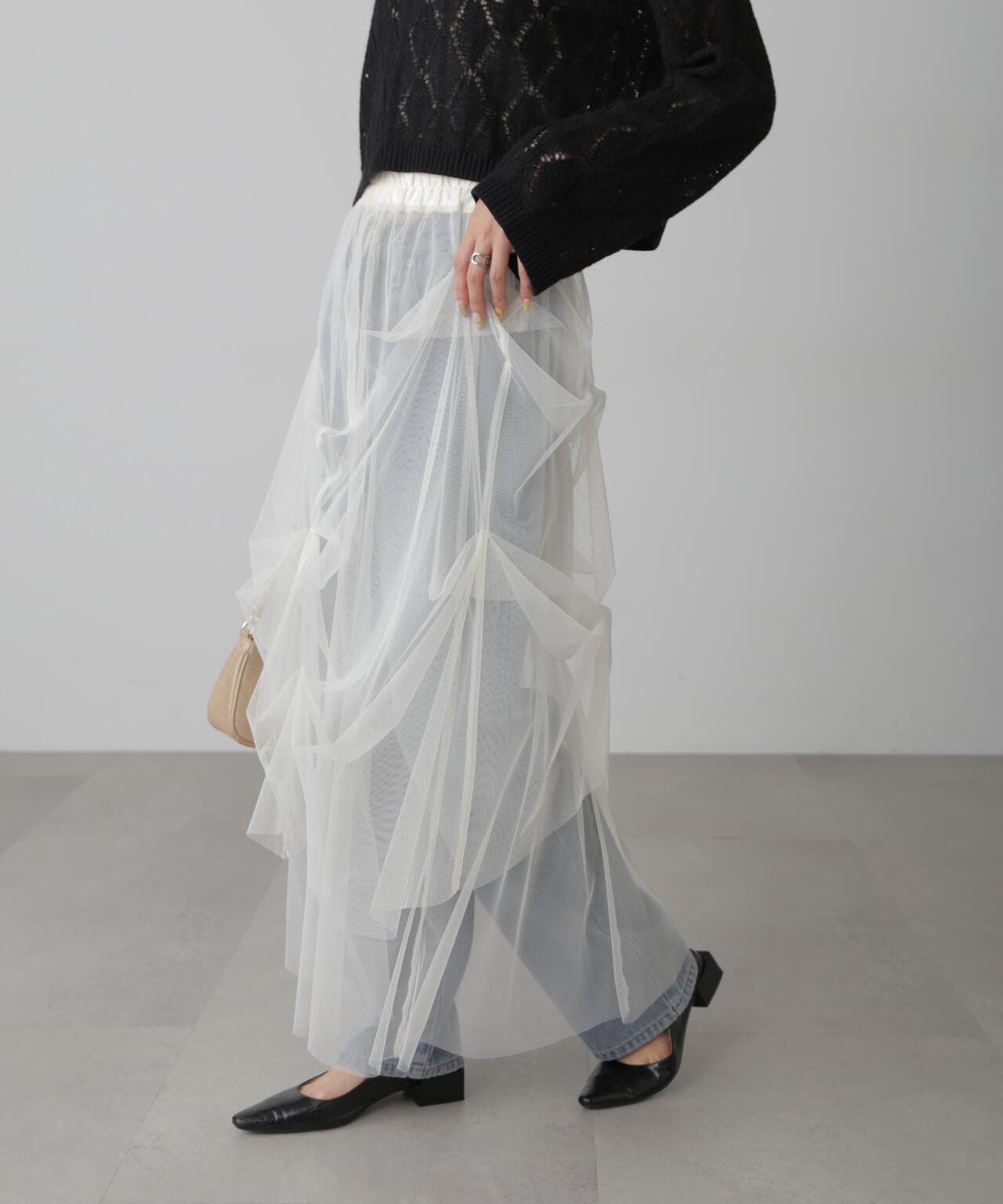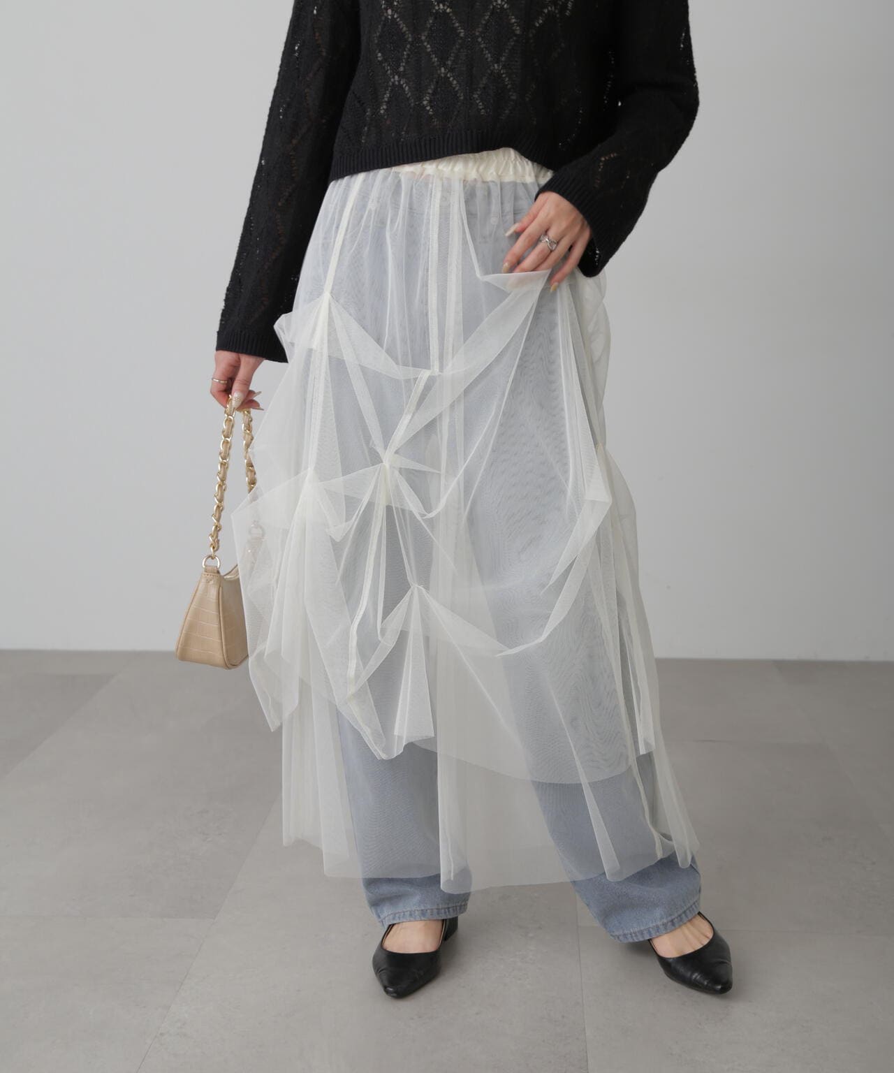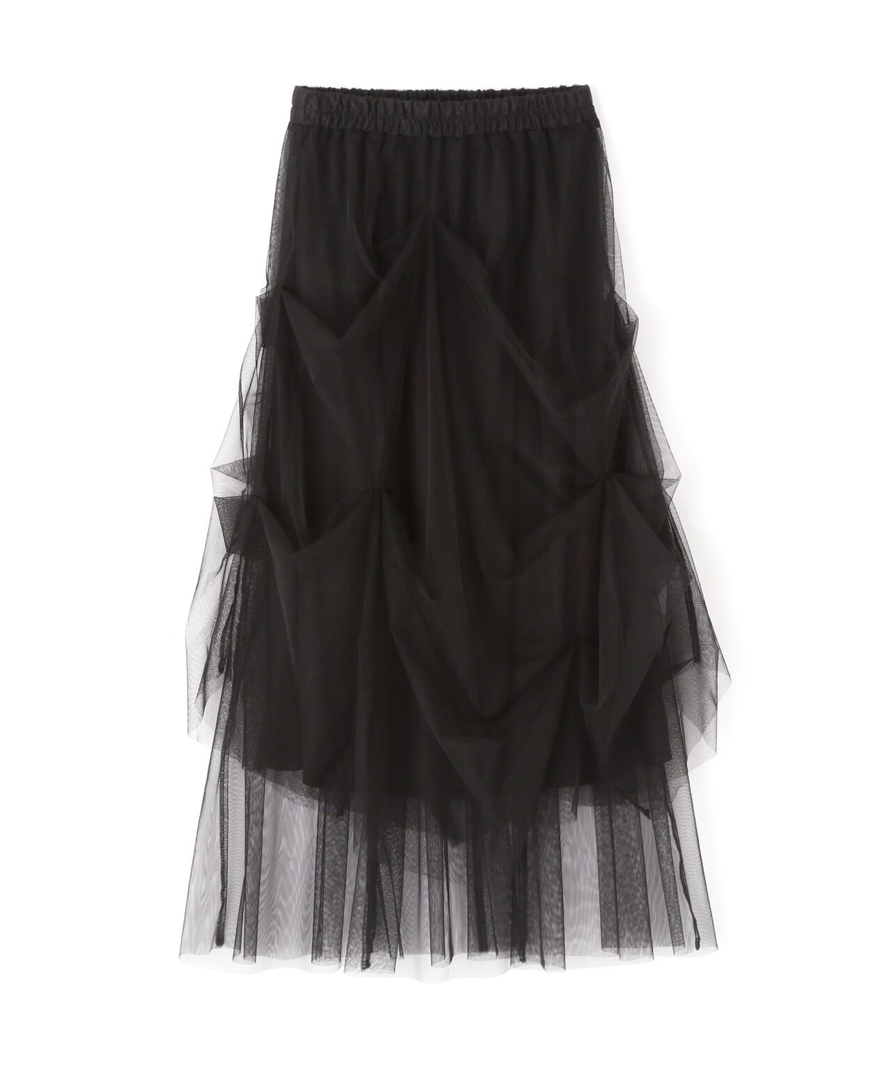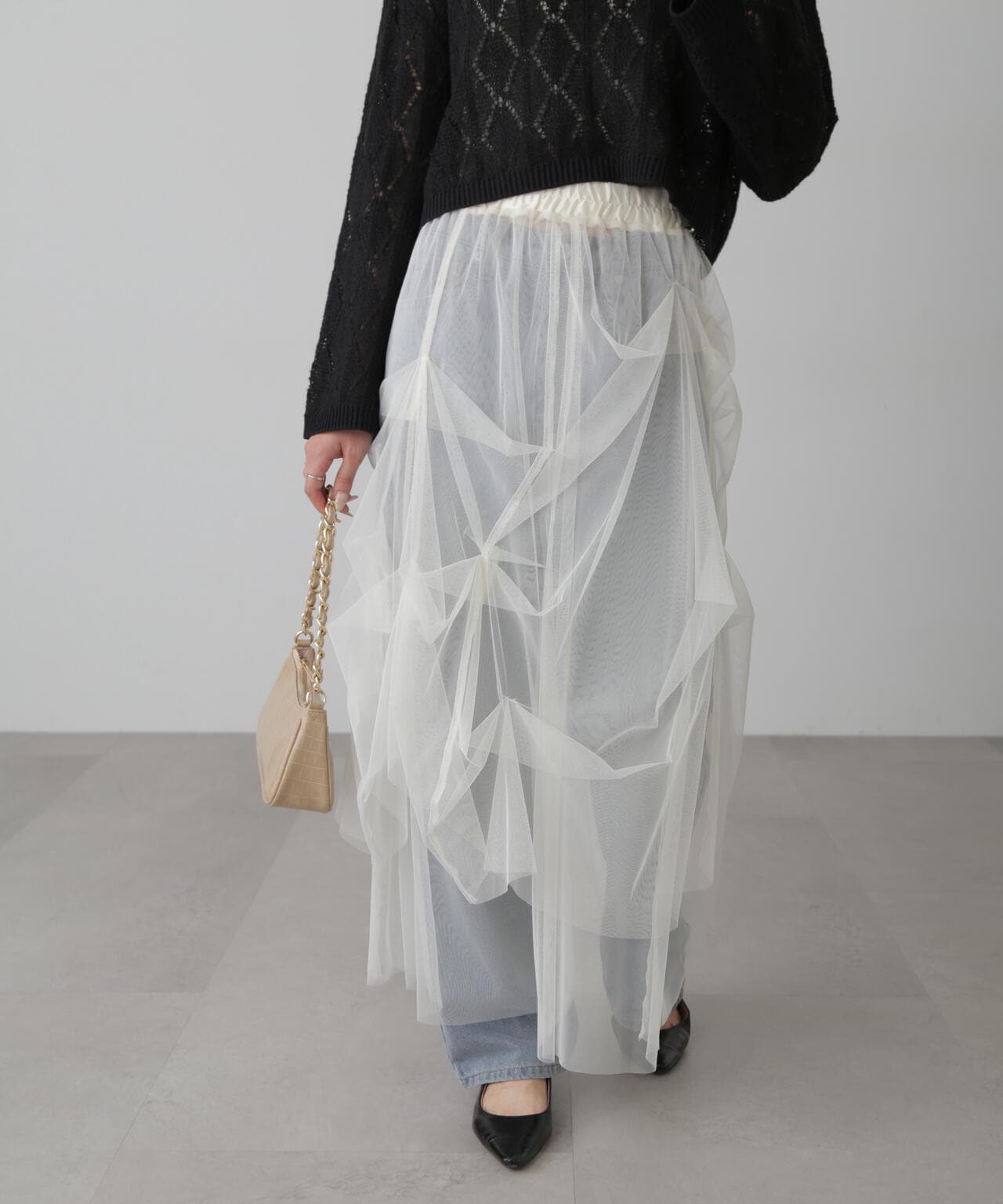 チュールを2枚仕立てにし、ランダム&イレギュラーにタックを入れたデコラティブなデザインスカート。別付けのペチコートが付いているので、透けの心配なく着用していただけます。裏地はペチコートになっているので、チュールを透けさせデニムパンツとレイヤードさせプリントTと合わせたカジュアルなスタイリングがおススメです。トップスを無地Tやタンクで、レディなシューズと合わせてきれいめスタイルにも合います。1枚で主役になってくれるキャッチーなデザインで、今季おススメのアイテムです。