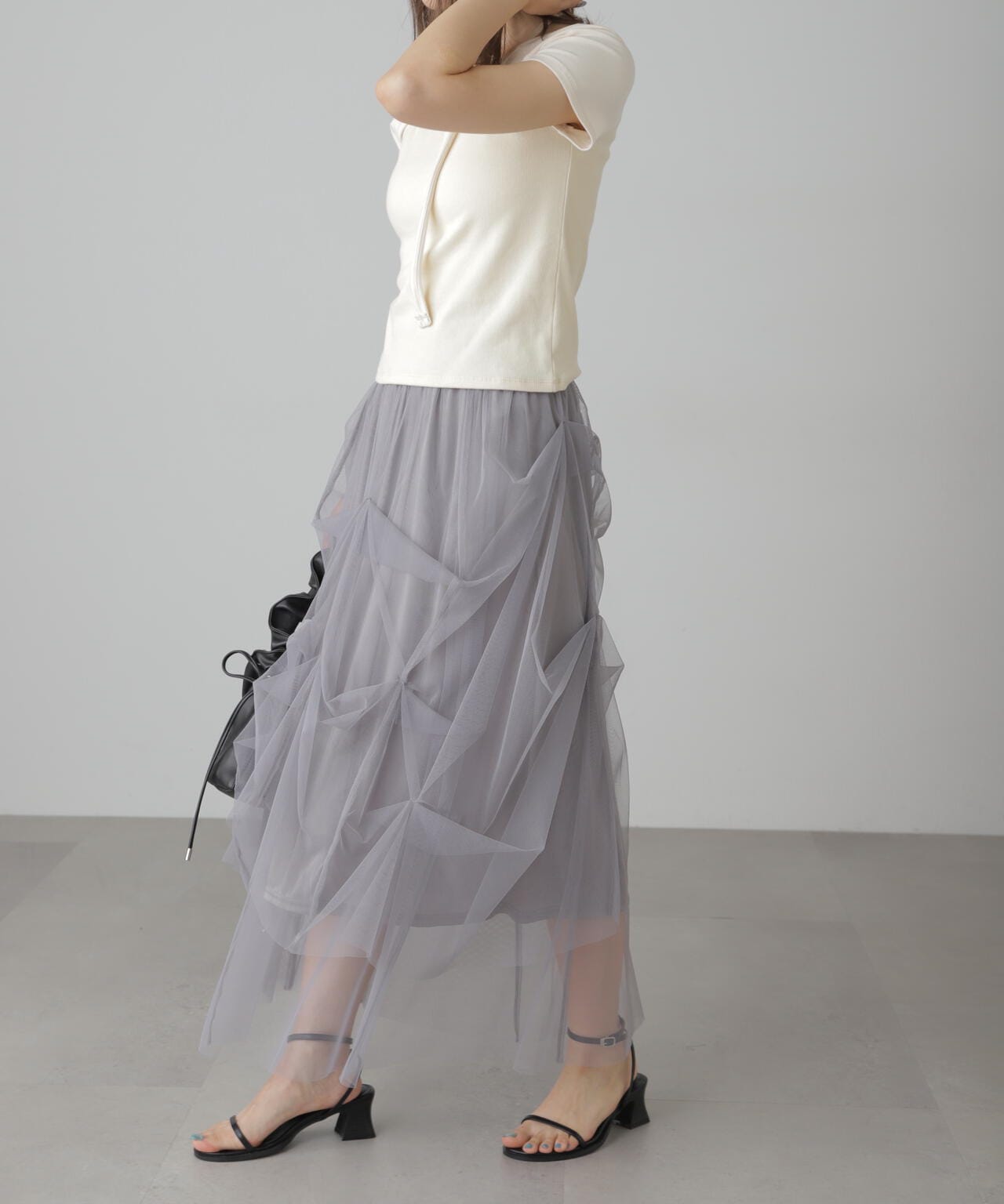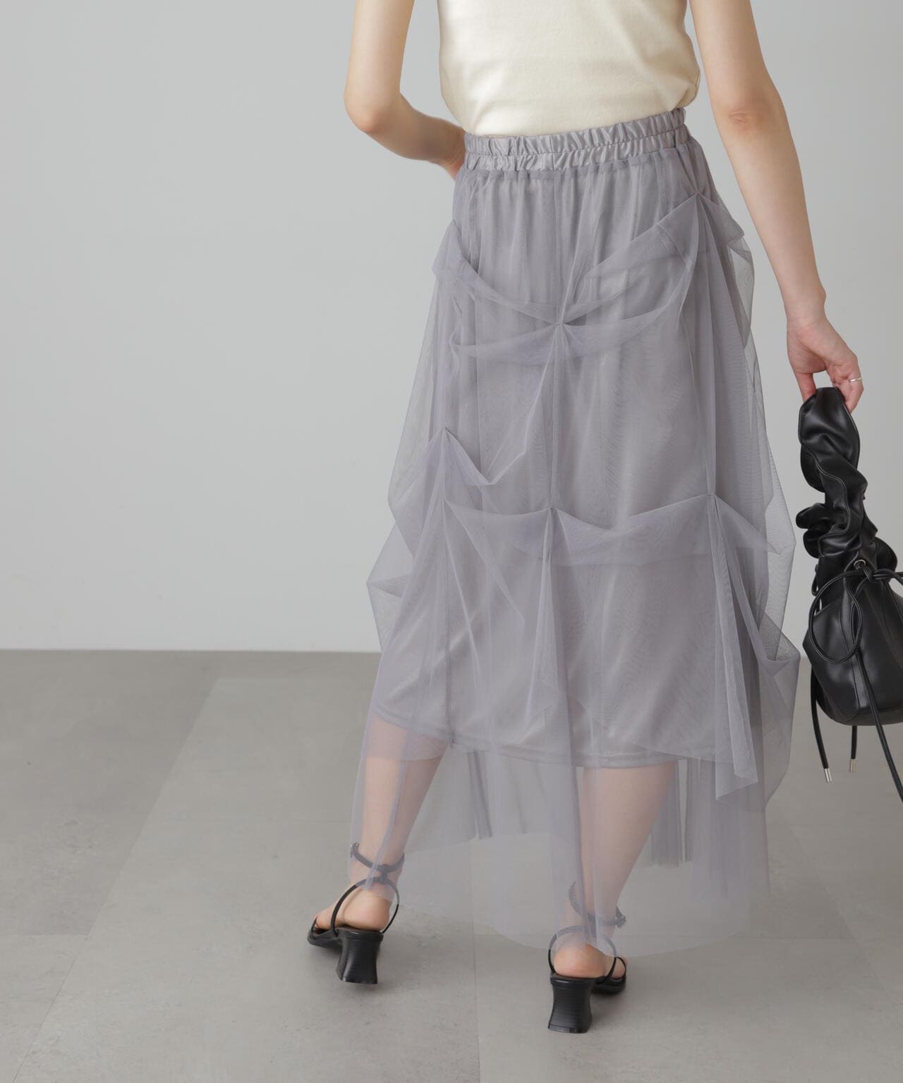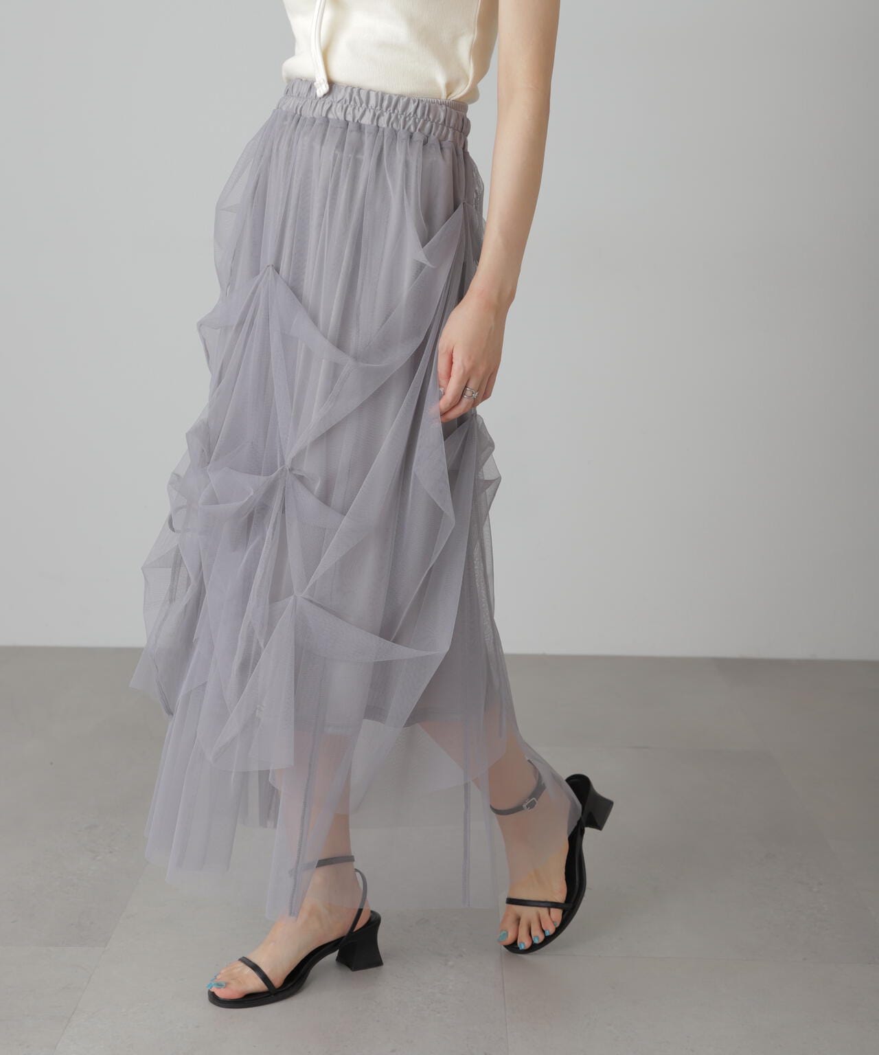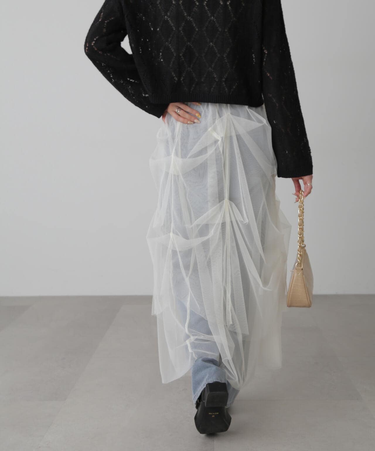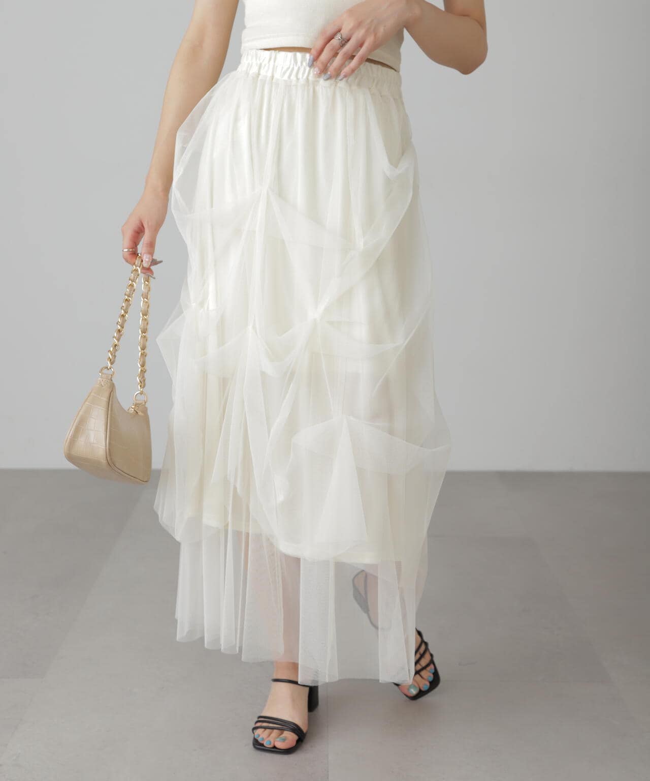 チュールを2枚仕立てにし、ランダム&イレギュラーにタックを入れたデコラティブなデザインスカート。別付けのペチコートが付いているので、透けの心配なく着用していただけます。裏地はペチコートになっているので、チュールを透けさせデニムパンツとレイヤードさせプリントTと合わせたカジュアルなスタイリングがおススメです。トップスを無地Tやタンクで、レディなシューズと合わせてきれいめスタイルにも合います。1枚で主役になってくれるキャッチーなデザインで、今季おススメのアイテムです。