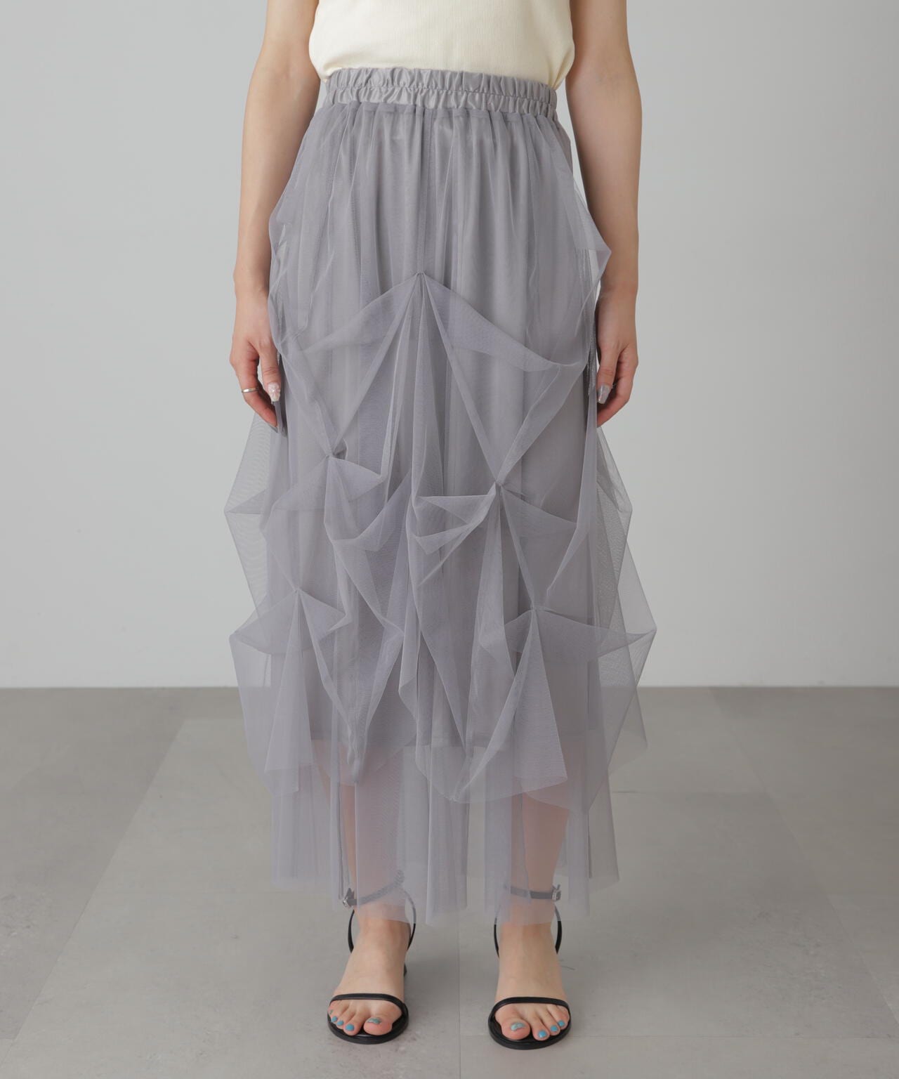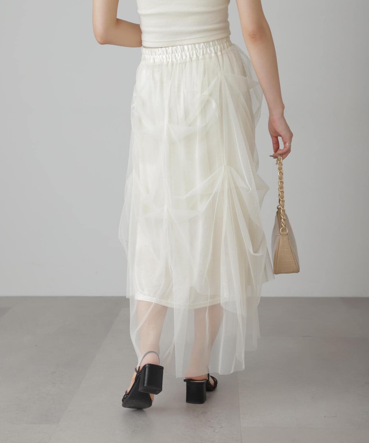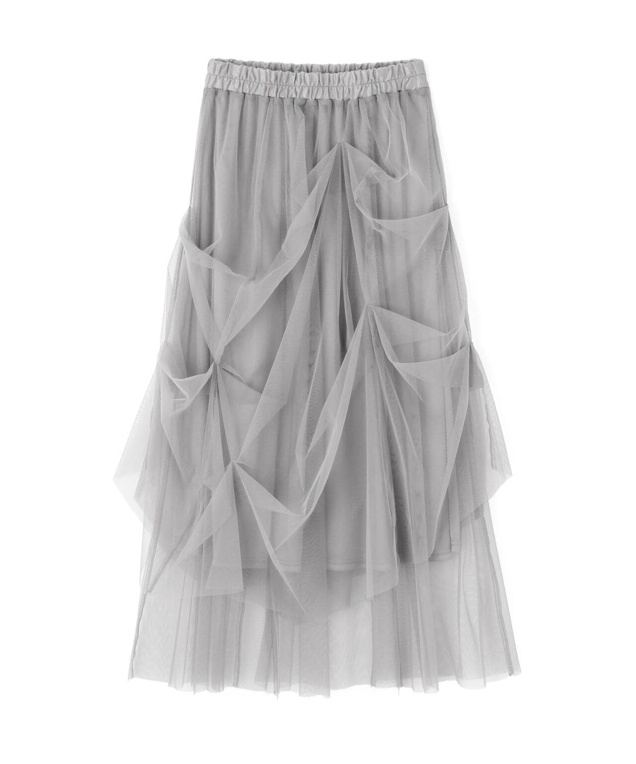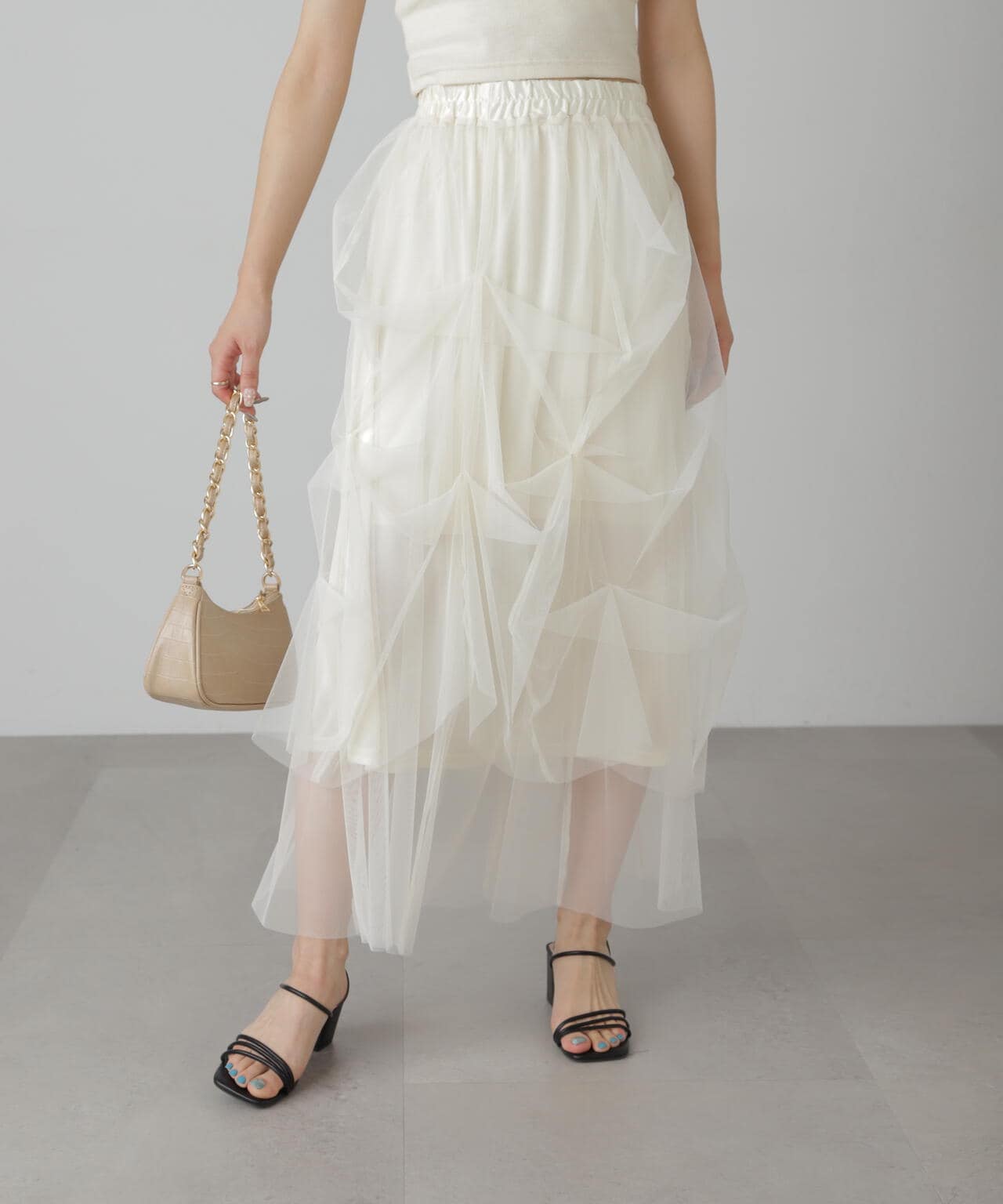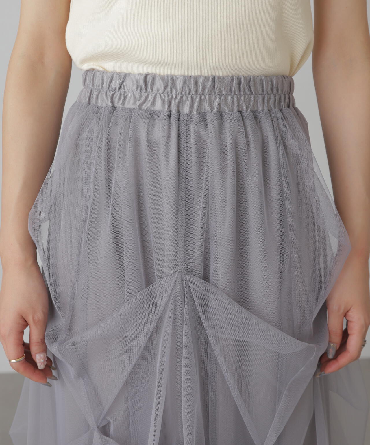 チュールを2枚仕立てにし、ランダム&イレギュラーにタックを入れたデコラティブなデザインスカート。別付けのペチコートが付いているので、透けの心配なく着用していただけます。裏地はペチコートになっているので、チュールを透けさせデニムパンツとレイヤードさせプリントTと合わせたカジュアルなスタイリングがおススメです。トップスを無地Tやタンクで、レディなシューズと合わせてきれいめスタイルにも合います。1枚で主役になってくれるキャッチーなデザインで、今季おススメのアイテムです。