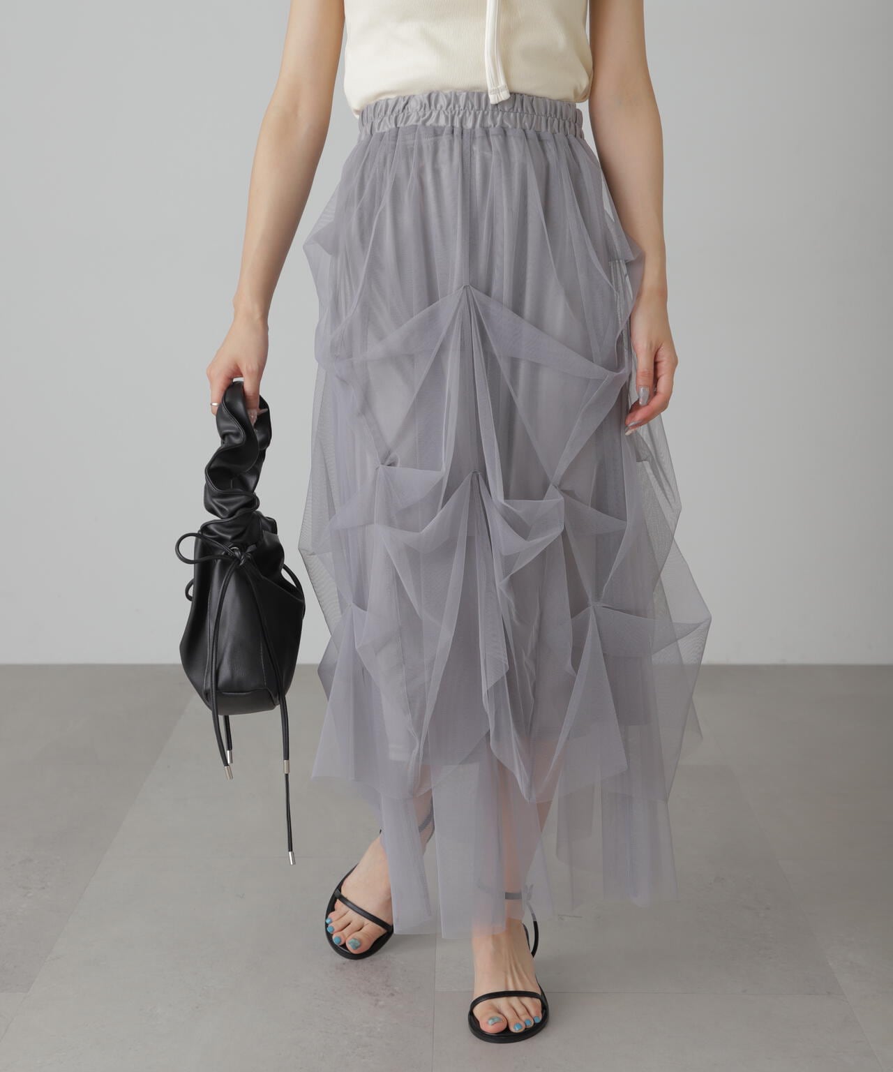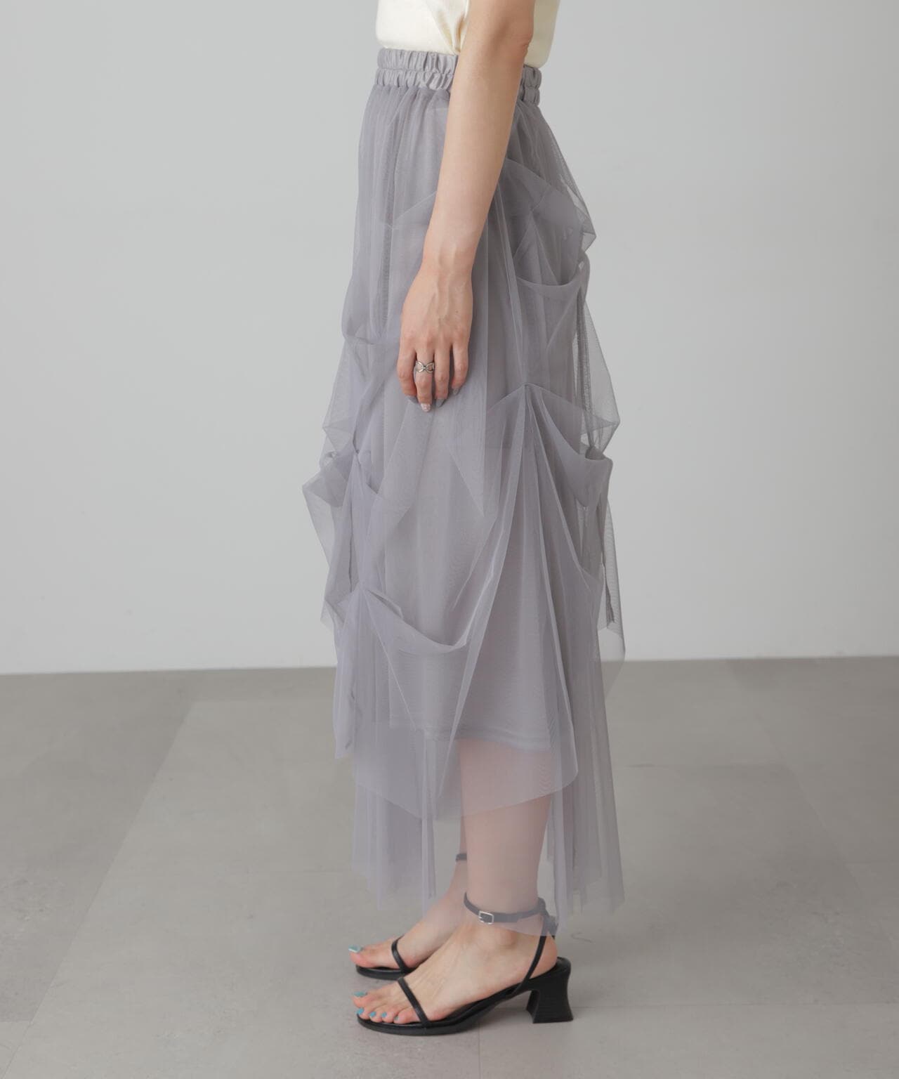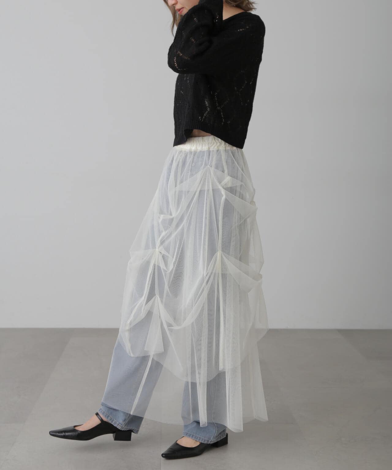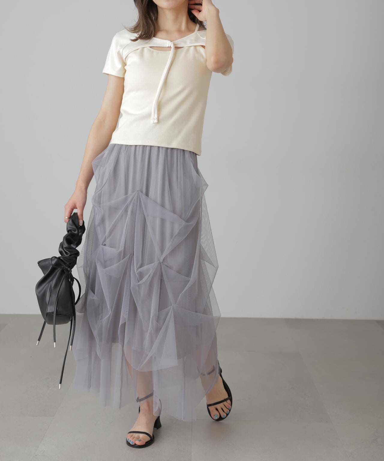 チュールを2枚仕立てにし、ランダム&イレギュラーにタックを入れたデコラティブなデザインスカート。別付けのペチコートが付いているので、透けの心配なく着用していただけます。裏地はペチコートになっているので、チュールを透けさせデニムパンツとレイヤードさせプリントTと合わせたカジュアルなスタイリングがおススメです。トップスを無地Tやタンクで、レディなシューズと合わせてきれいめスタイルにも合います。1枚で主役になってくれるキャッチーなデザインで、今季おススメのアイテムです。