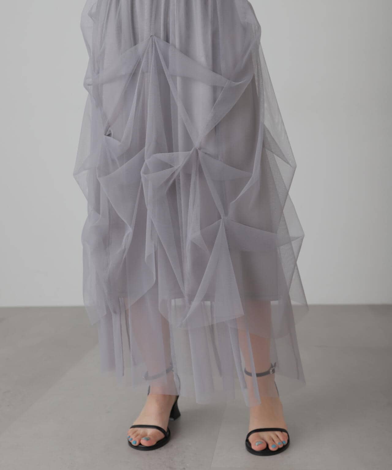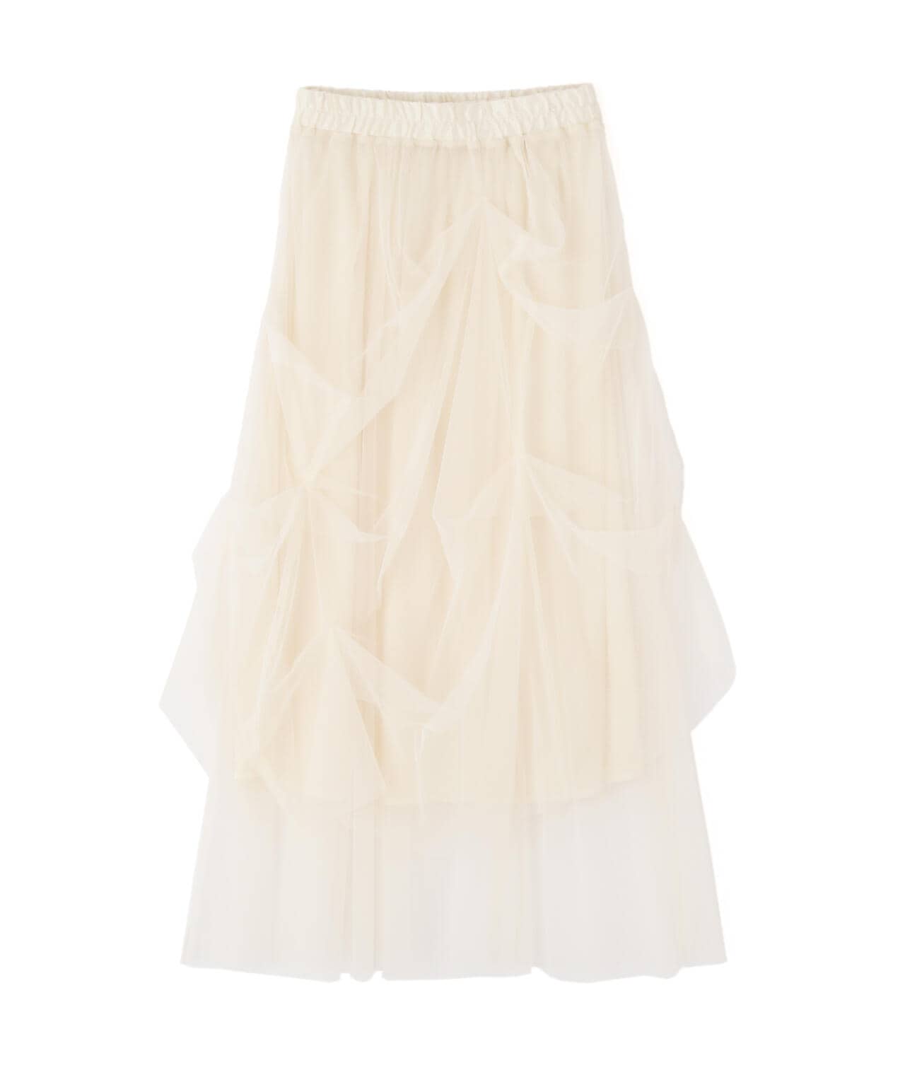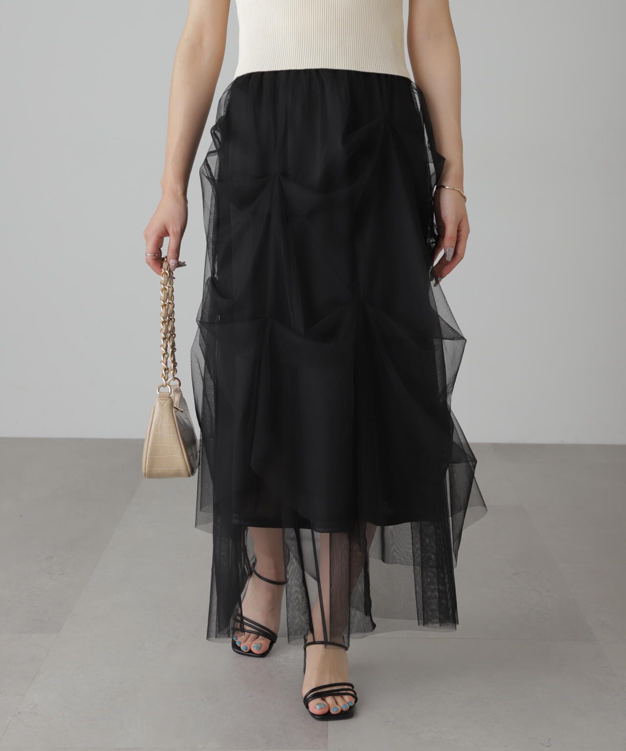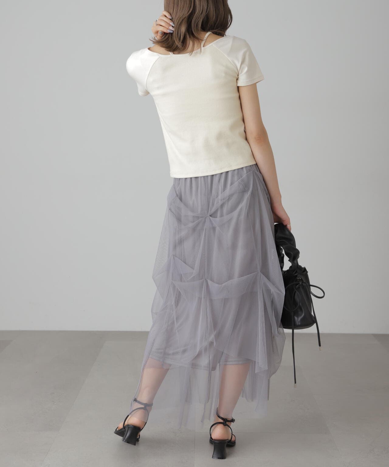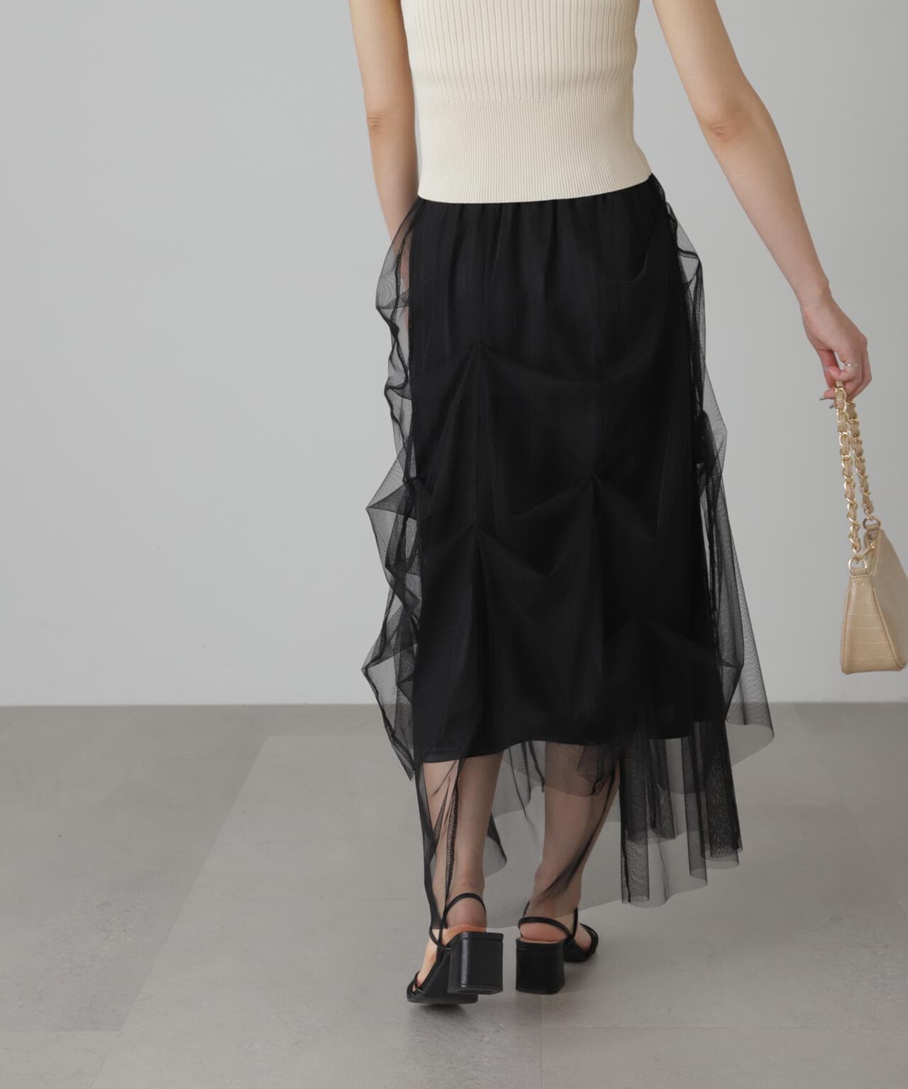 チュールを2枚仕立てにし、ランダム&イレギュラーにタックを入れたデコラティブなデザインスカート。別付けのペチコートが付いているので、透けの心配なく着用していただけます。裏地はペチコートになっているので、チュールを透けさせデニムパンツとレイヤードさせプリントTと合わせたカジュアルなスタイリングがおススメです。トップスを無地Tやタンクで、レディなシューズと合わせてきれいめスタイルにも合います。1枚で主役になってくれるキャッチーなデザインで、今季おススメのアイテムです。