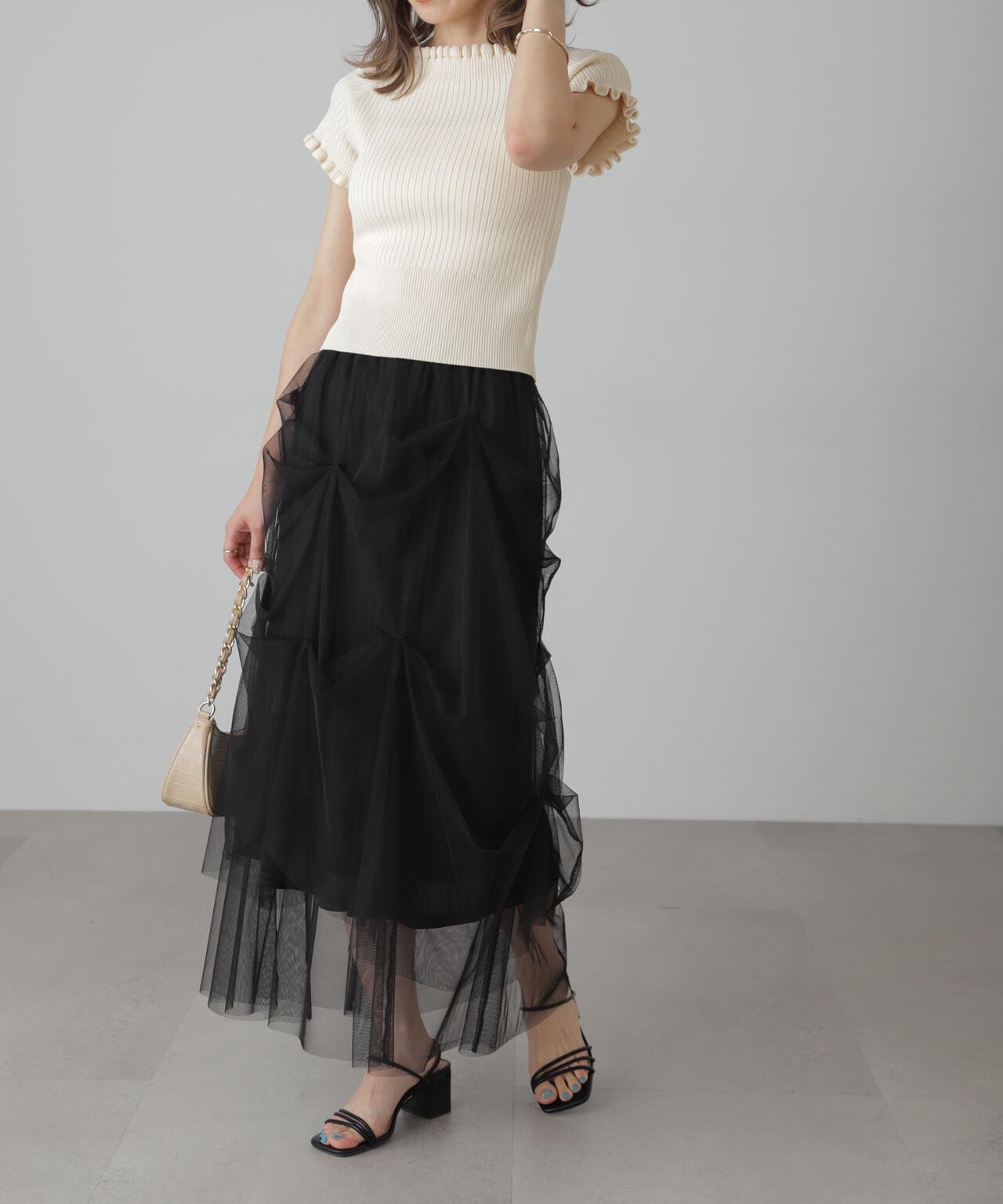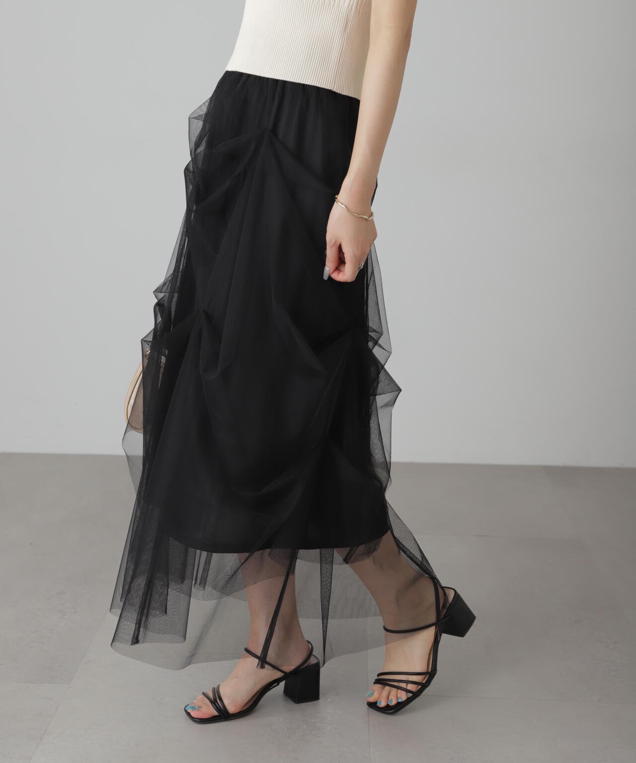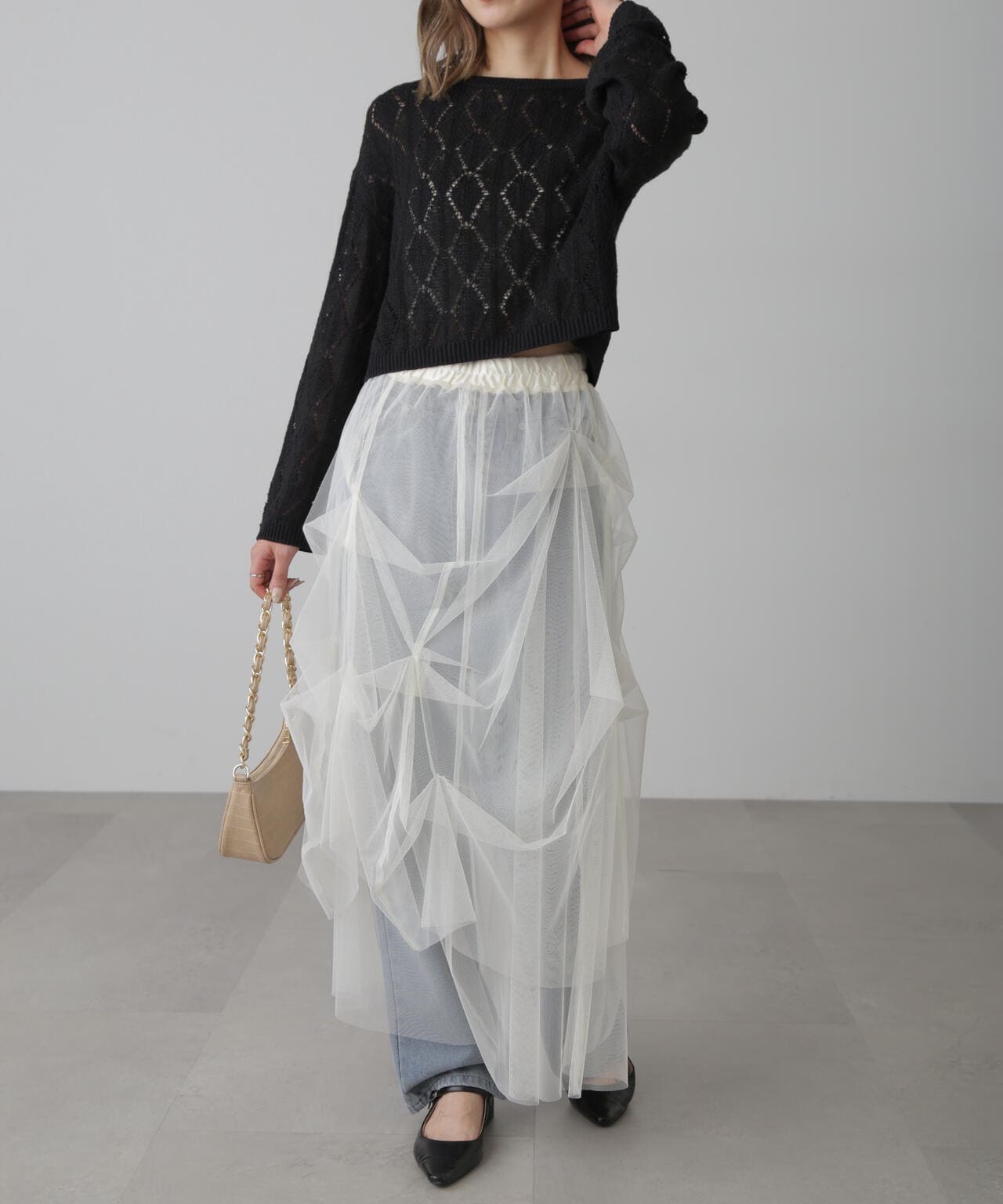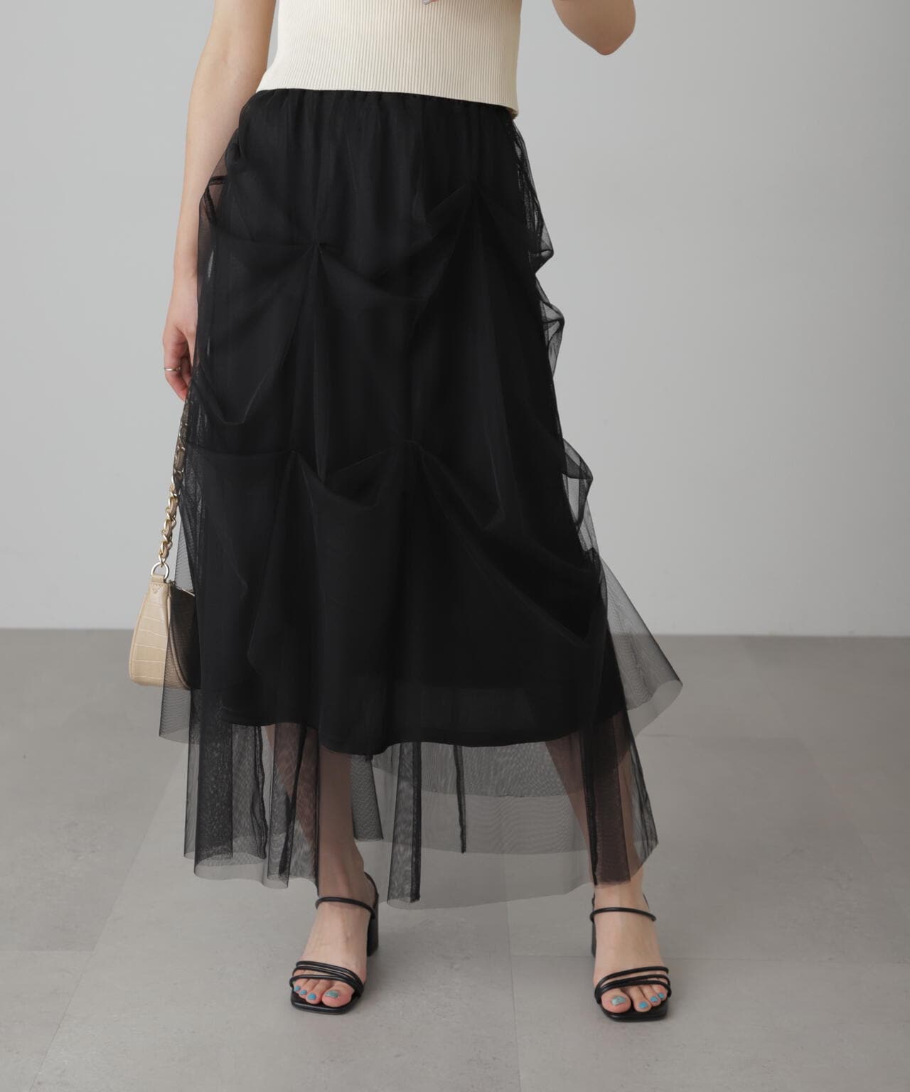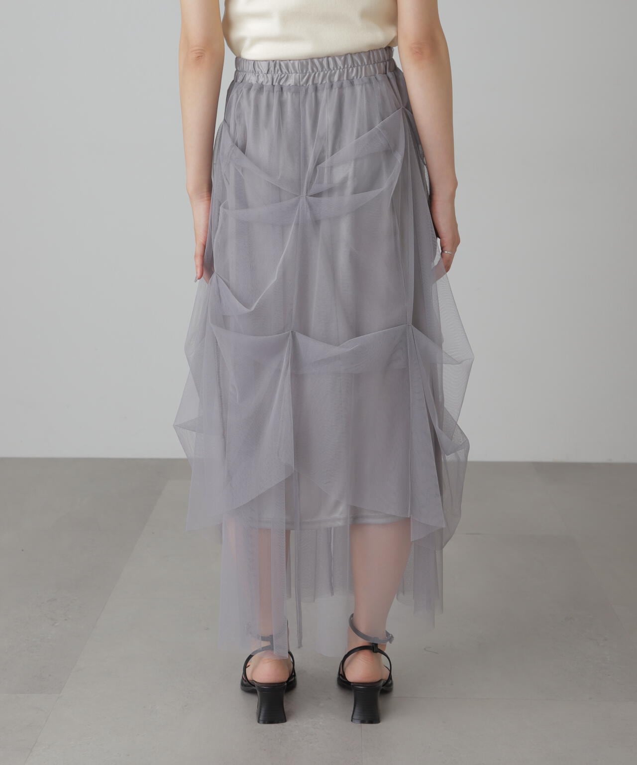 チュールを2枚仕立てにし、ランダム&イレギュラーにタックを入れたデコラティブなデザインスカート。別付けのペチコートが付いているので、透けの心配なく着用していただけます。裏地はペチコートになっているので、チュールを透けさせデニムパンツとレイヤードさせプリントTと合わせたカジュアルなスタイリングがおススメです。トップスを無地Tやタンクで、レディなシューズと合わせてきれいめスタイルにも合います。1枚で主役になってくれるキャッチーなデザインで、今季おススメのアイテムです。