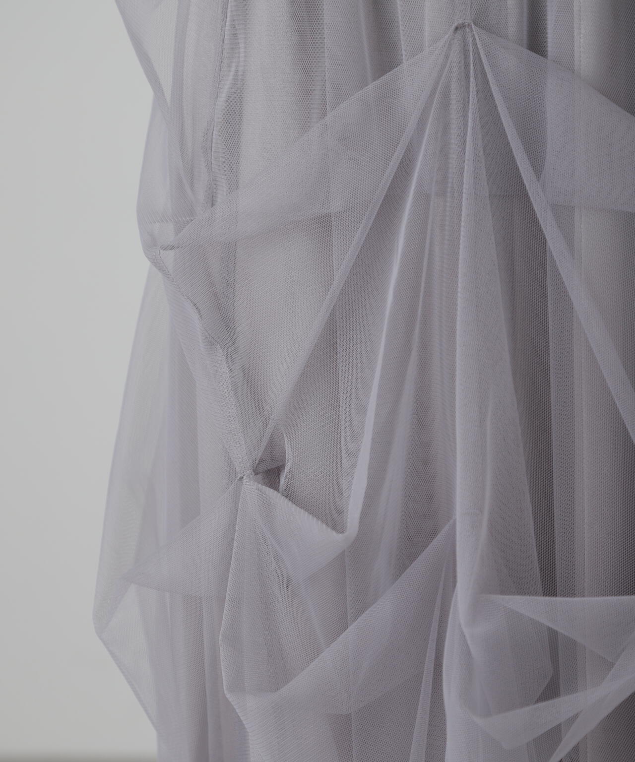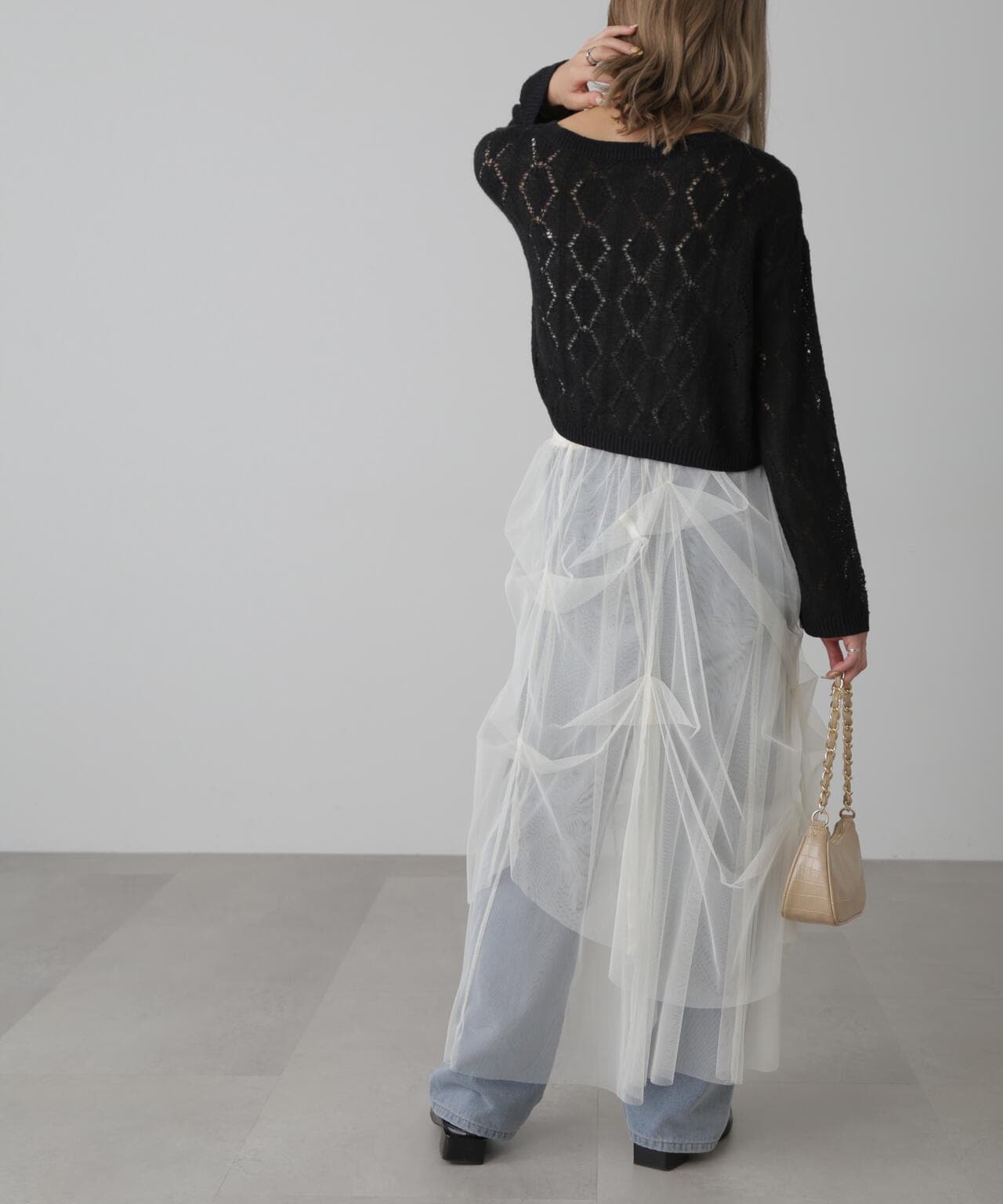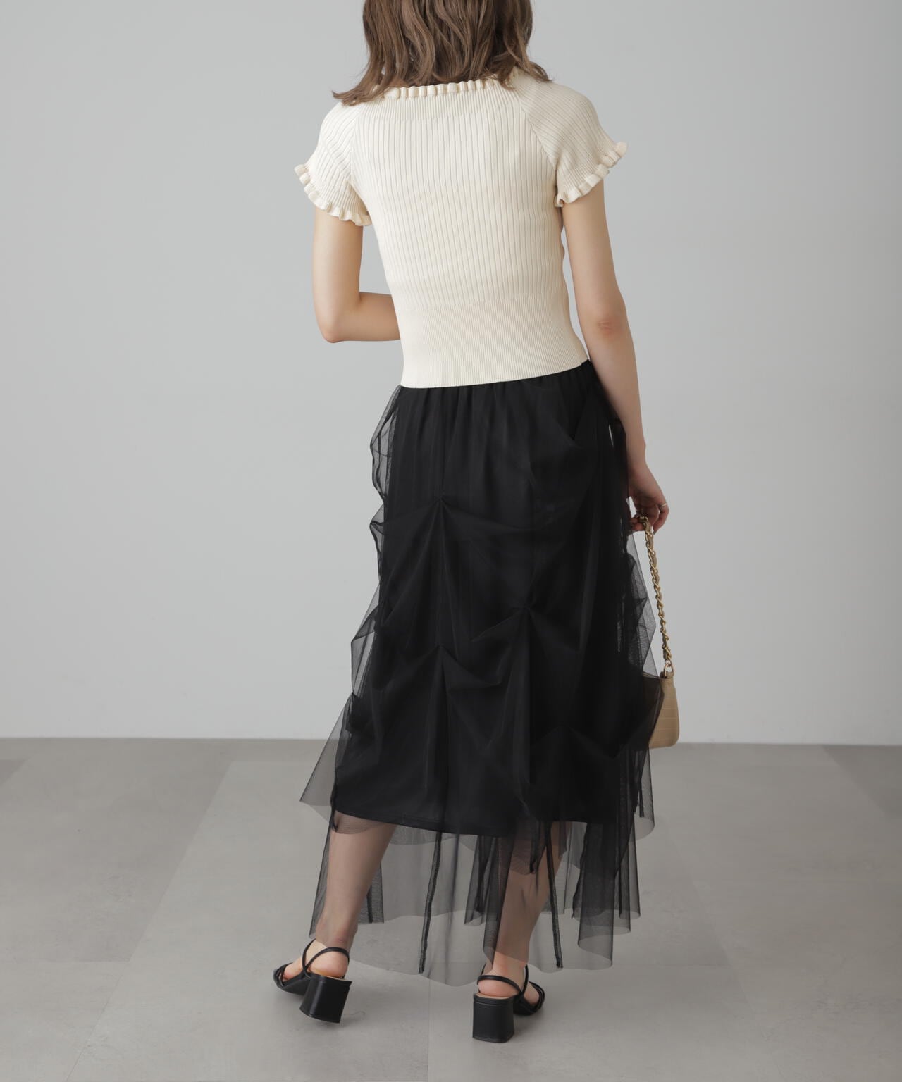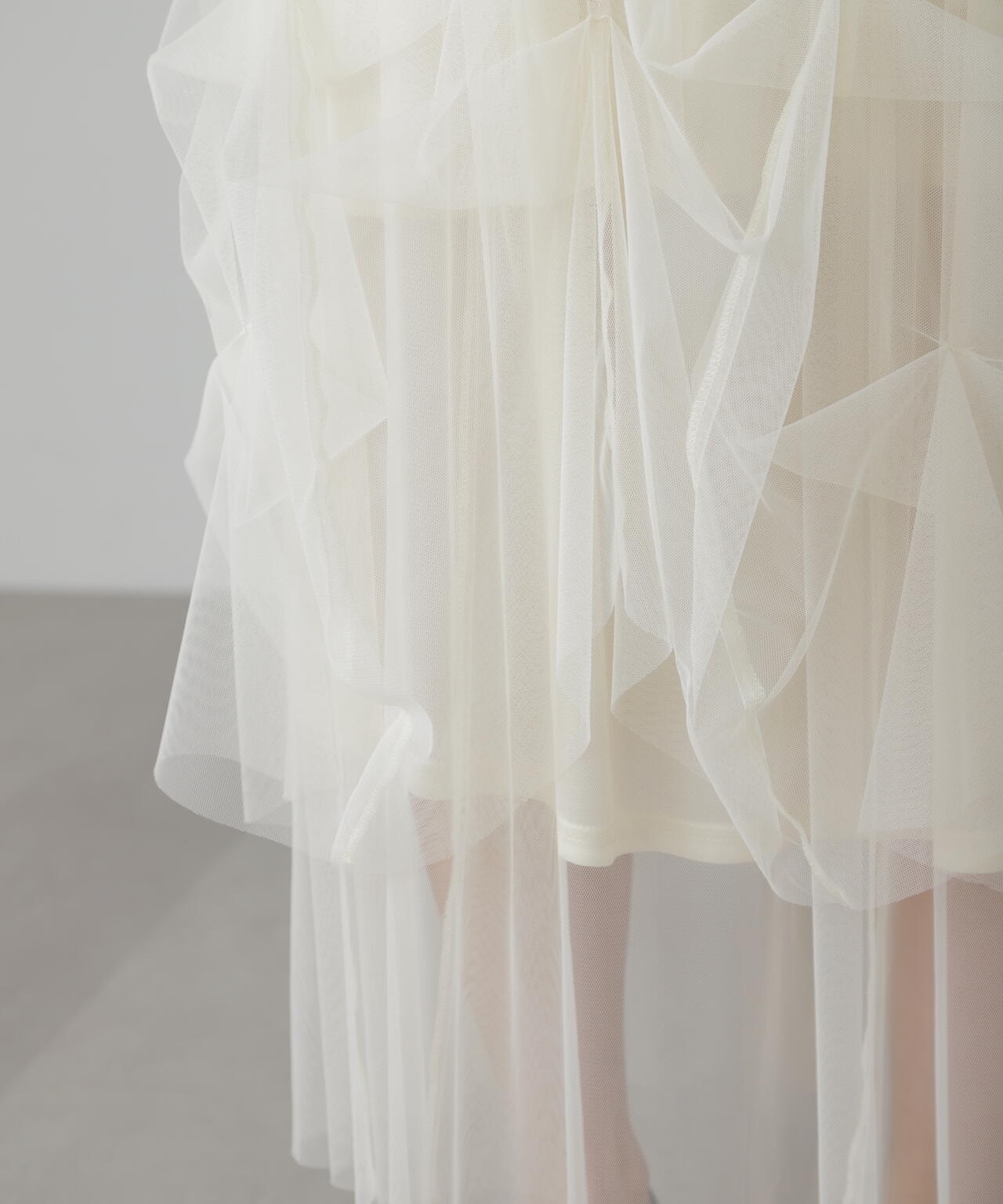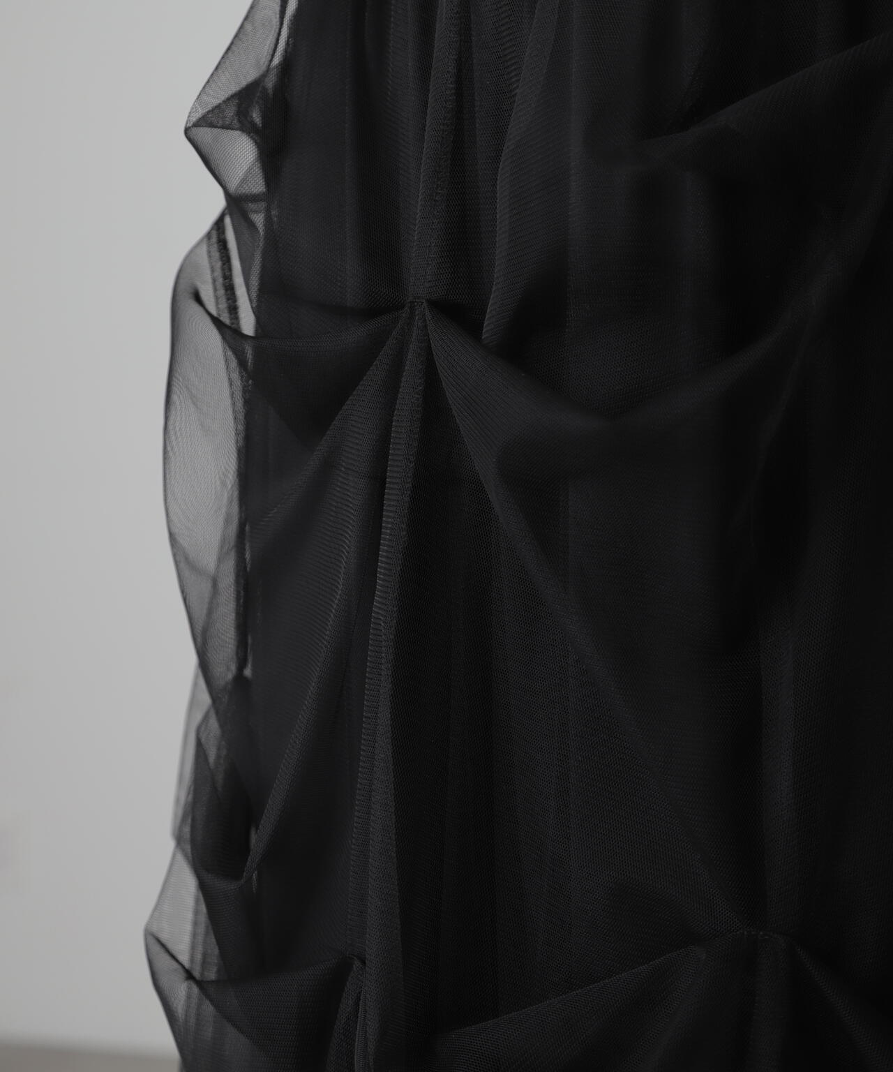 チュールを2枚仕立てにし、ランダム&イレギュラーにタックを入れたデコラティブなデザインスカート。別付けのペチコートが付いているので、透けの心配なく着用していただけます。裏地はペチコートになっているので、チュールを透けさせデニムパンツとレイヤードさせプリントTと合わせたカジュアルなスタイリングがおススメです。トップスを無地Tやタンクで、レディなシューズと合わせてきれいめスタイルにも合います。1枚で主役になってくれるキャッチーなデザインで、今季おススメのアイテムです。