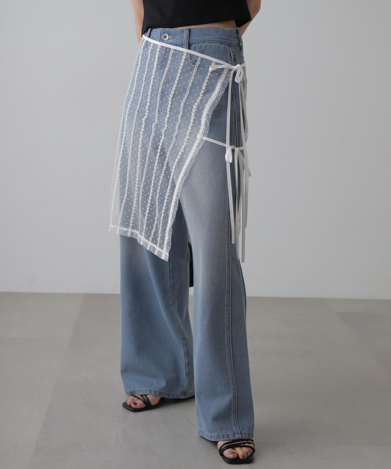 レイヤード用のレースラップスカート。ストライプ状に入っている、フロッキードットと刺しゅう柄がアクセントになり、シンプル過ぎないデザイン。ミドル丈なのでパンツと合わせるとバランス良く決まります。お持ちのデニムパンツやシンプルパンツと合わせれば、レース生地の透け感を楽しめます。いつものコーデにプラスワンするだけでトレンドが取り入れられる優れものです。