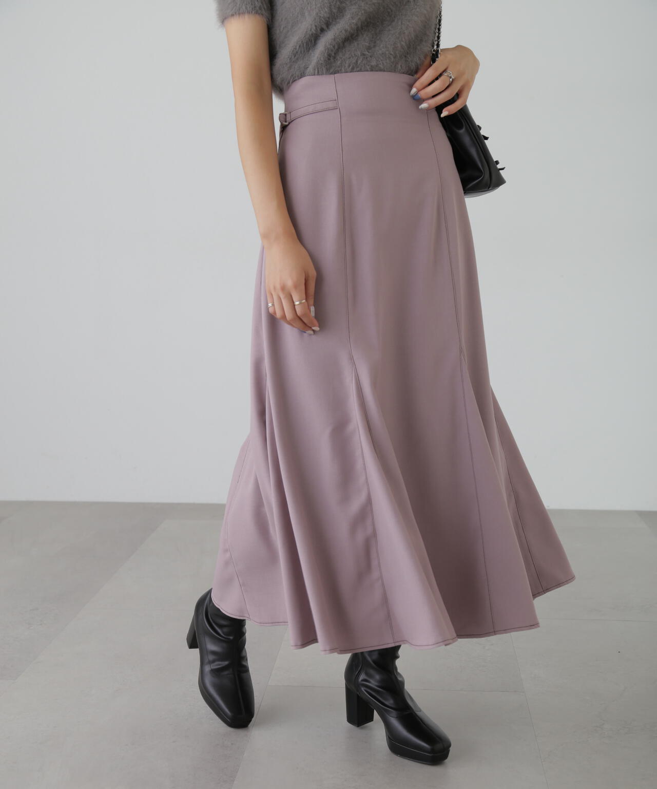 配色ステッチでメリハリ感を効かせたマーメイドスカート。さらっと落ち感のある生地なので穿き心地が良く、三角マチを挟み込み動きのあるフレアラインを演出してくれます。ハイウエスト設定なのでスタイルアップ見えが叶い、両サイドに施したWDカンの共地ベルトがポイント。ベーシックニットやショート丈ニットとのスタイリングもおススメです。