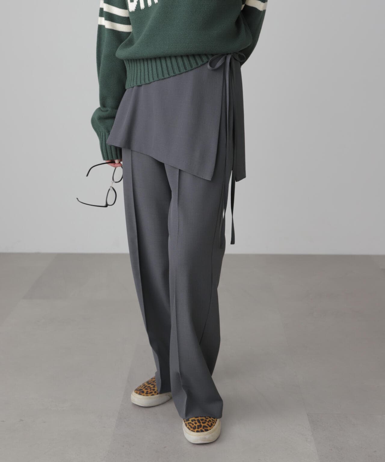 ラップデザインのミニスカートとパンツをドッキングしたレイヤードスタイルのパンツ。ストレートフレア型で、スタイルアップして見えるようセンタープレスを入れています。ややとろみのある中肉合繊生地を使用。きれいな目面でミニスカートと2枚仕立てですが、重くなり過ぎずに着られます。着こなしはフロントジップニットやデザインカットソーと合わせて、Y2Kスタイルにも。スウェットやニット合わせでカジュアルスタイルにもおススメです。