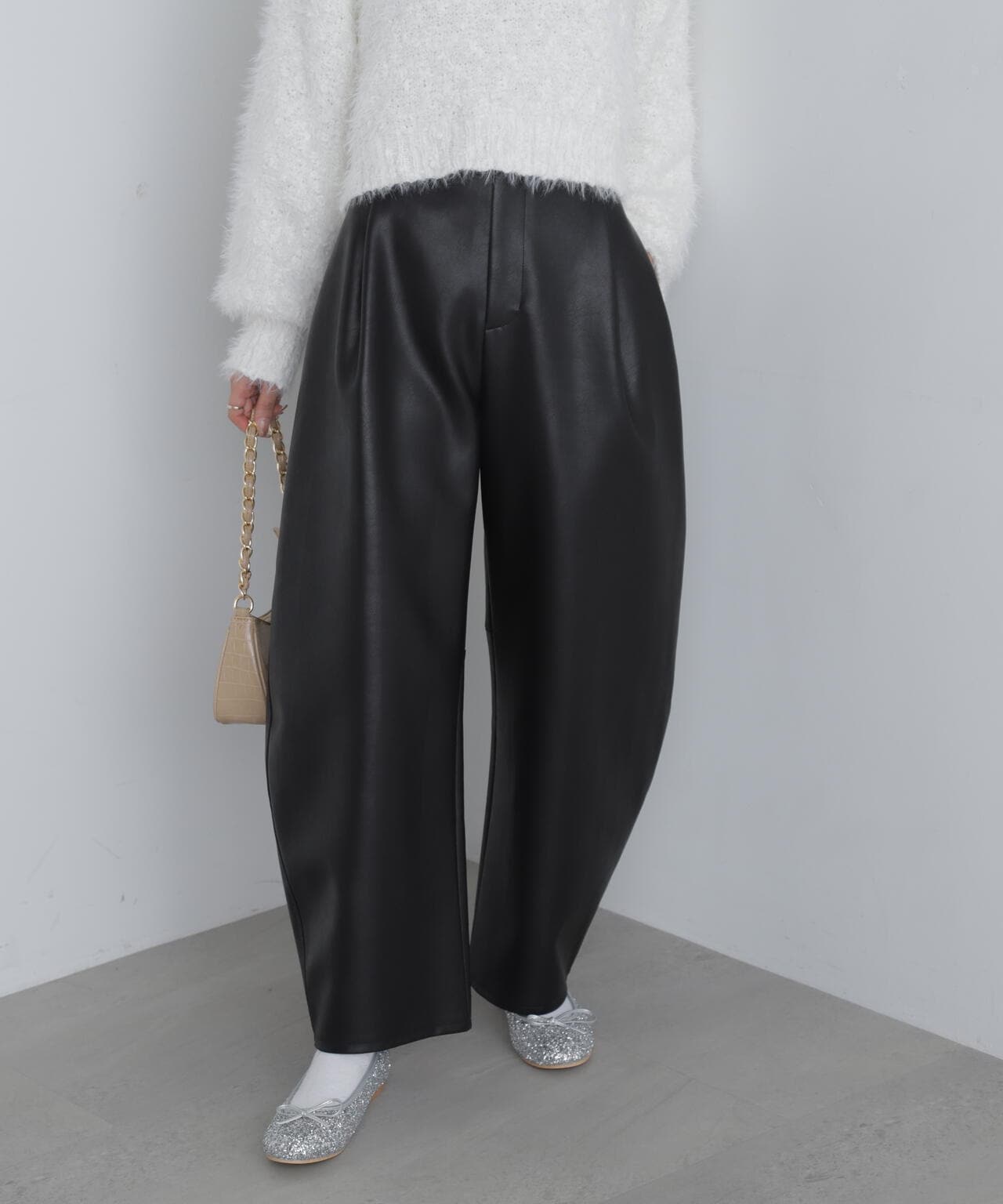 人気のカーヴィーパンツを秋冬らしい合皮素材に落とし込んだ1本。柔らかさはありますが、カーヴィーラインがヘタレたり、へこんだりしないよう、コシのある合皮にし、脇は折り伏せにしてステッチデザインを入れています。前ボタンは同色染めのドット釦でシンプルに。フロントにタックを入れることで、横から見た時のフォルムを立体的にし、腰まわりはボリュームを持たせて、ウエストが細く見えるように仕上げています。冬はニットと相性がよく、春と秋はシャツやカットソーを合わせれば3シーズン楽しめます。